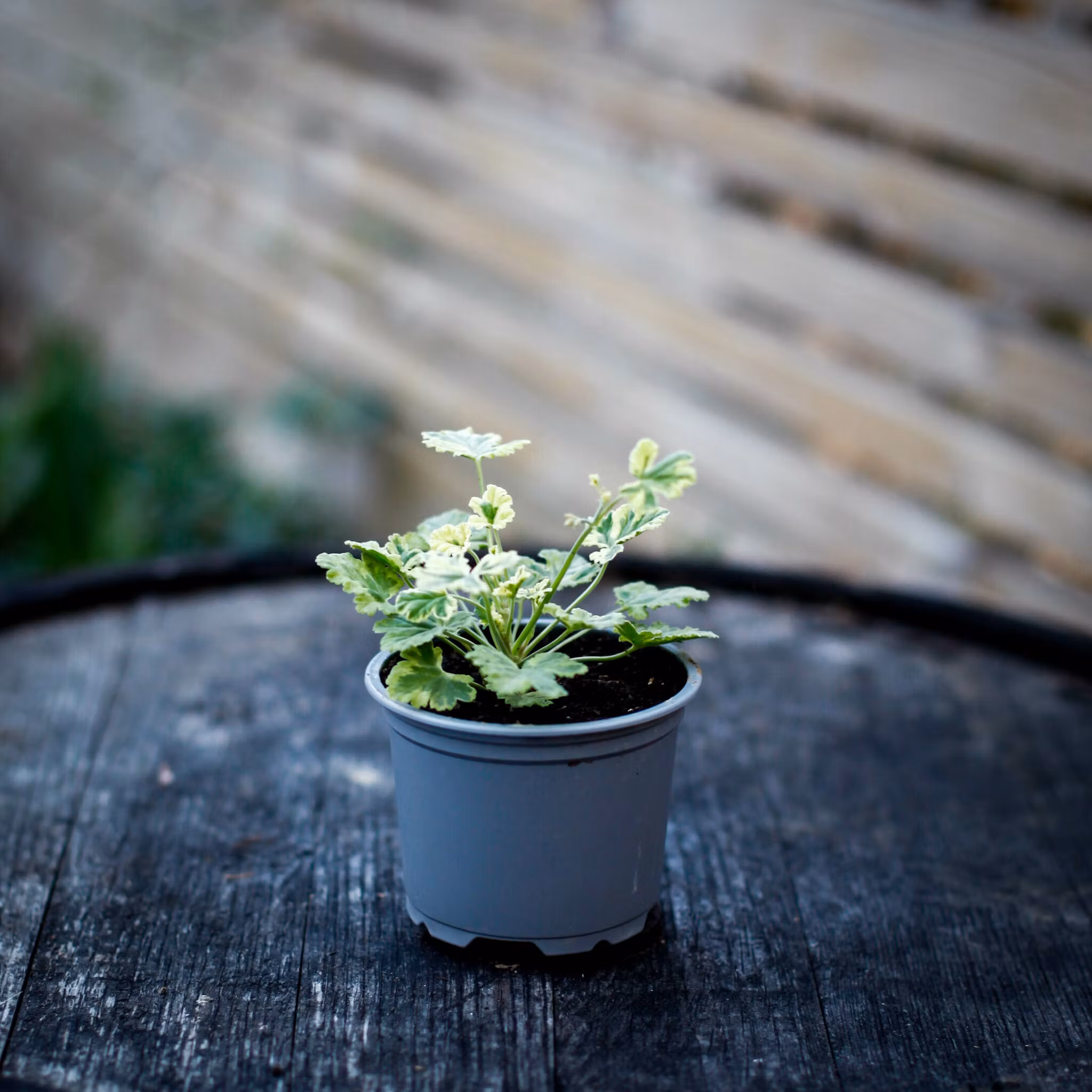 Upptäck Pelargonium 'Fragrans Variegated'! 8cm Med sina variegerade blad och kryddiga doft är denna doftpelargon en förtrollande tillägg till alla hem. 🌿