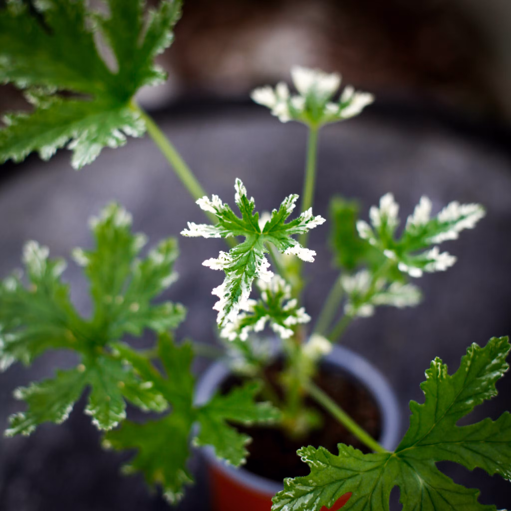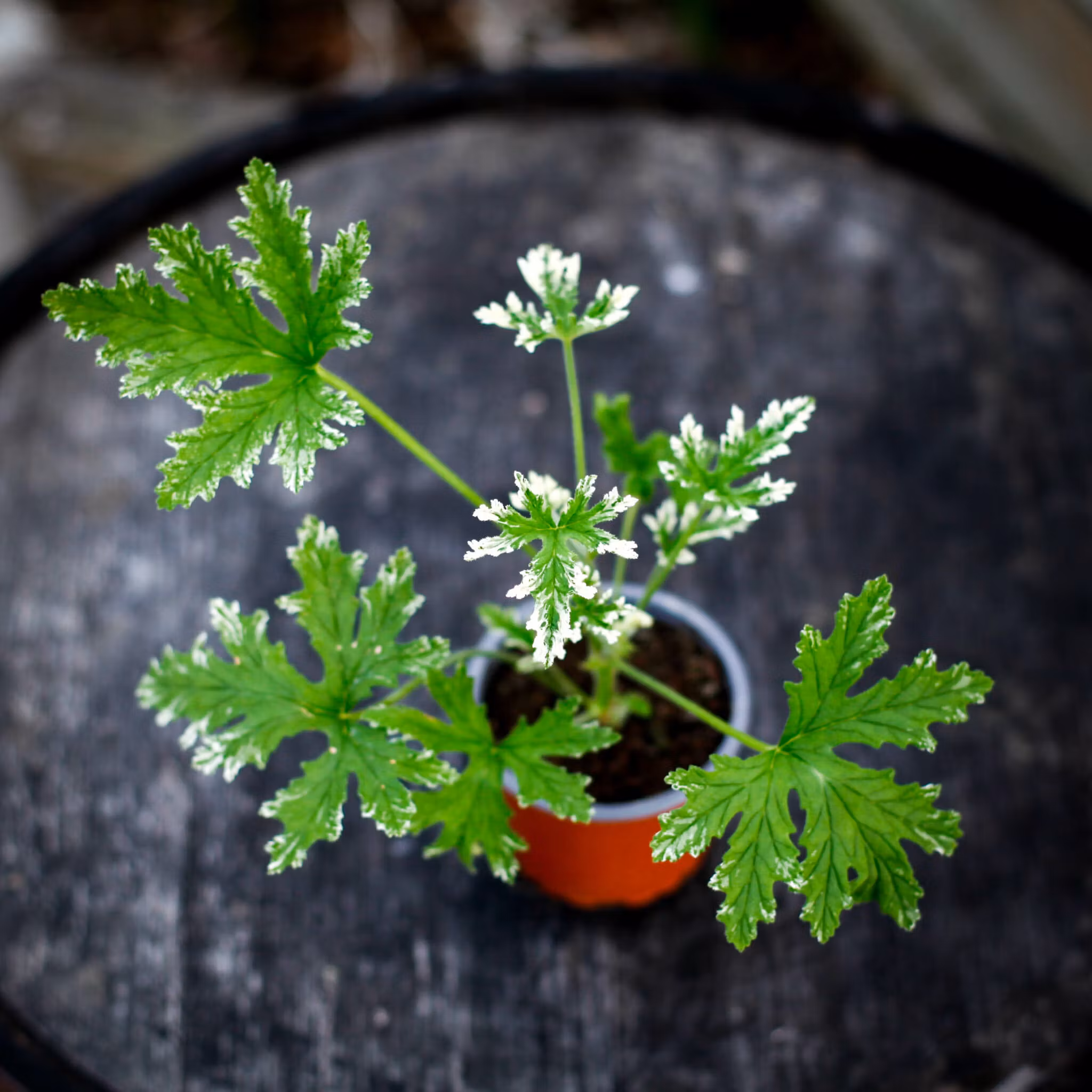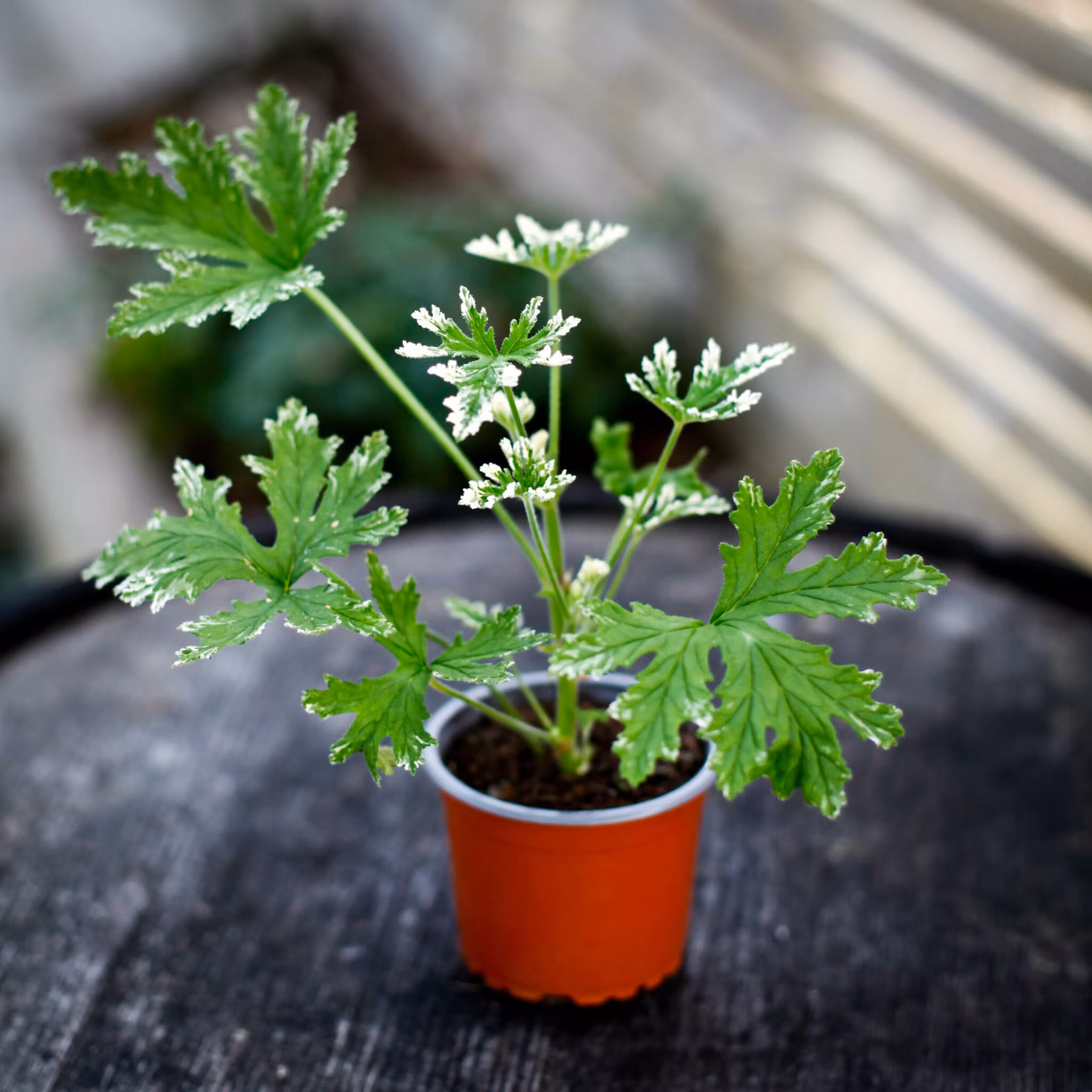 Pelargonium 'Fragrant Frosty' 8cm, är en doftpelargon med unika flikade blad och frostad kant. Blommar sparsamt med citrusdoft. Perfekt för soliga fönster.