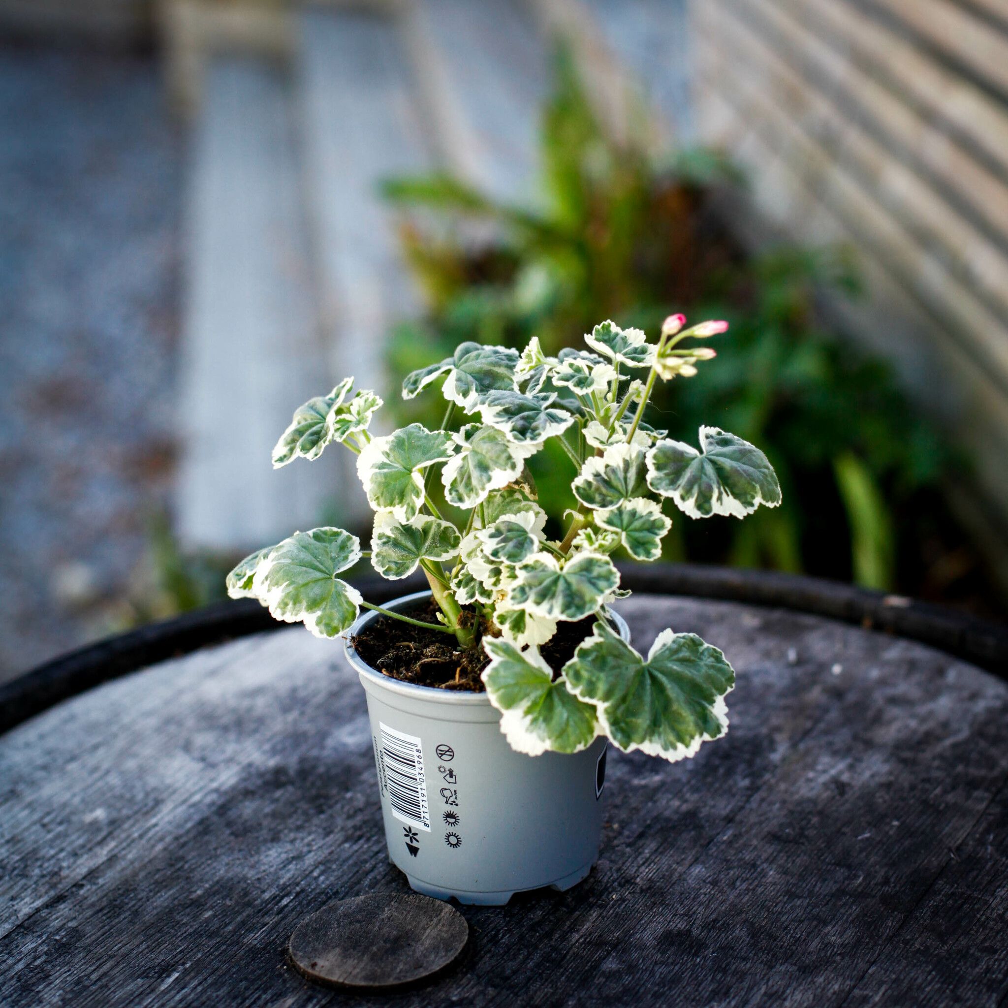 Pelargonium 'Frank Headley' - Zonalpelargon med tvåfärgade blad och laxrosa blommor. Perfekt för soliga platser och krukor. Köp hos Klorofyllverket!