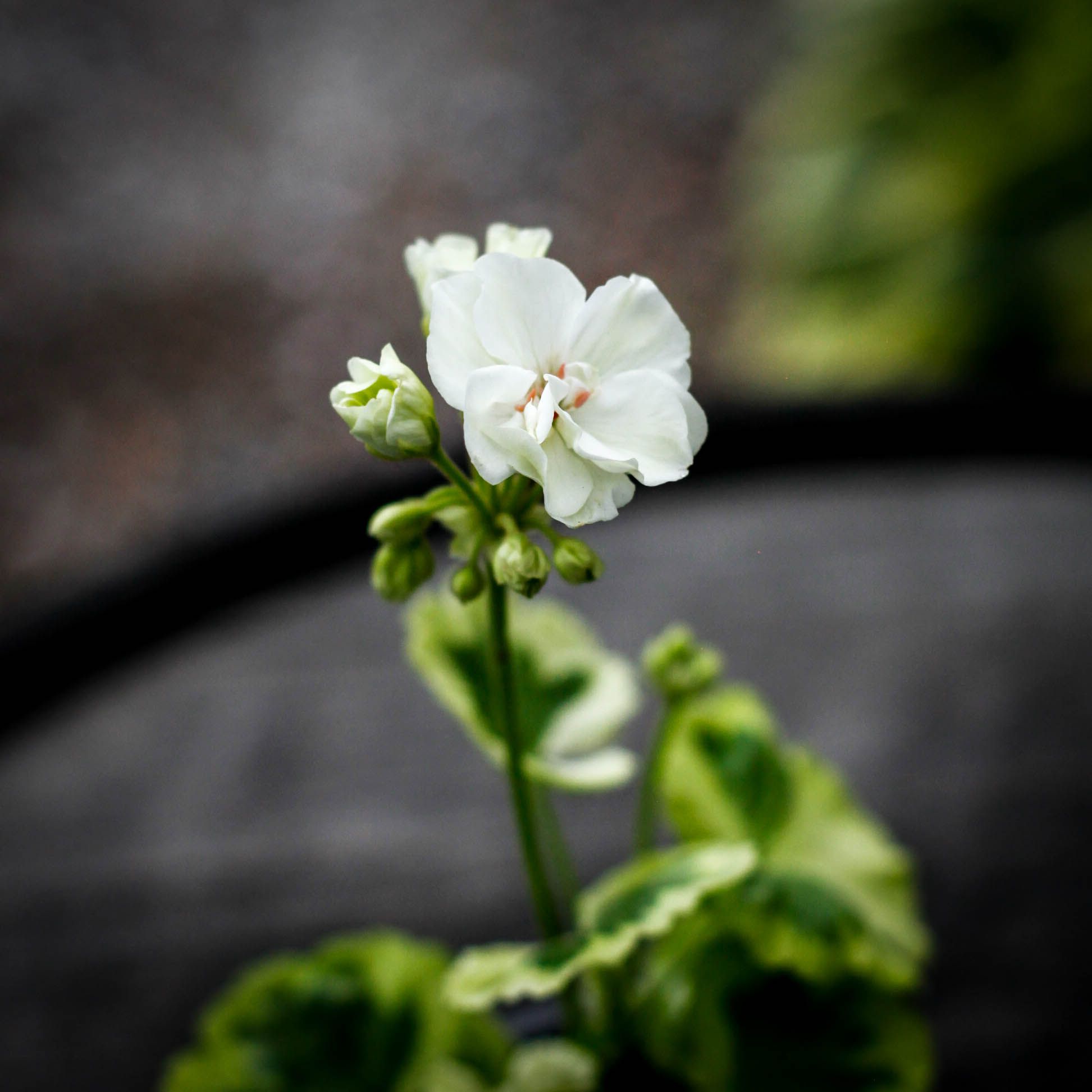 Pelargonium 'Ivory Snow' är en elegant zonalpelargon med vita blommor och brokiga bladverk. Perfekt för krukor, den trivs i sol och halvskugga.