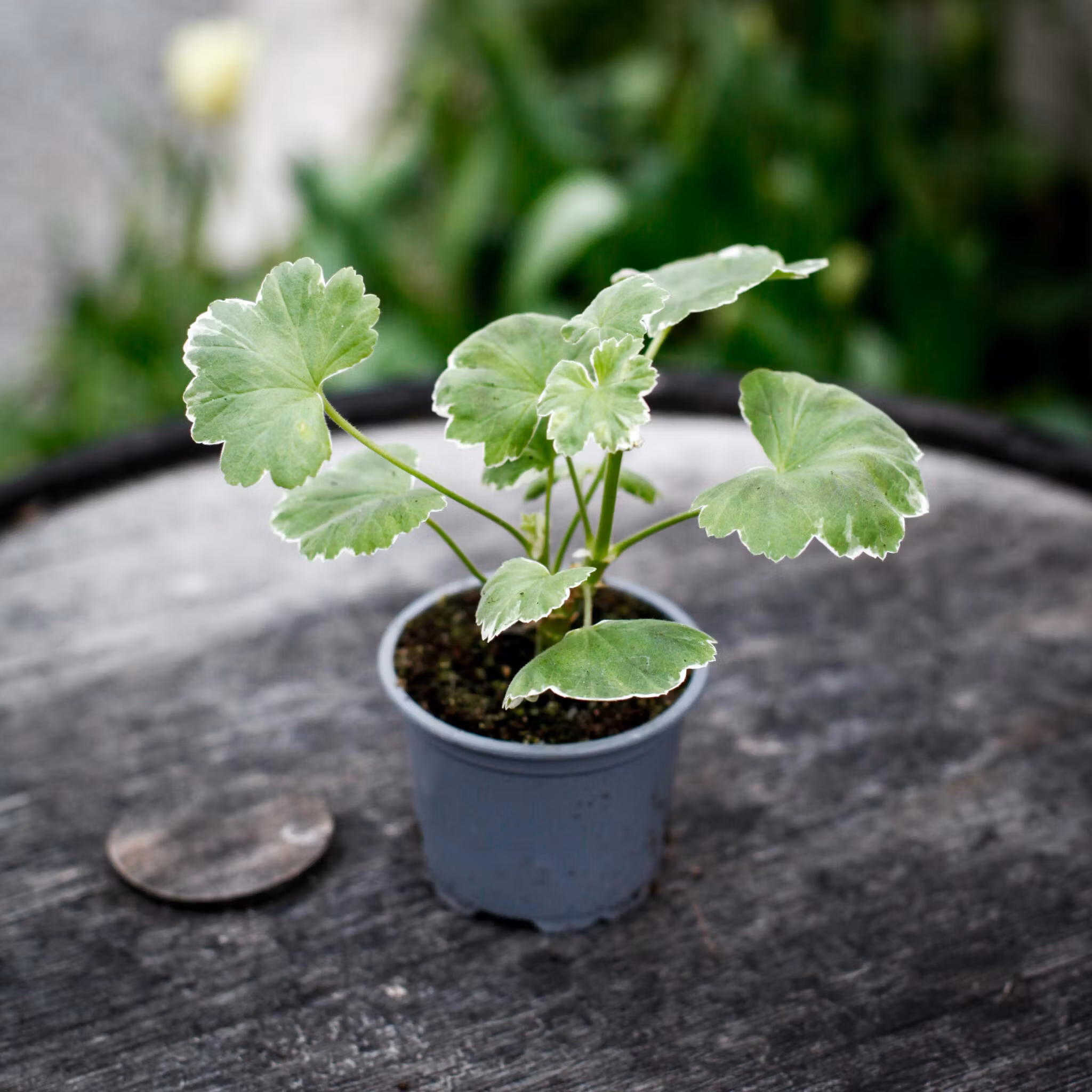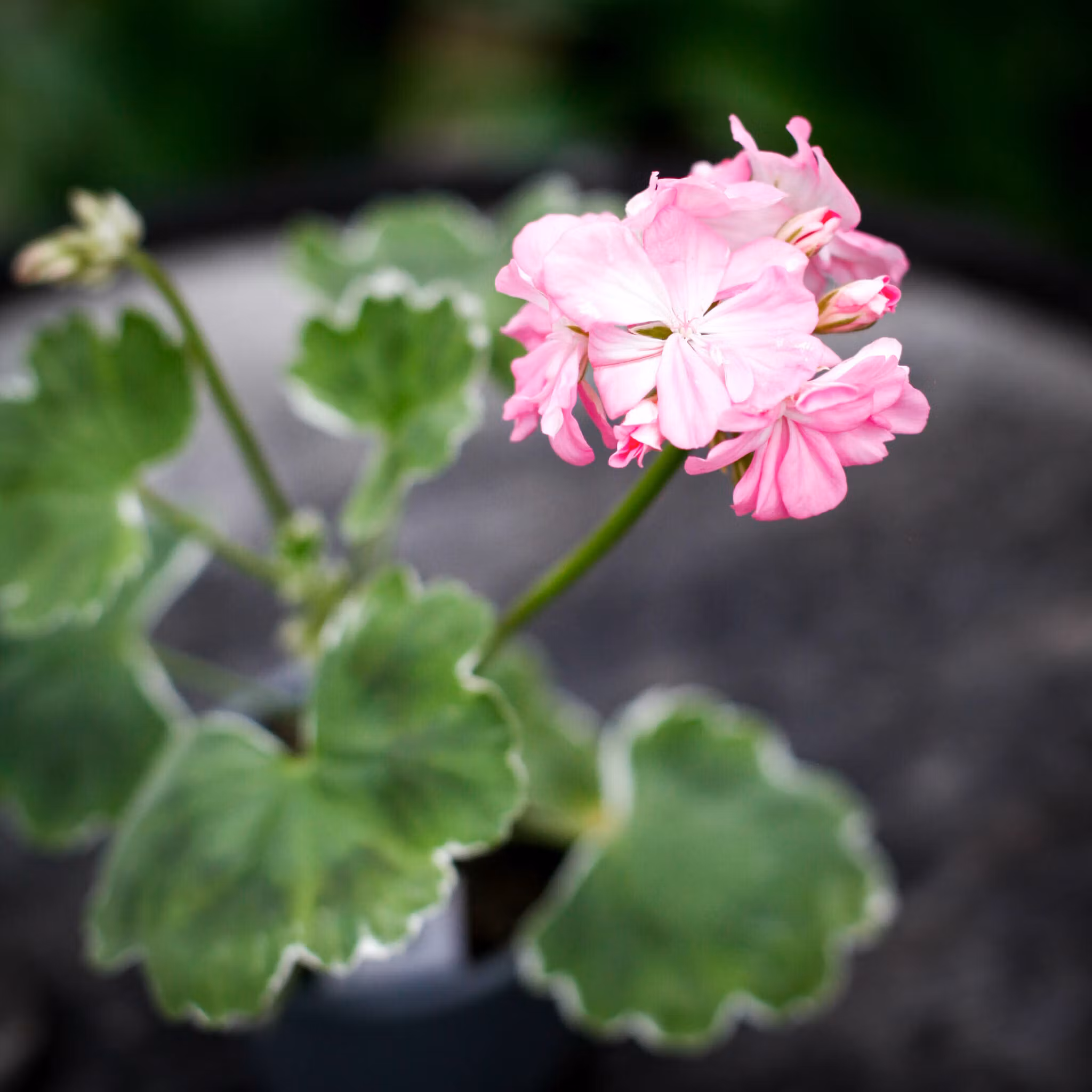 Pelargonium 'Kaisa Kallio' - En charmig zonalpelargon med mjukt rosa blommor och gröna blad med vita kanter. Perfekt för kruka eller rabatt.