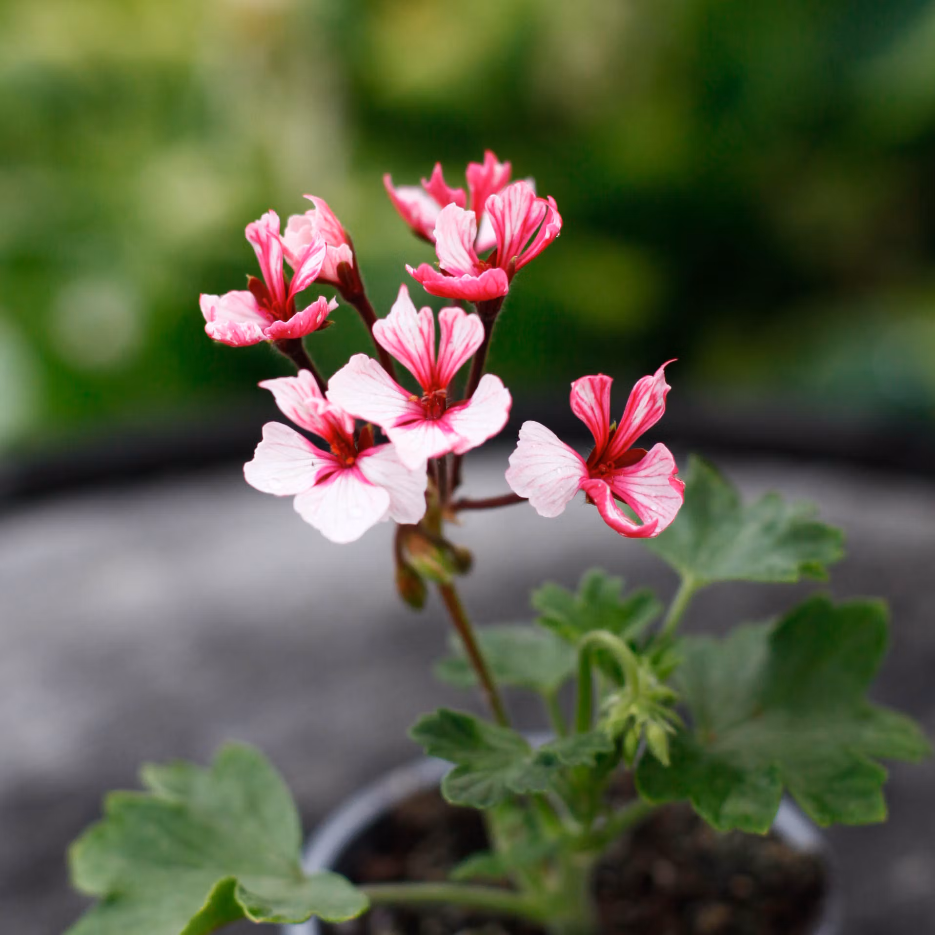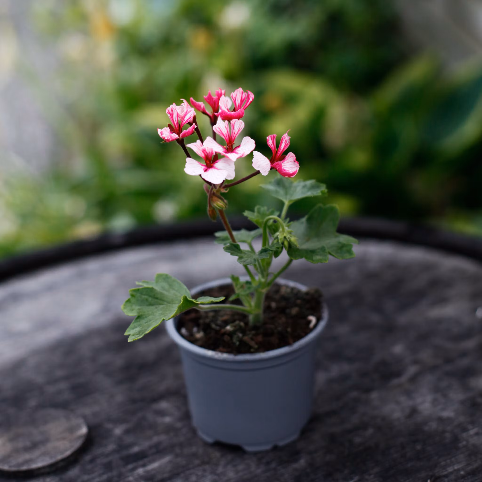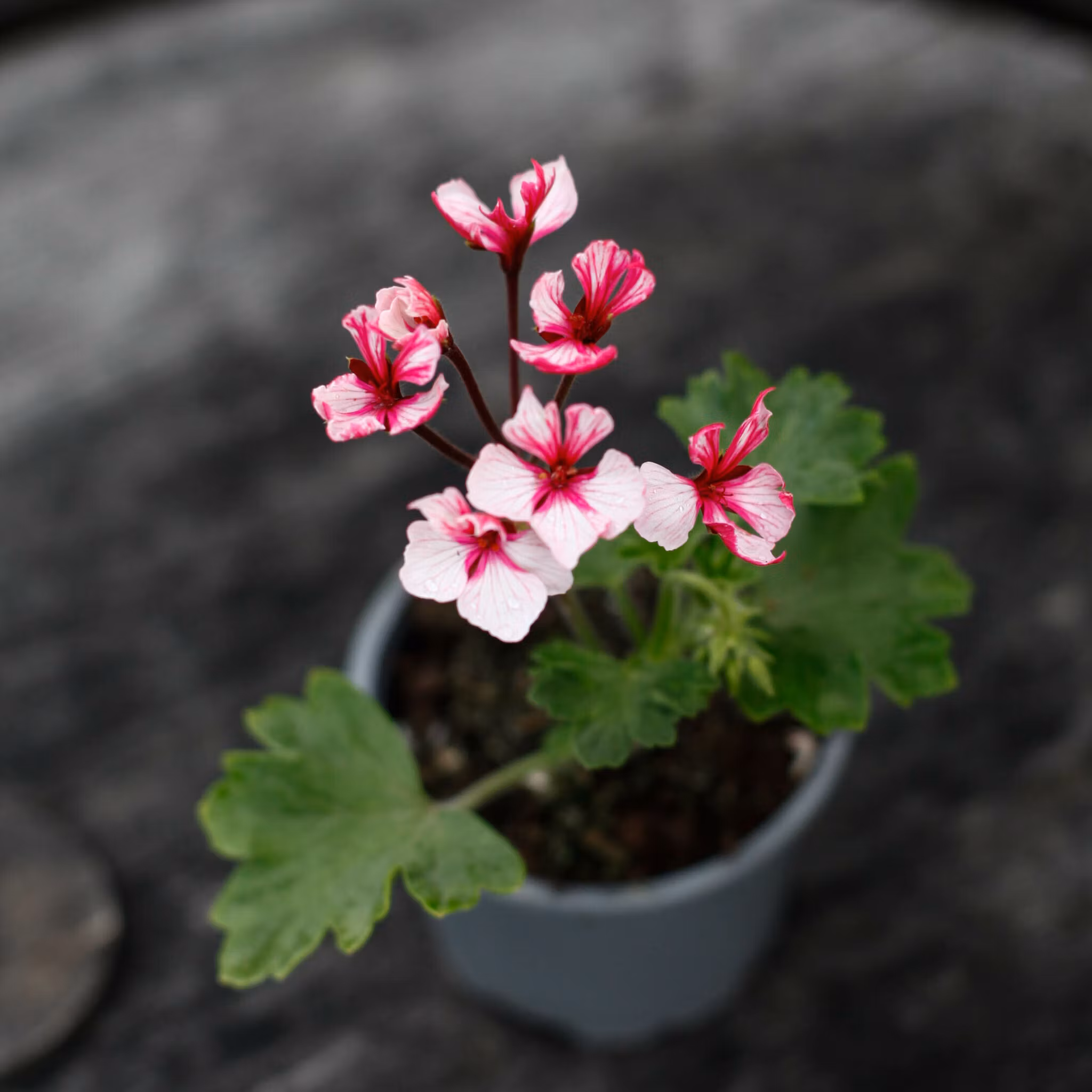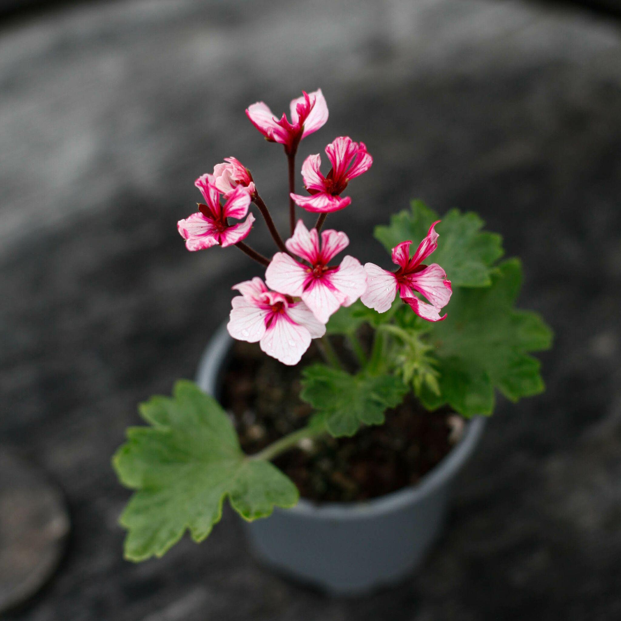 Pelargonium 'Kelette' - StjärnpelargonUpptäck Pelargonium 'Kelette', en unik stjärnpelargon med vit-rosa blommor och ceriserosa strimmor. Perfekt för krukor och