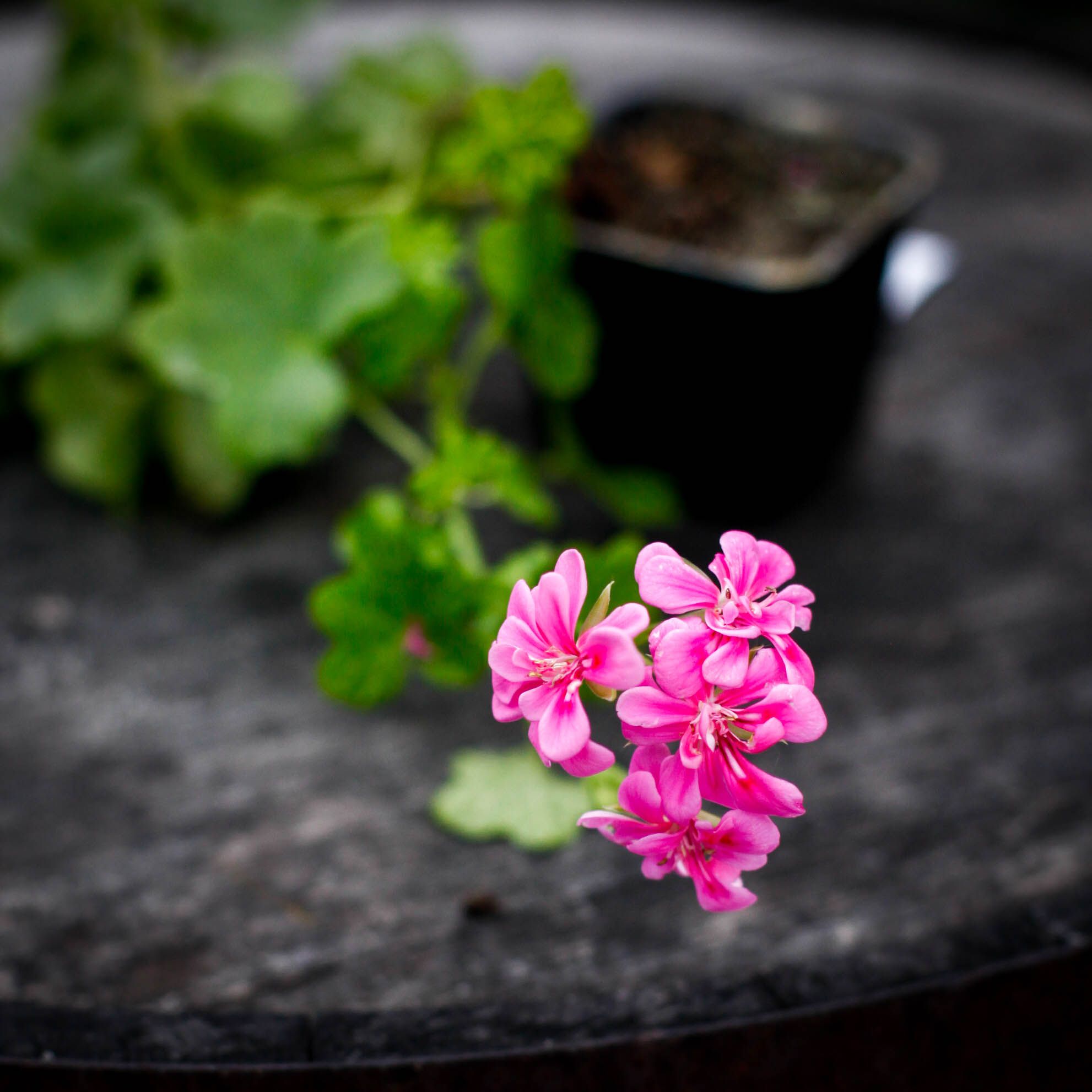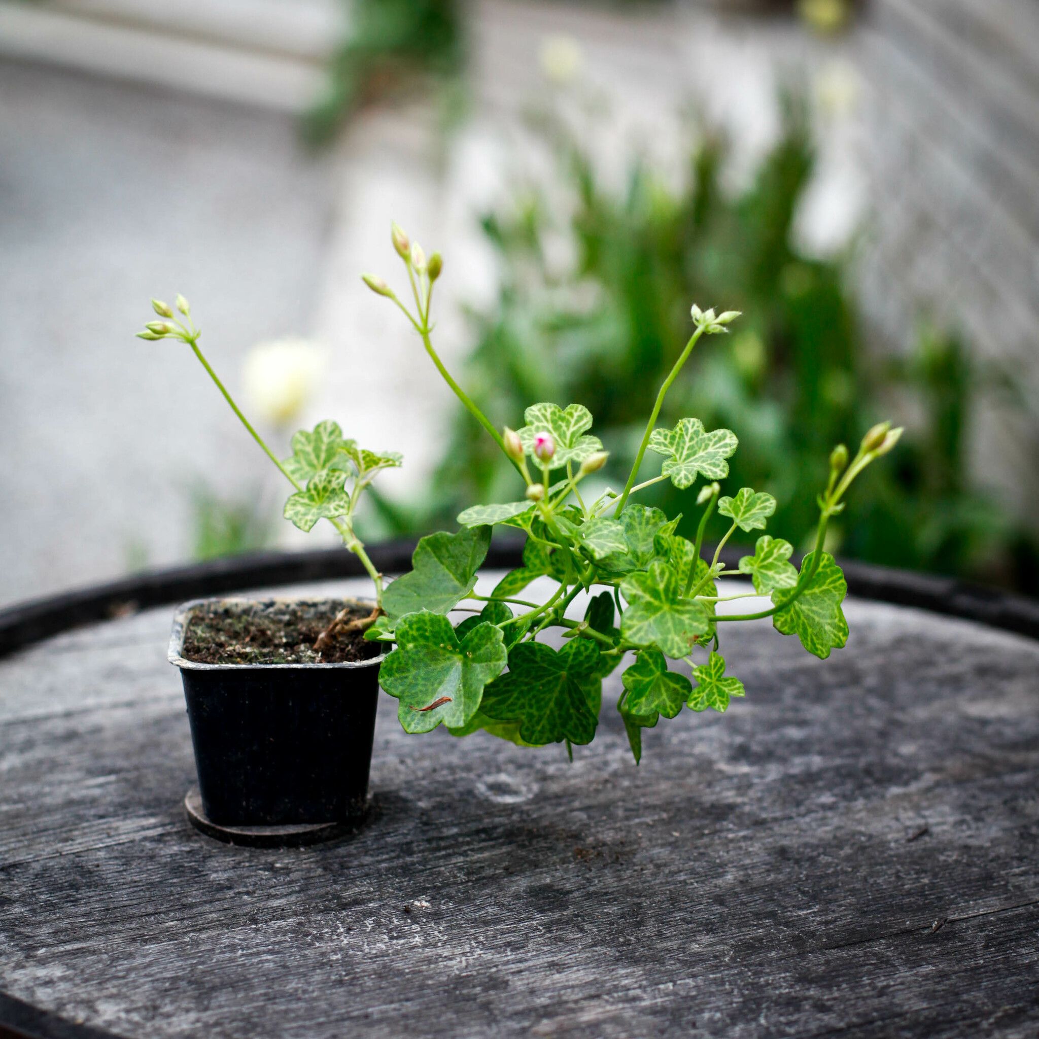 Pelargonium 'Laced Sugar Baby' - En romantisk miniatyrpelargon med rosa blommor och marmorerade blad, perfekt för ampel och små utrymmen.