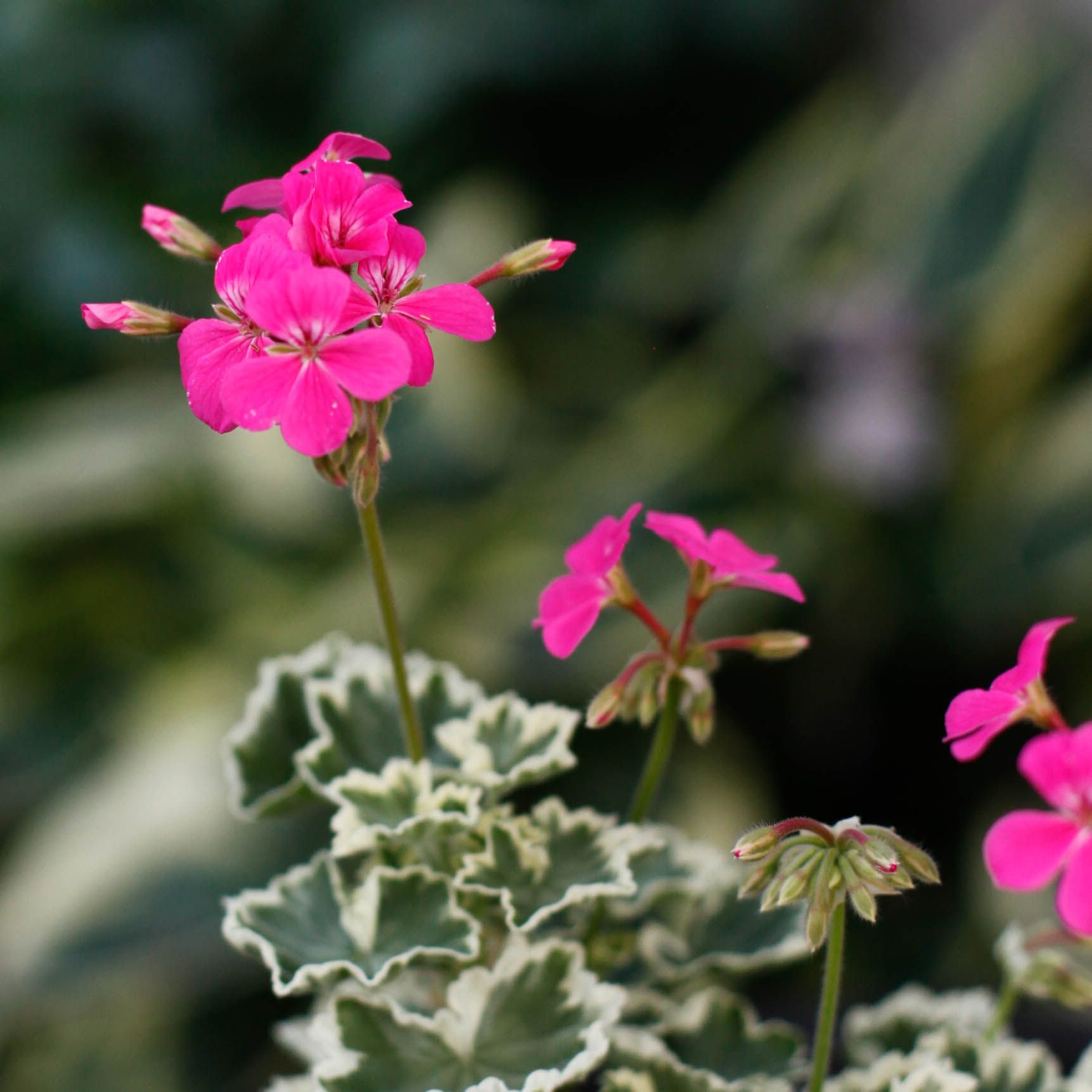 Blommorna är enkla och klart ceriserosa med ett ljusare öga i mitten, vilket skapar en vacker kontrast mot det brokiga bladverket. De enkla blommorna gör dessutom sorten relativt regntålig, vilket är ett plus för utomhusodling. Under gynnsamma förhållanden kan en liten stickling på bara en sommar utvecklas till en tät, rund boll fylld av färgstarka blommor.