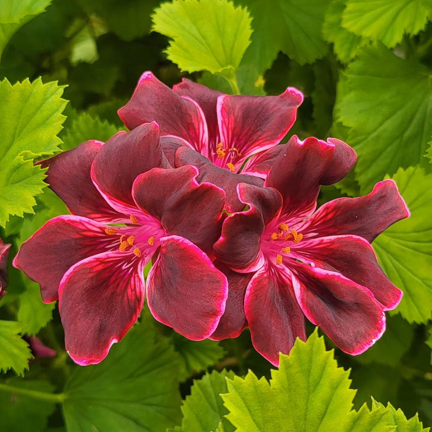Pelargonium 'Lord Bute' – en klassisk engelsk pelargon med mörkt lilabruna blommor och ljus kant. Perfekt för både krukor och rabatter. Köp hos Klorofyllverket.