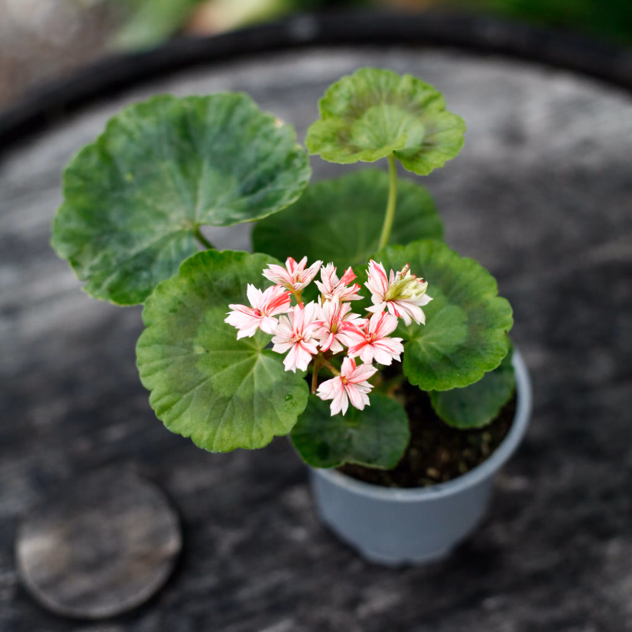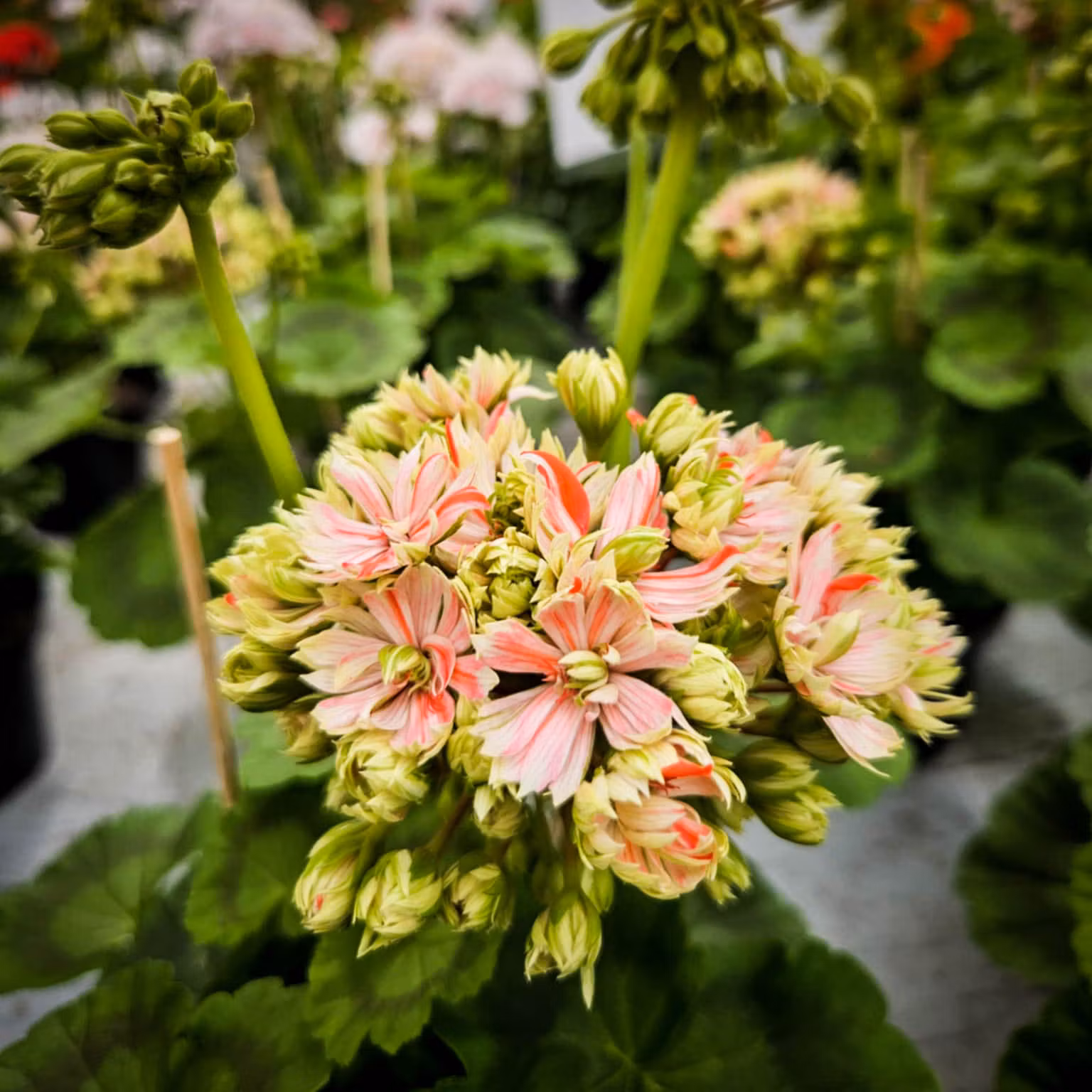 Pelargonium 'Mallorca' är en unik zonalpelargon som utmärker sig med sina flikiga, halvdubbla blommor i en ovanlig färgpalett. Kronbladen visar en levande blandning av vitt, limegrönt, orange och röda toner – vilket skapar ett nästan flammande intryck.