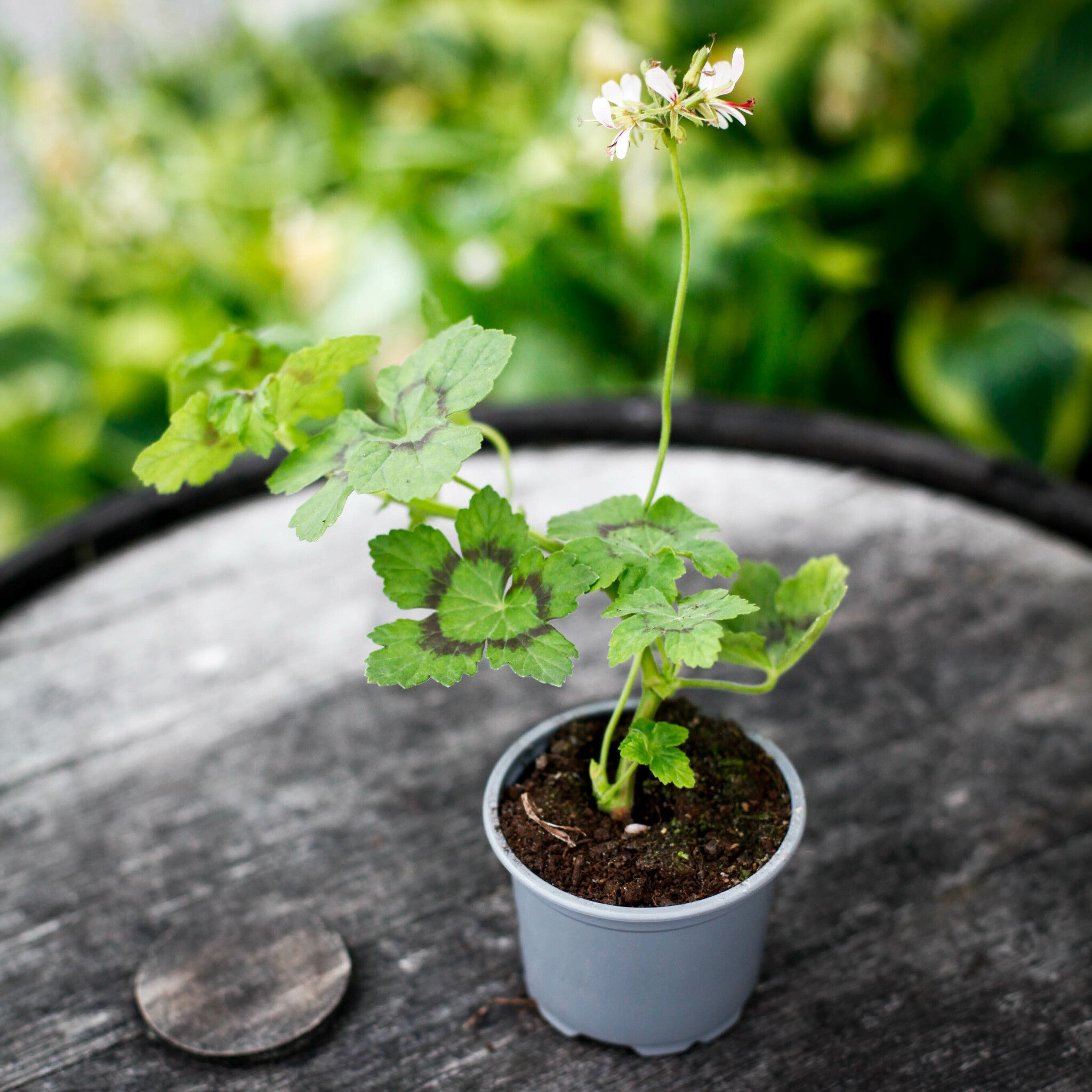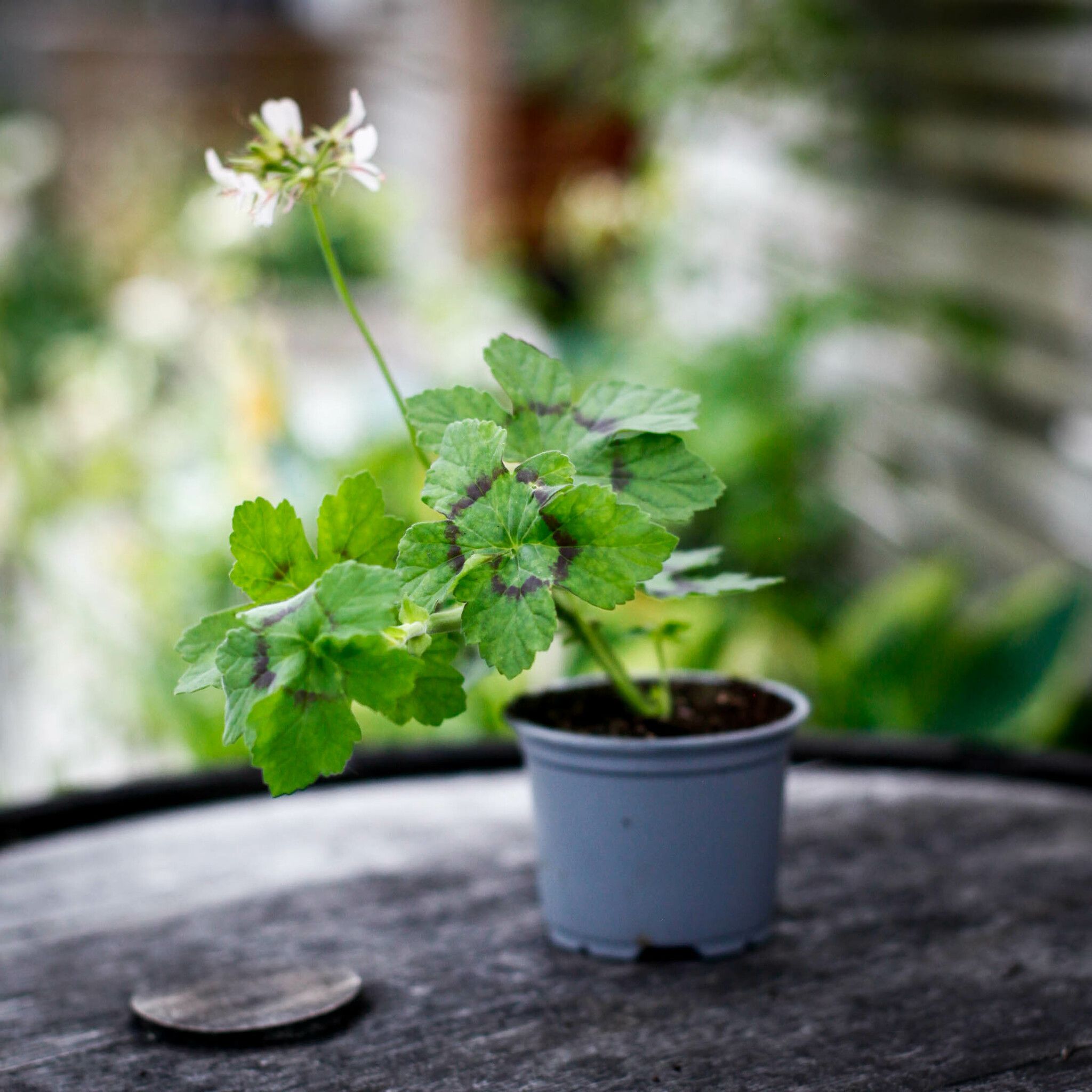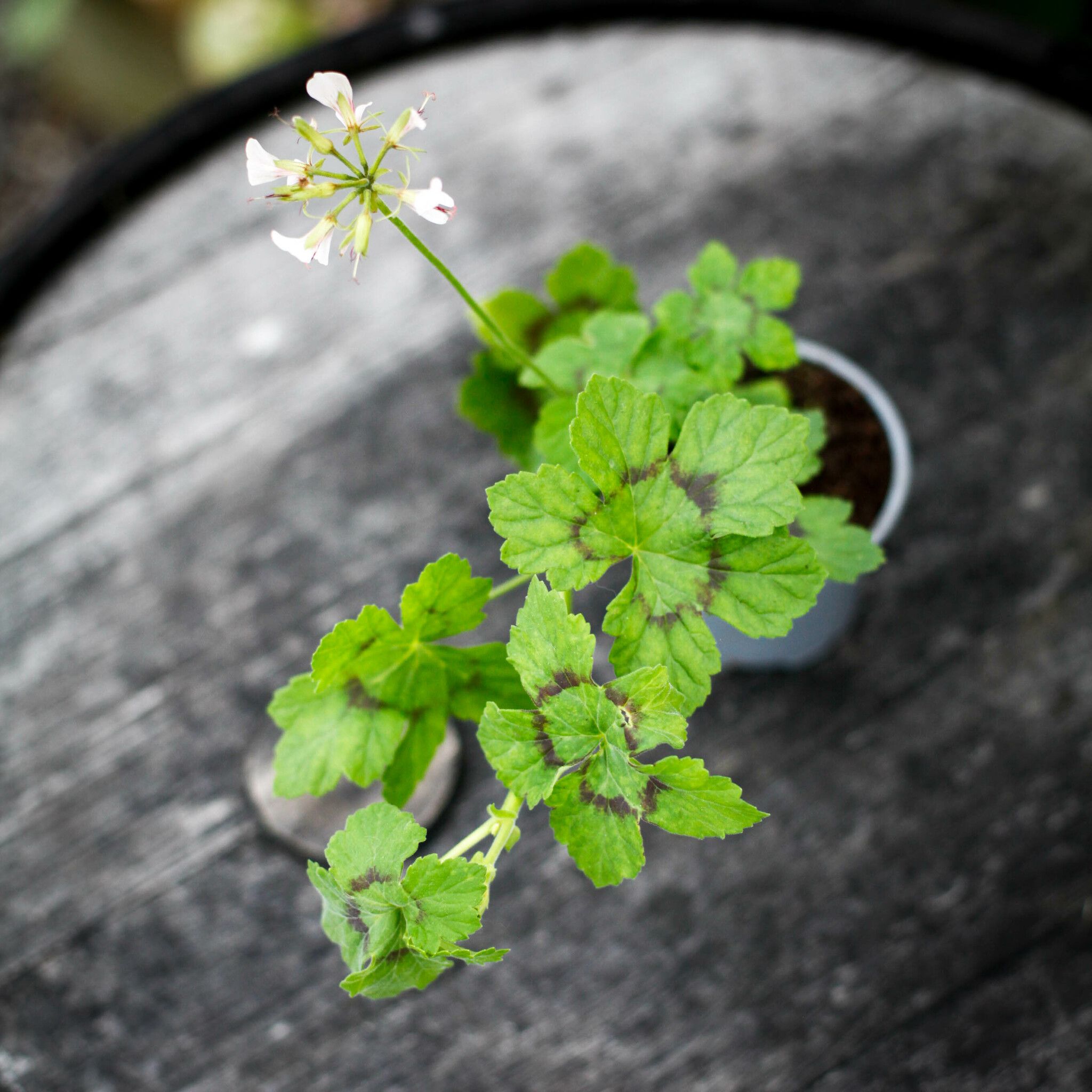 Pelargonium mutans, en sällsynt vildpelargon med ljust gul-vita blommor och aromatiska blad. Perfekt för ampel eller urna, lättskött och samlarvänlig.