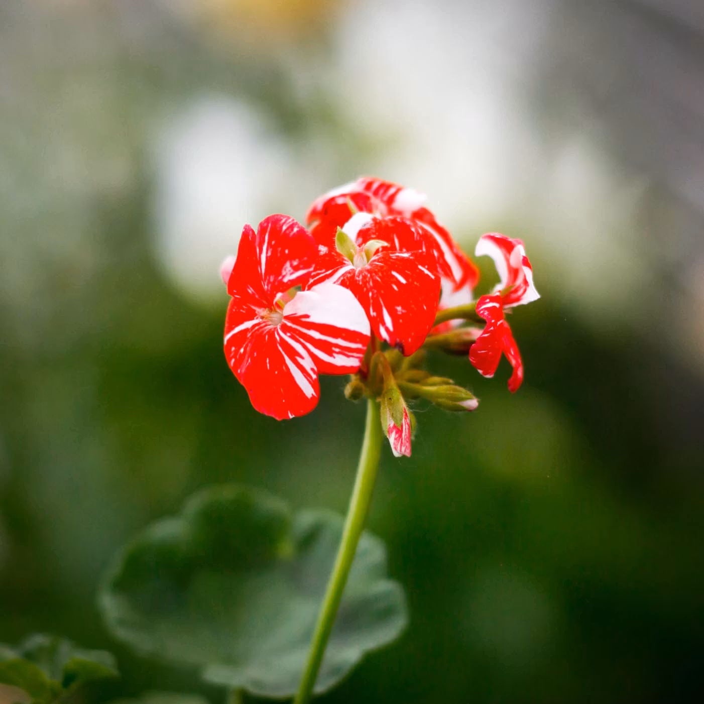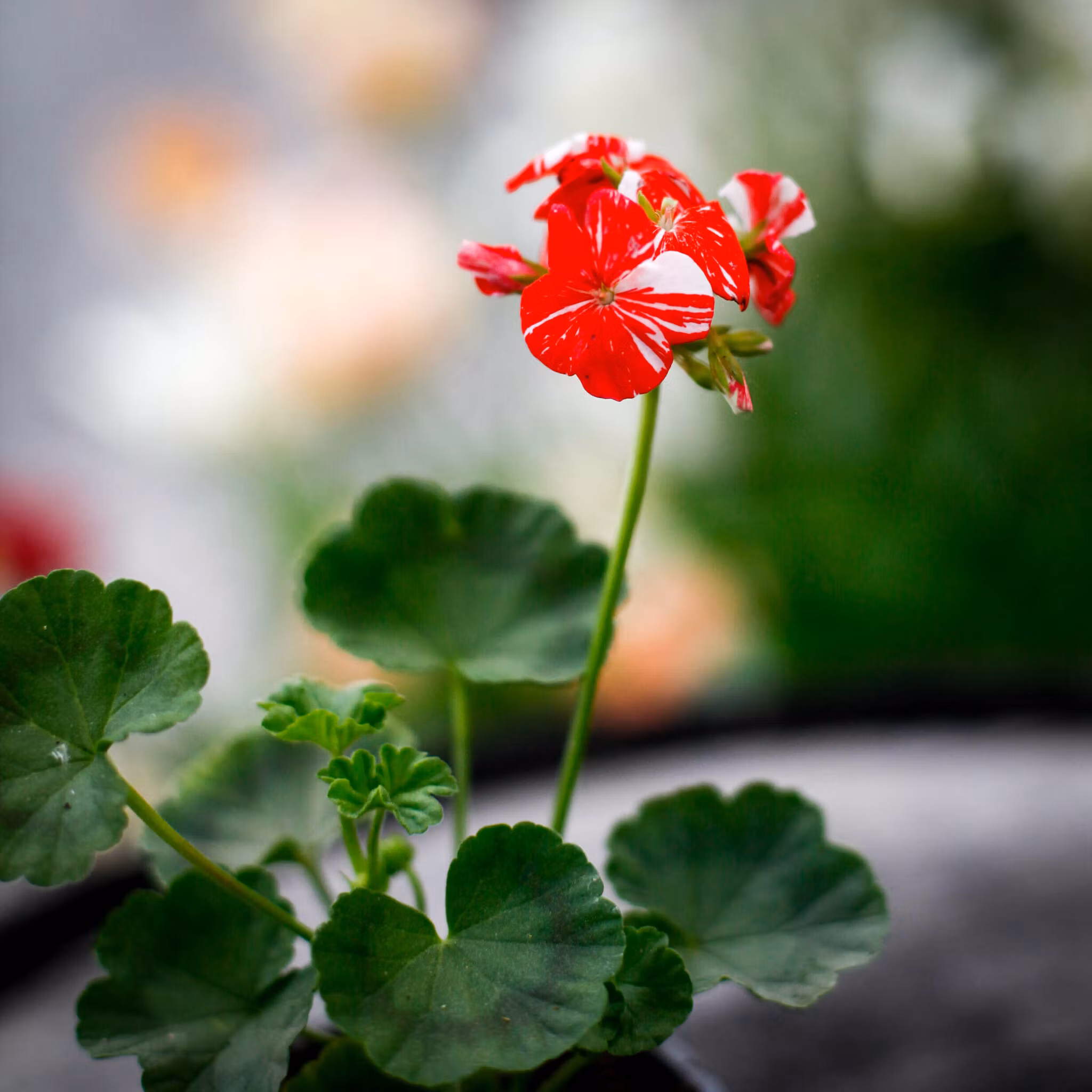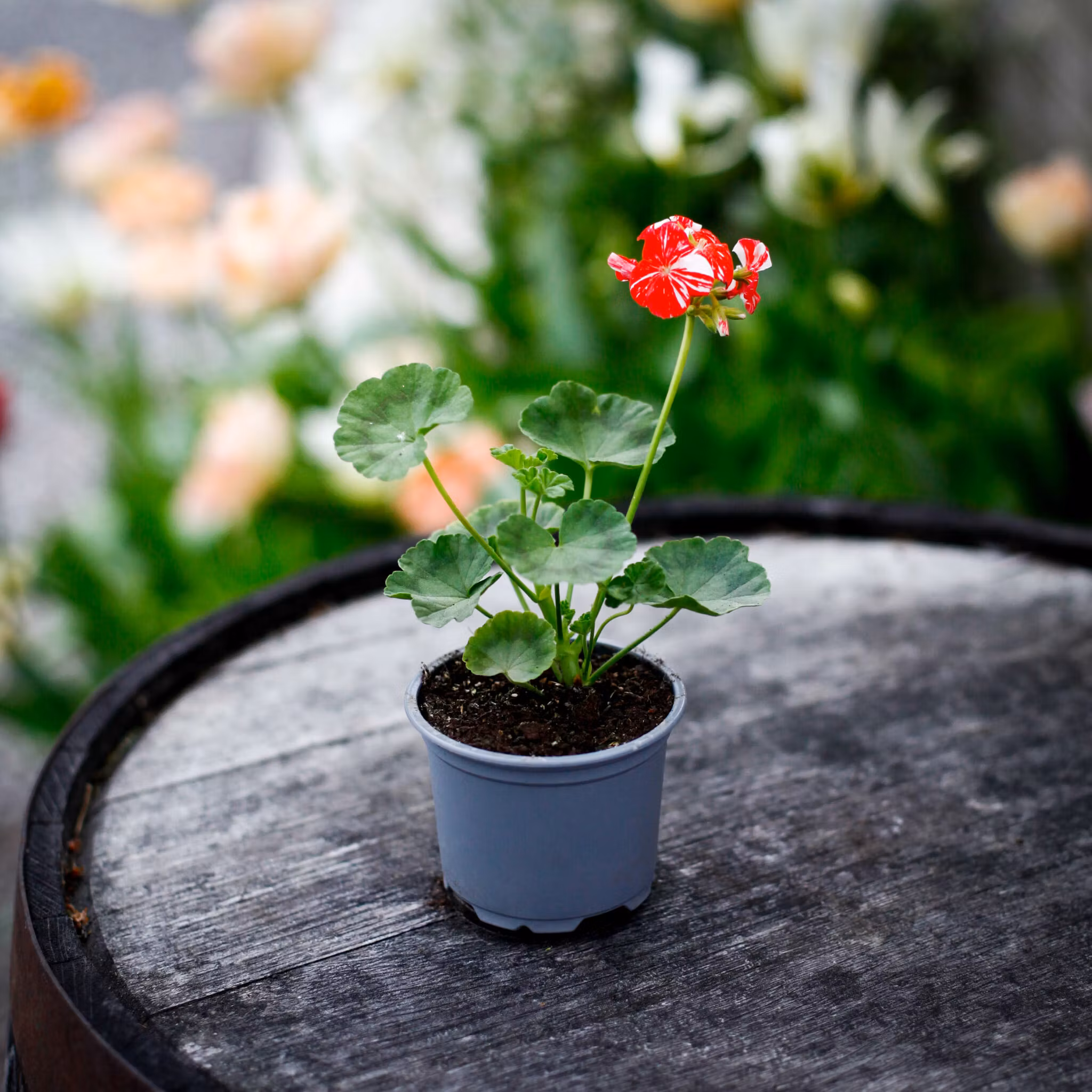 Pelargonium 'New Life' - En zonalpelargon med polkafärgade blommor, perfekt för fönsterbrädan eller balkongen. Inspirerande kontraster och livfull blomning.