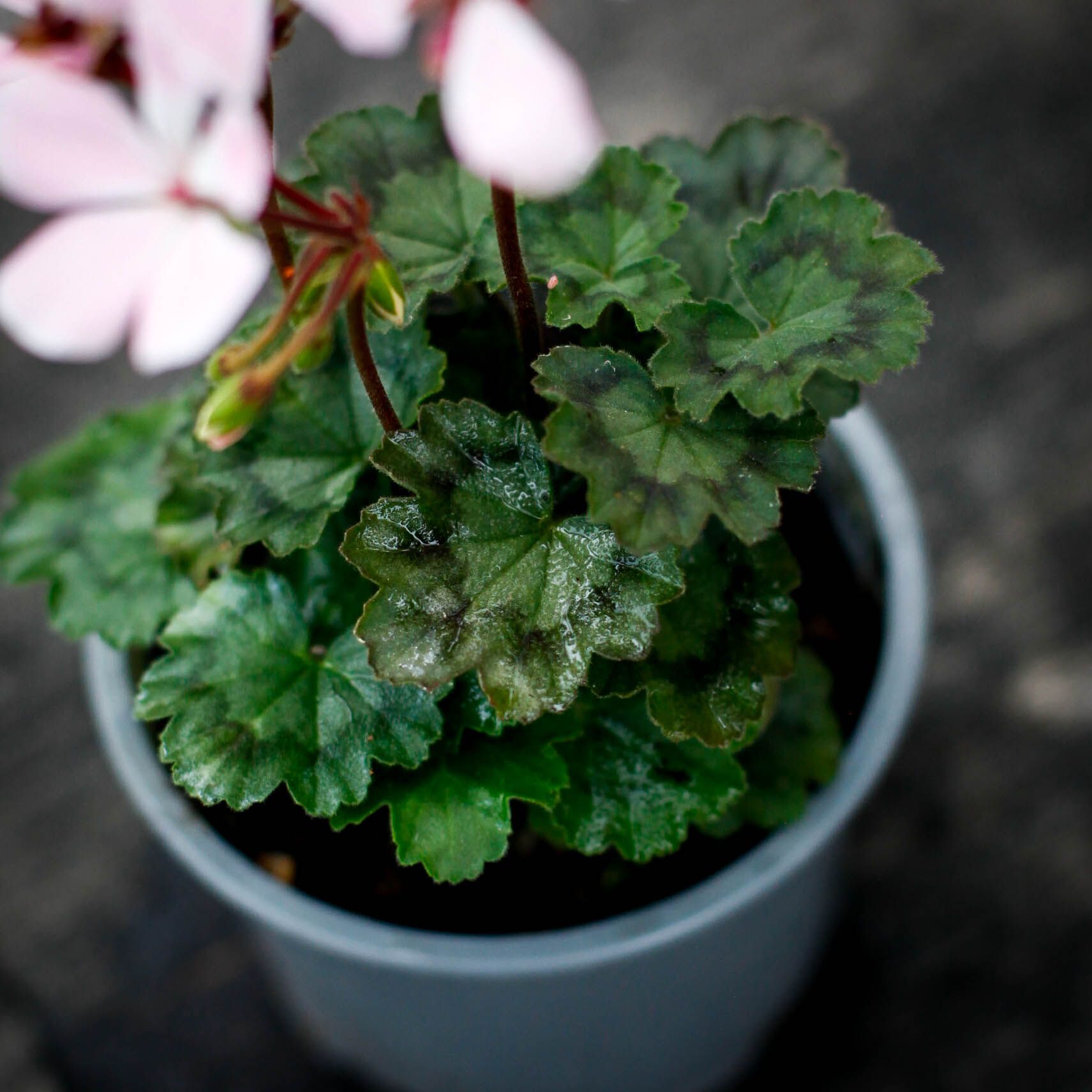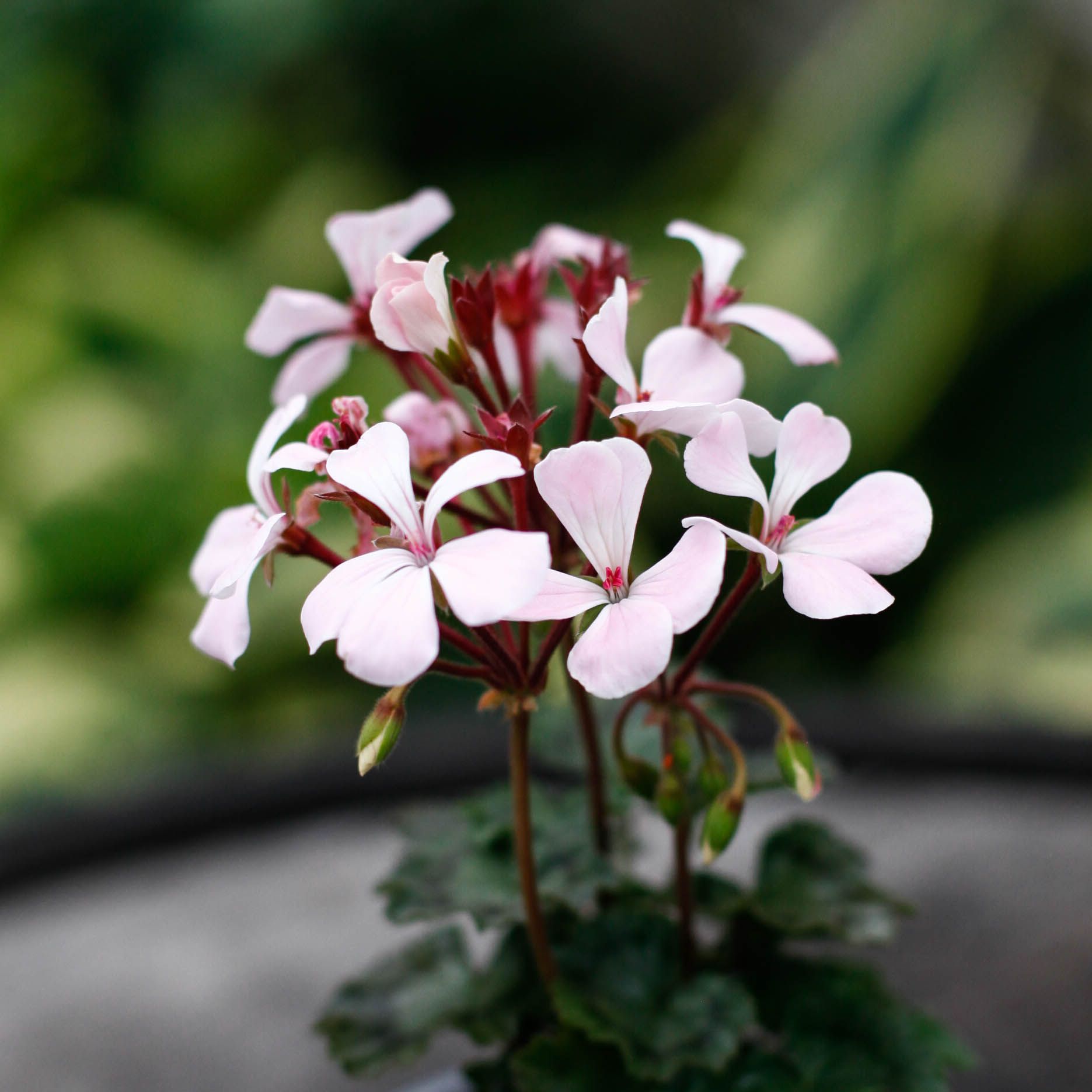 Pelargonium 'Nutley' - En inspirerande miniatyrpelargon med vita blommor och röda ådringar. Perfekt för samlare och små utrymmen. Köp hos Klorofyllverket.