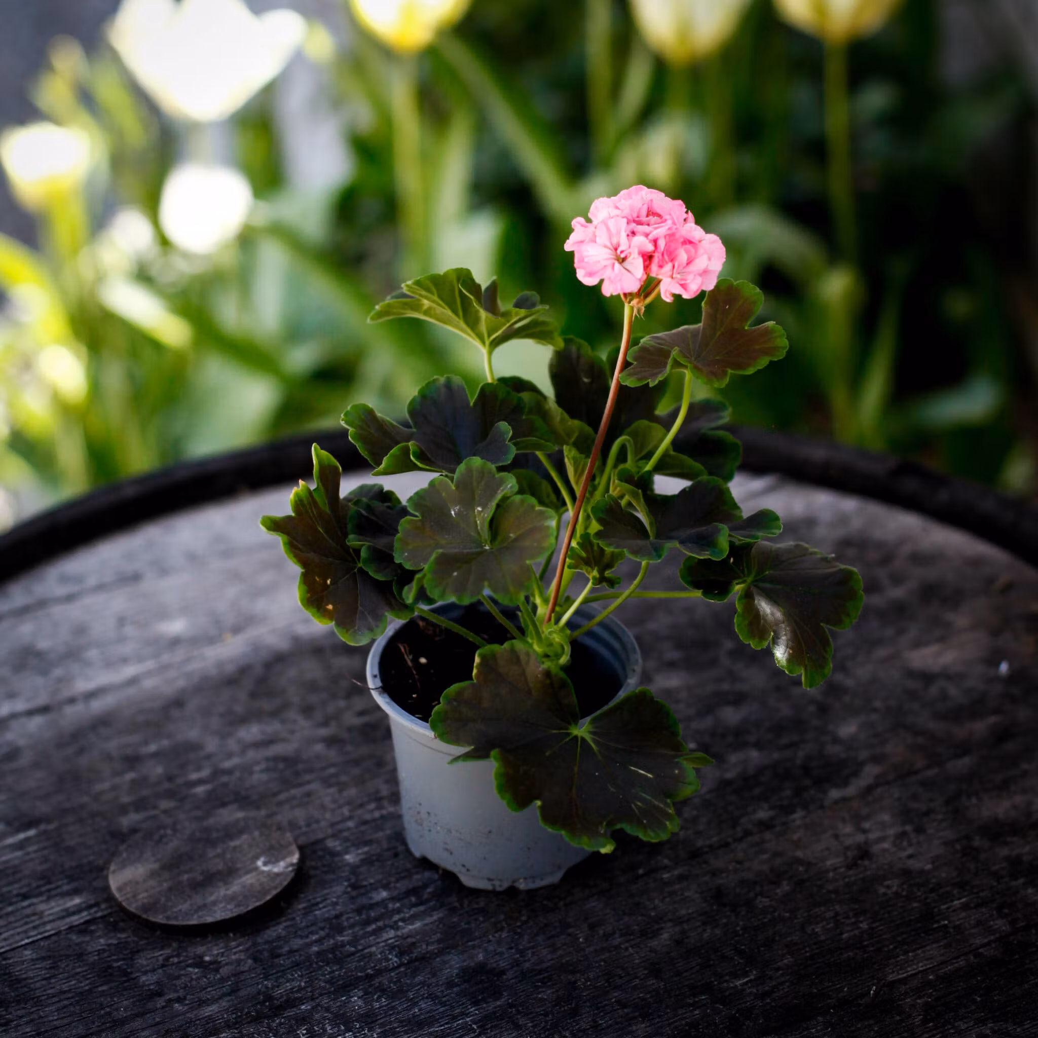 Köp Pelargonium 'Odensjö Black Mamba' 8 cm hos Klorofyllverket.se – en dramatisk zonalpelargon med mörka blad och rosa blommor. Perfekt för kruka och samling.