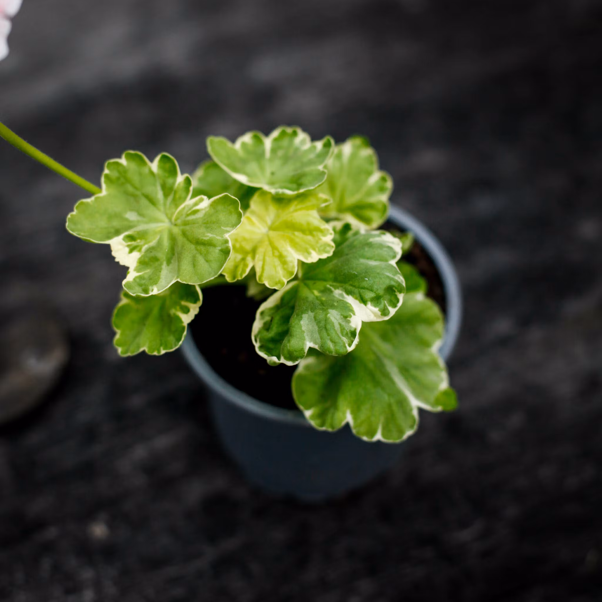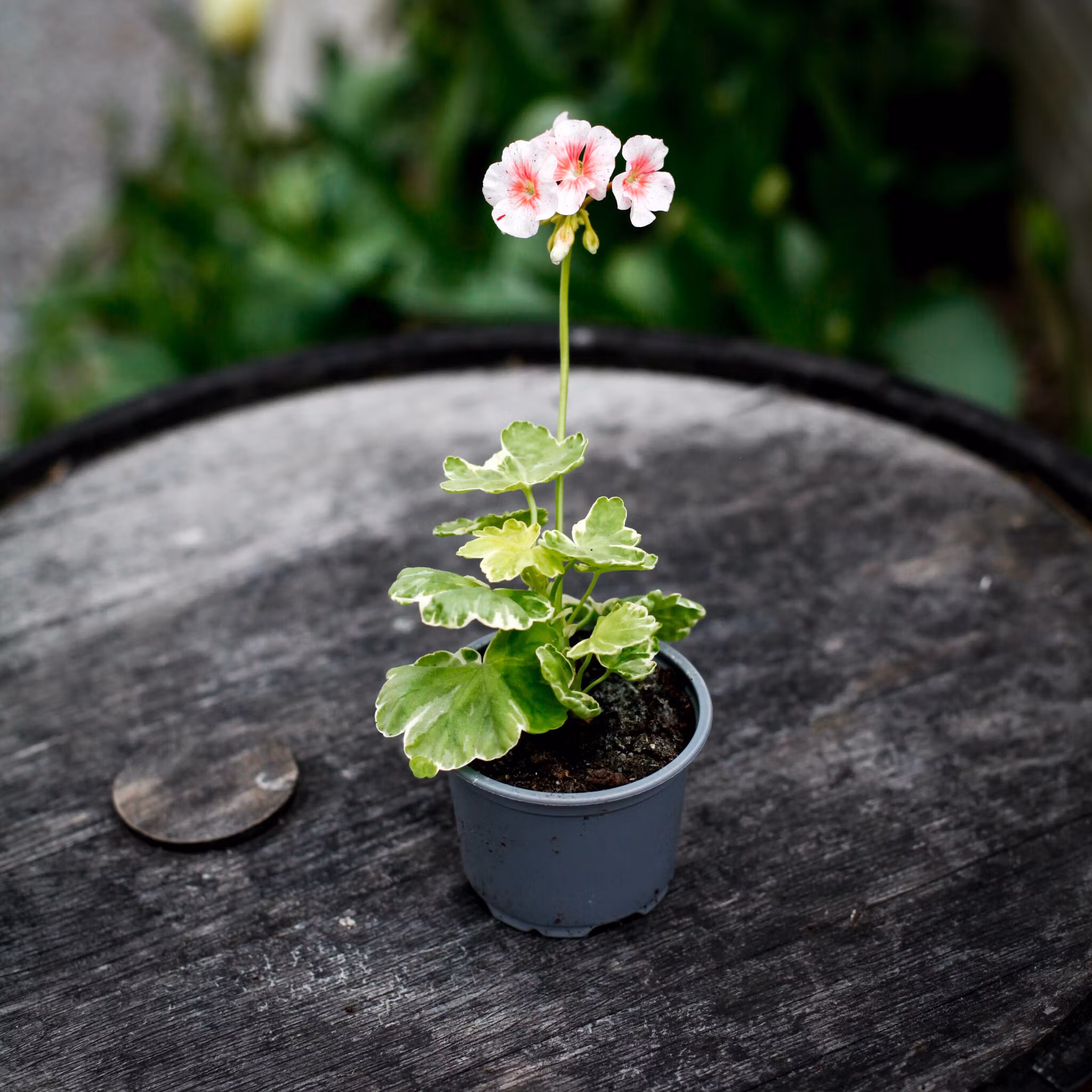 Pelargonium 'Odensjö Vivaldi' - en äggskalspelargon med ljusrosa blommor och variegerade blad. Perfekt för fönsterbrädan eller balkongen. 🌿
