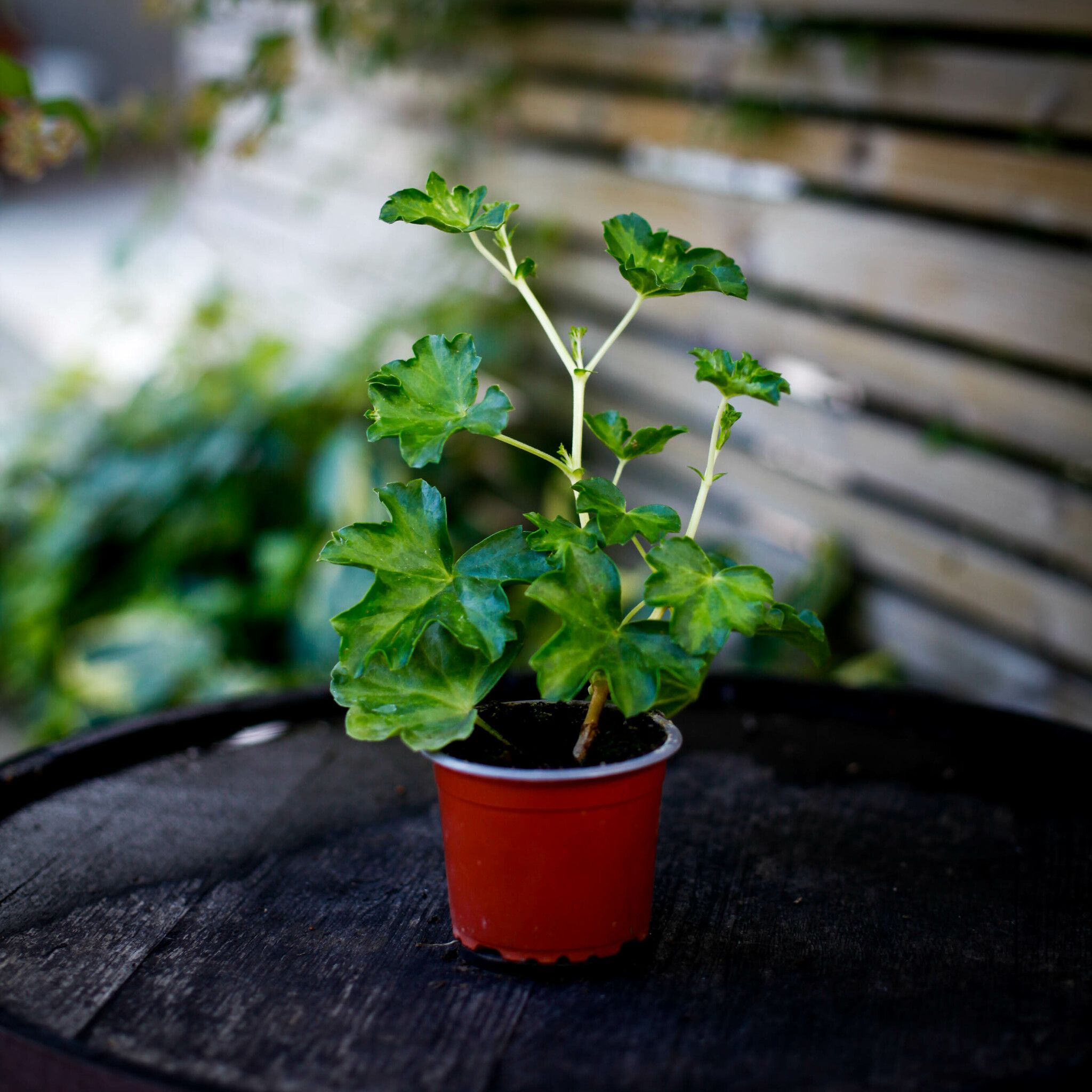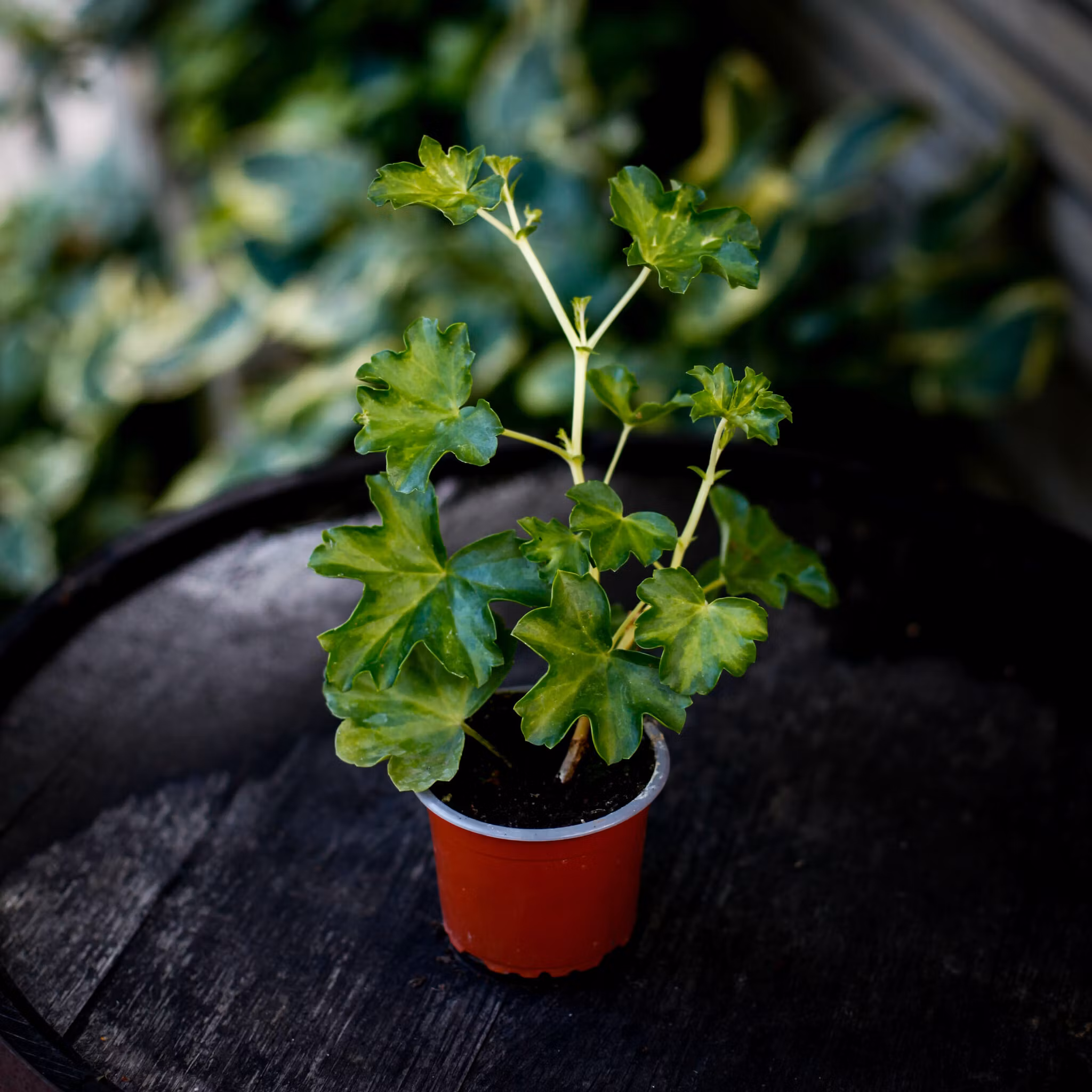 Pelargonium ’Paris’ 8 cm - Hängpelargon med rosa blommor och röd ådring. Perfekt för balkonglådor och hängande korgar. Placera i sol, torka upp mellan vattning.