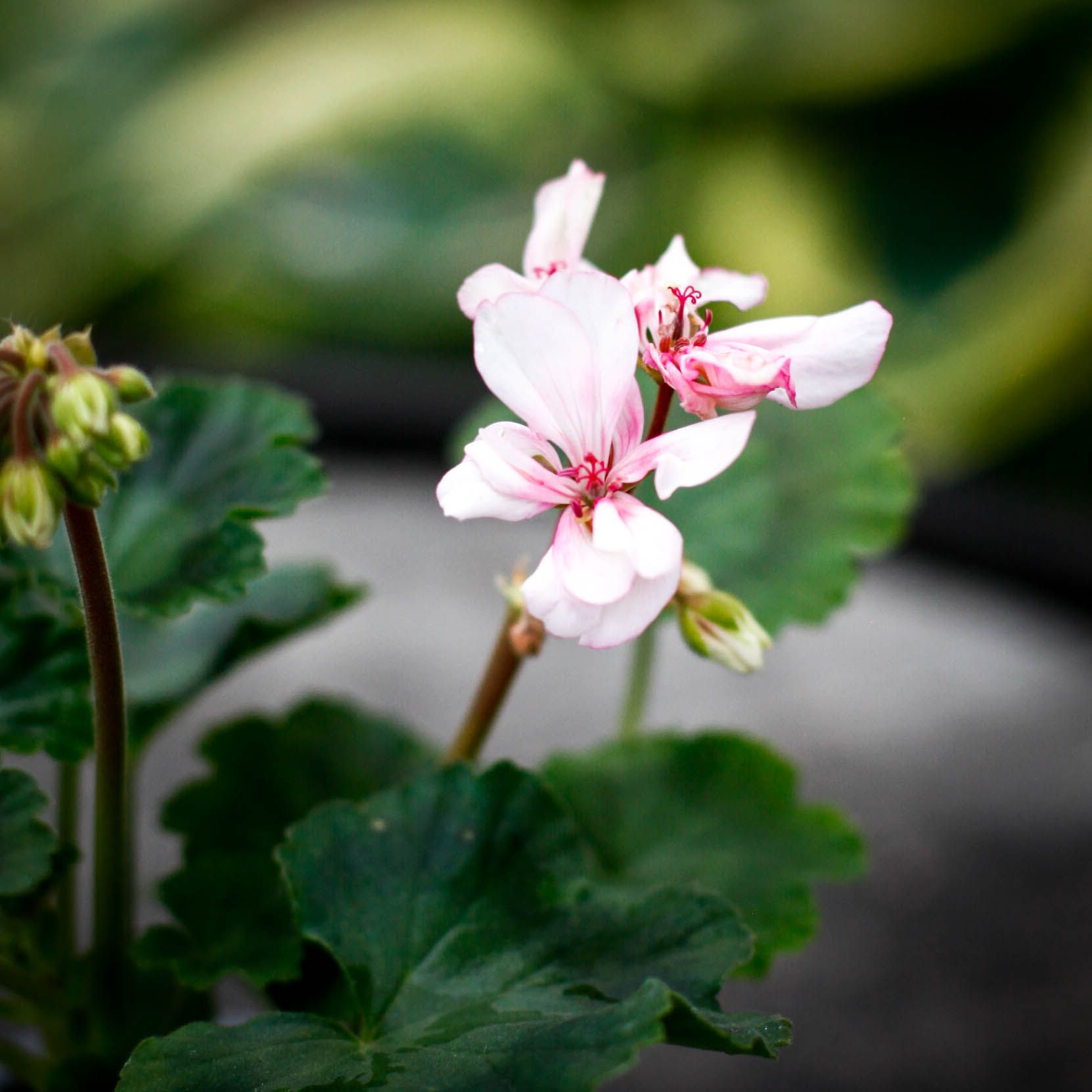 Pelargonium 'Stella Read' är en elegant och charmig miniatyrpelargon som blommar med vackra dubbla blommor i vitt med rosa mitt och subtila rosa kanter. De färgade detaljerna ger blommorna ett romantiskt och mjukt uttryck, perfekt för dig som uppskattar subtil skönhet.