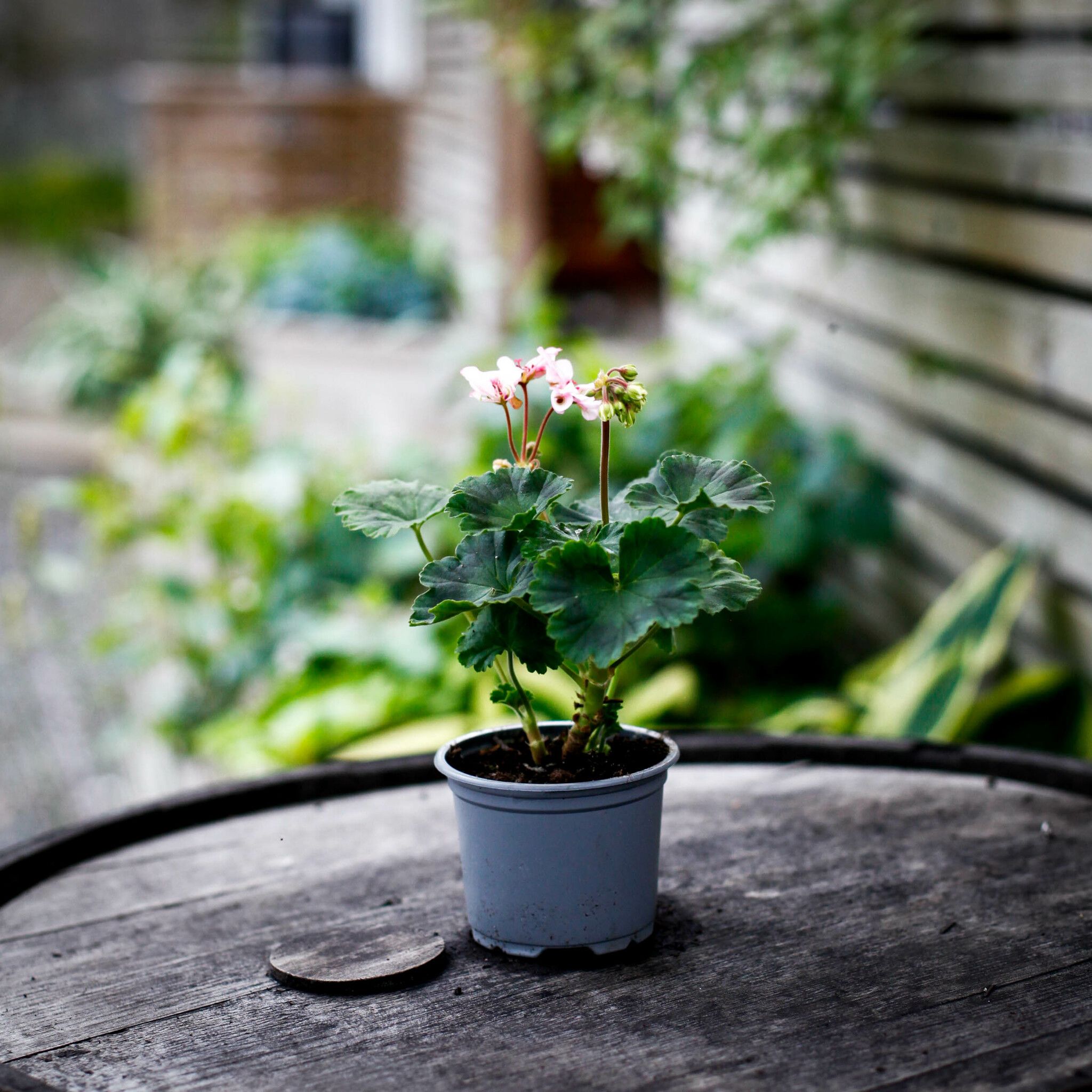 Pelargonium 'Stella Read' – en kompakt och charmig miniatyrpelargon med dubbla vita blommor och rosa kanter. Perfekt för små utrymmen och samlare.