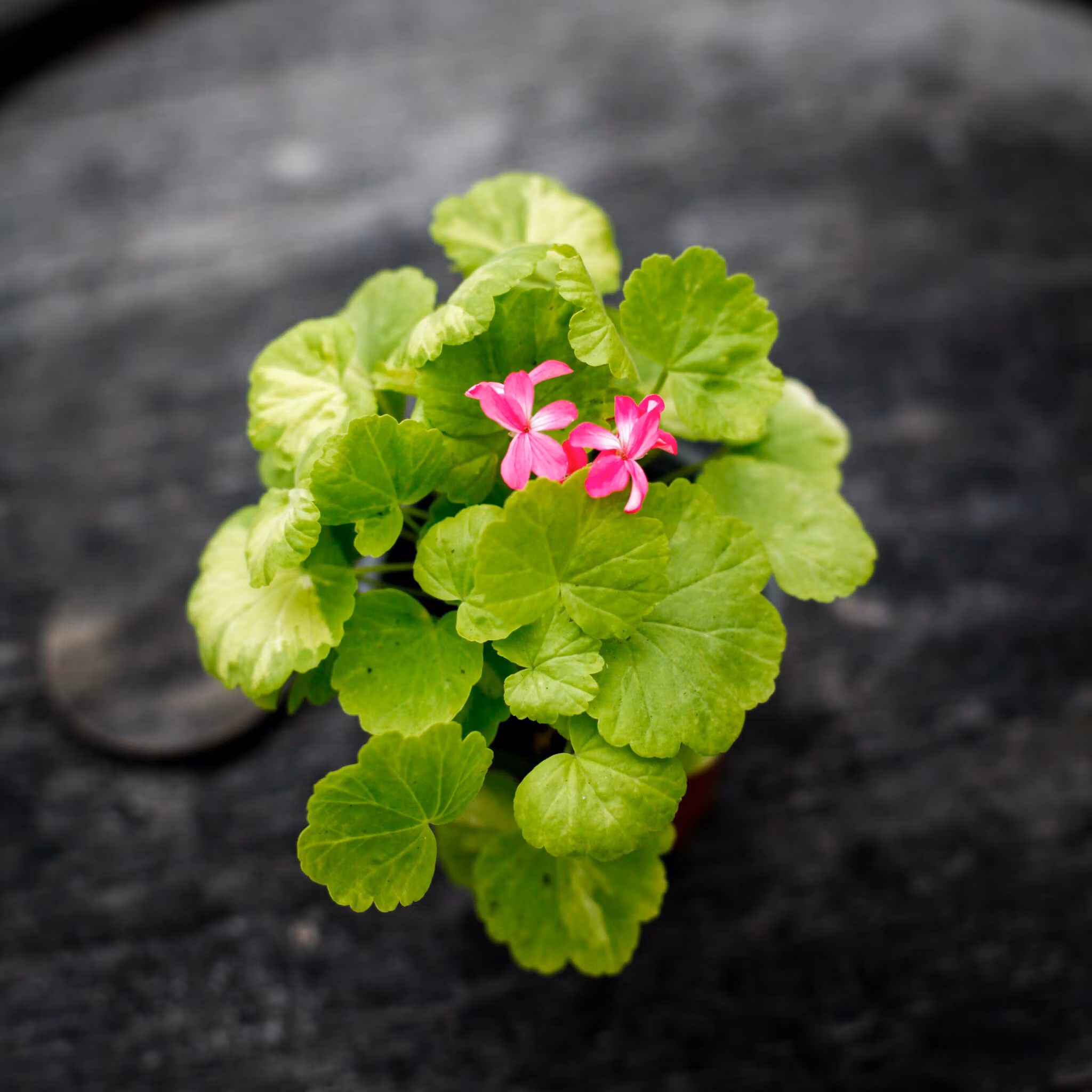 Pelargonium 'Sunspot Kleine Liebling' - älskad miniatyrpelargon med riklig ceriserosa blomning och kompakt växtsätt. Perfekt för små utrymmen.