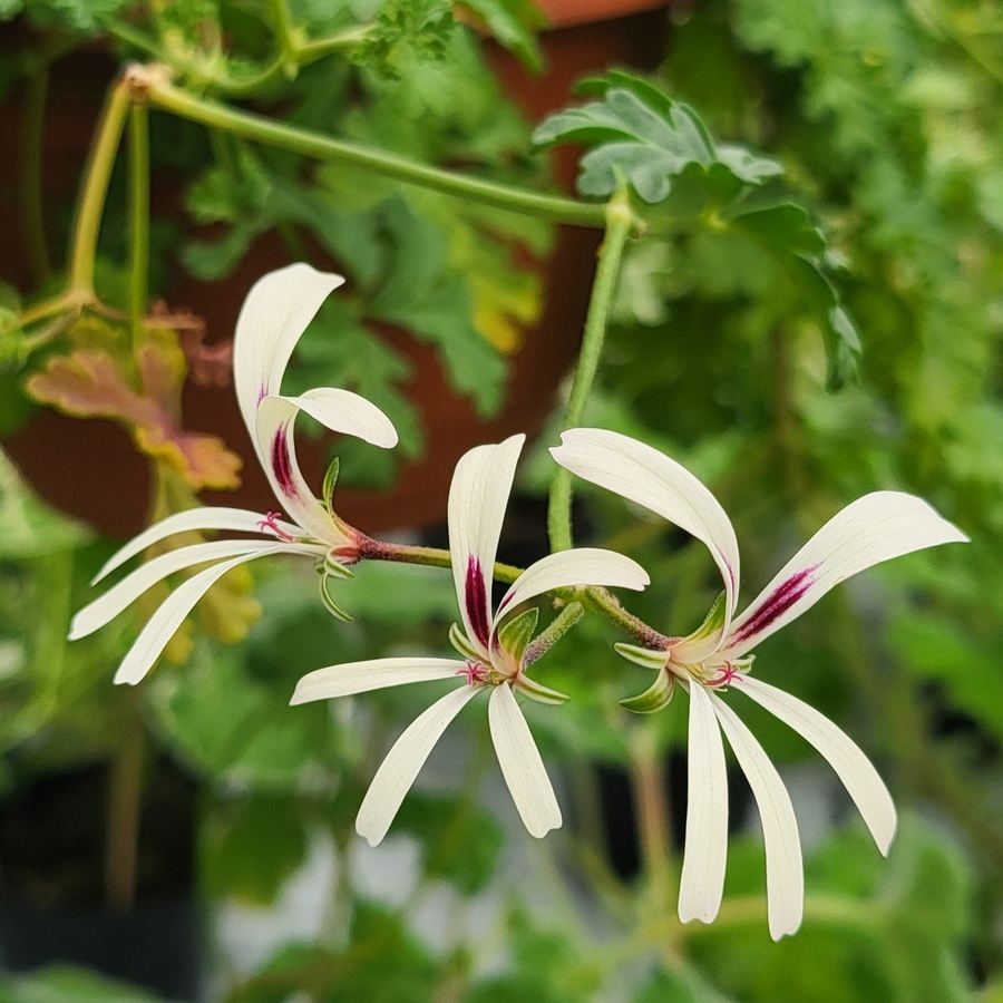 Pelargonium triffidum är en unik och charmig vildpelargon som imponerar med sitt krypande växtsätt och vackert flikiga blad. Den blommar med stora, cremevita blommor med vinröda markeringar på de övre kronbladen – ett iögonfallande inslag som gör den till en sann samlarfavorit.