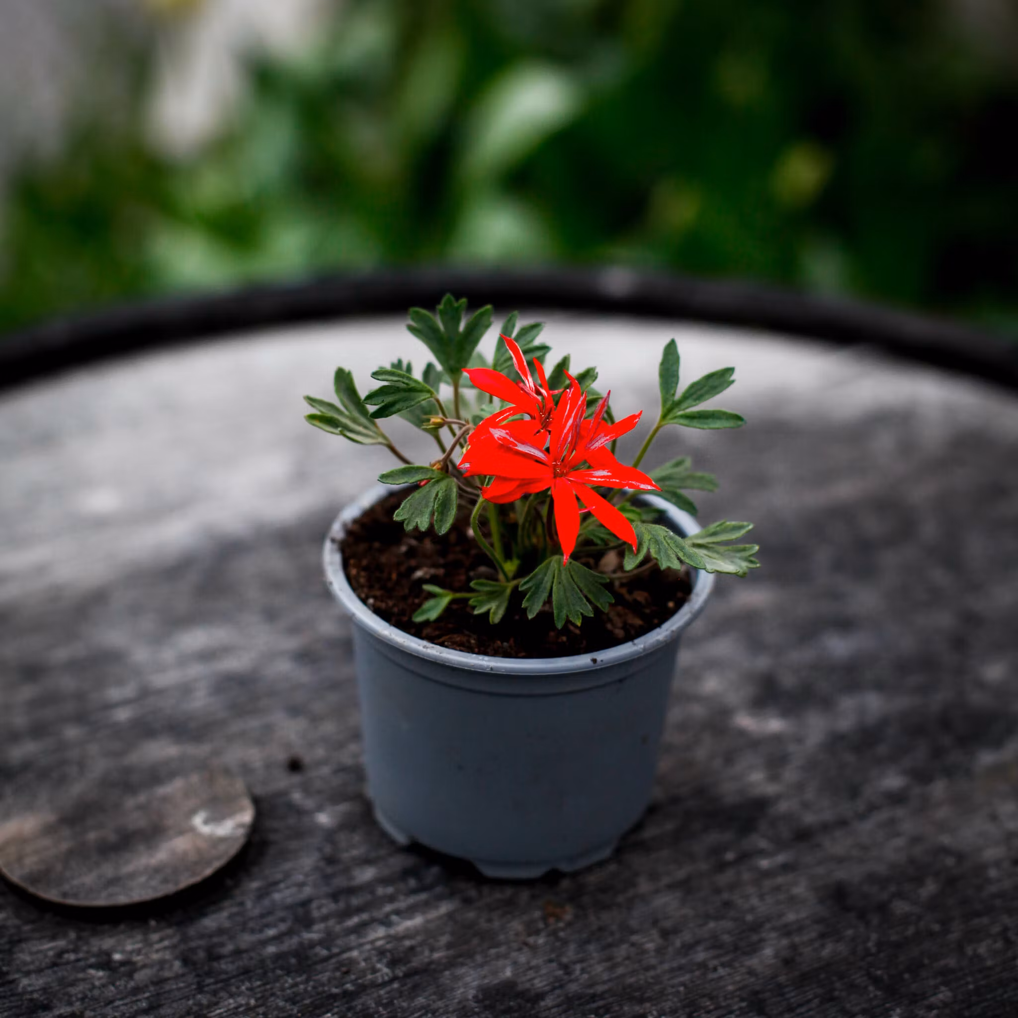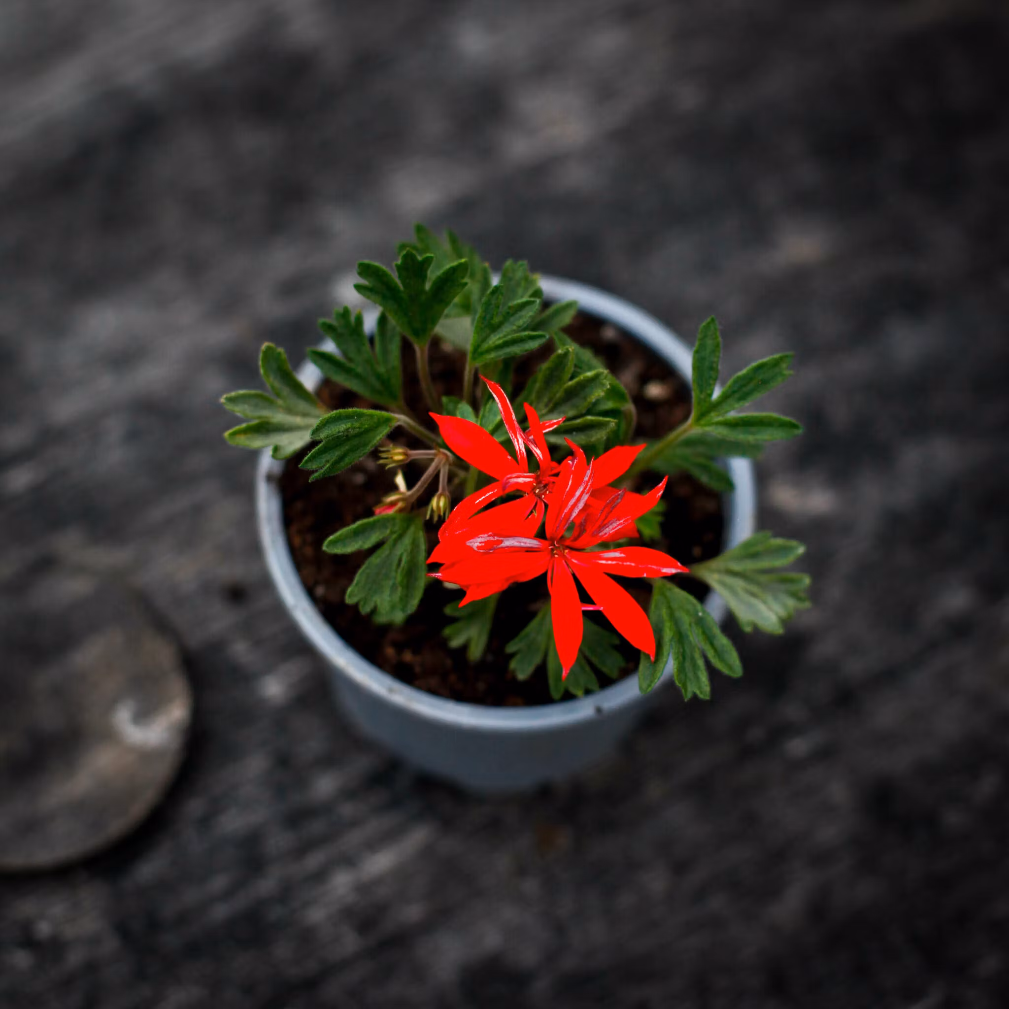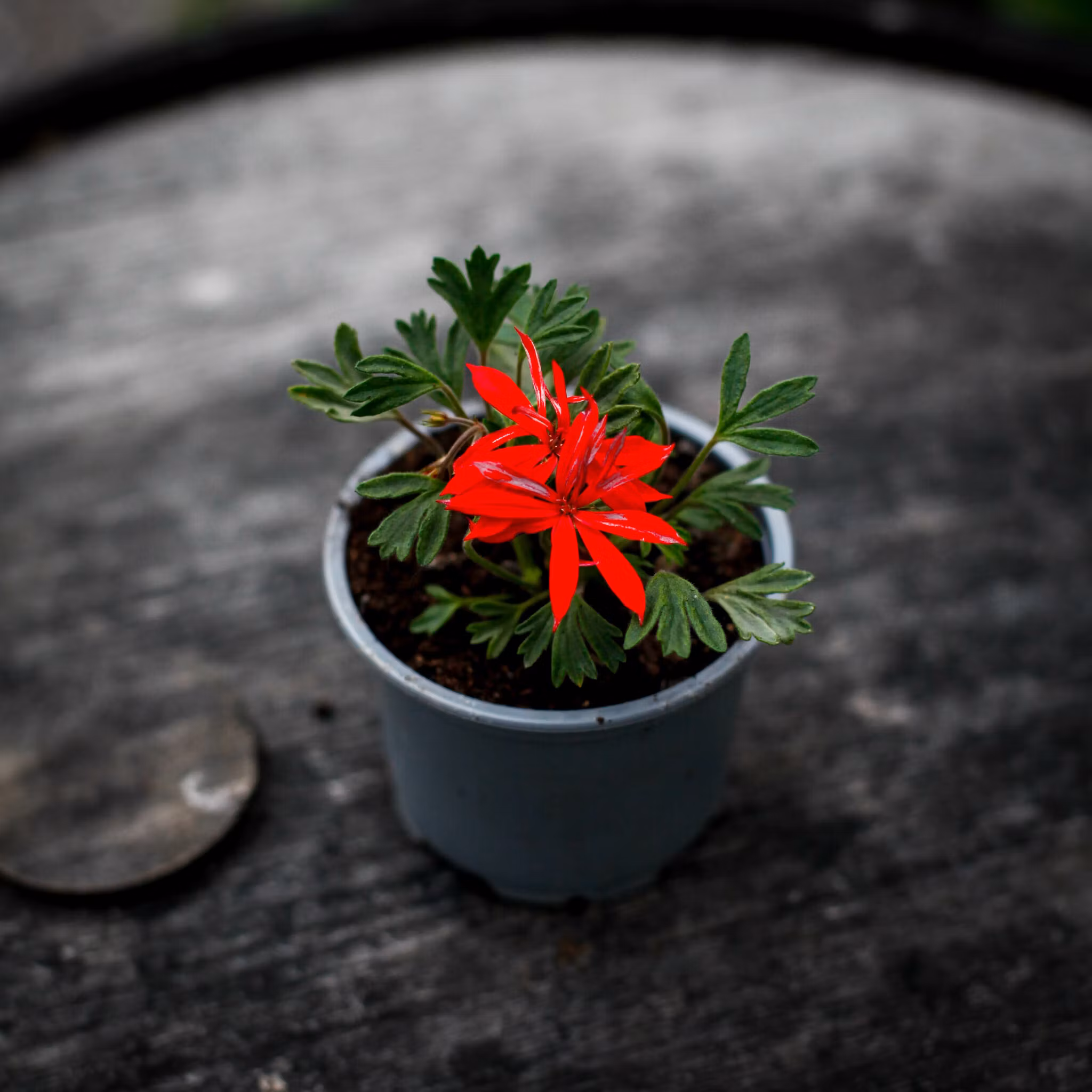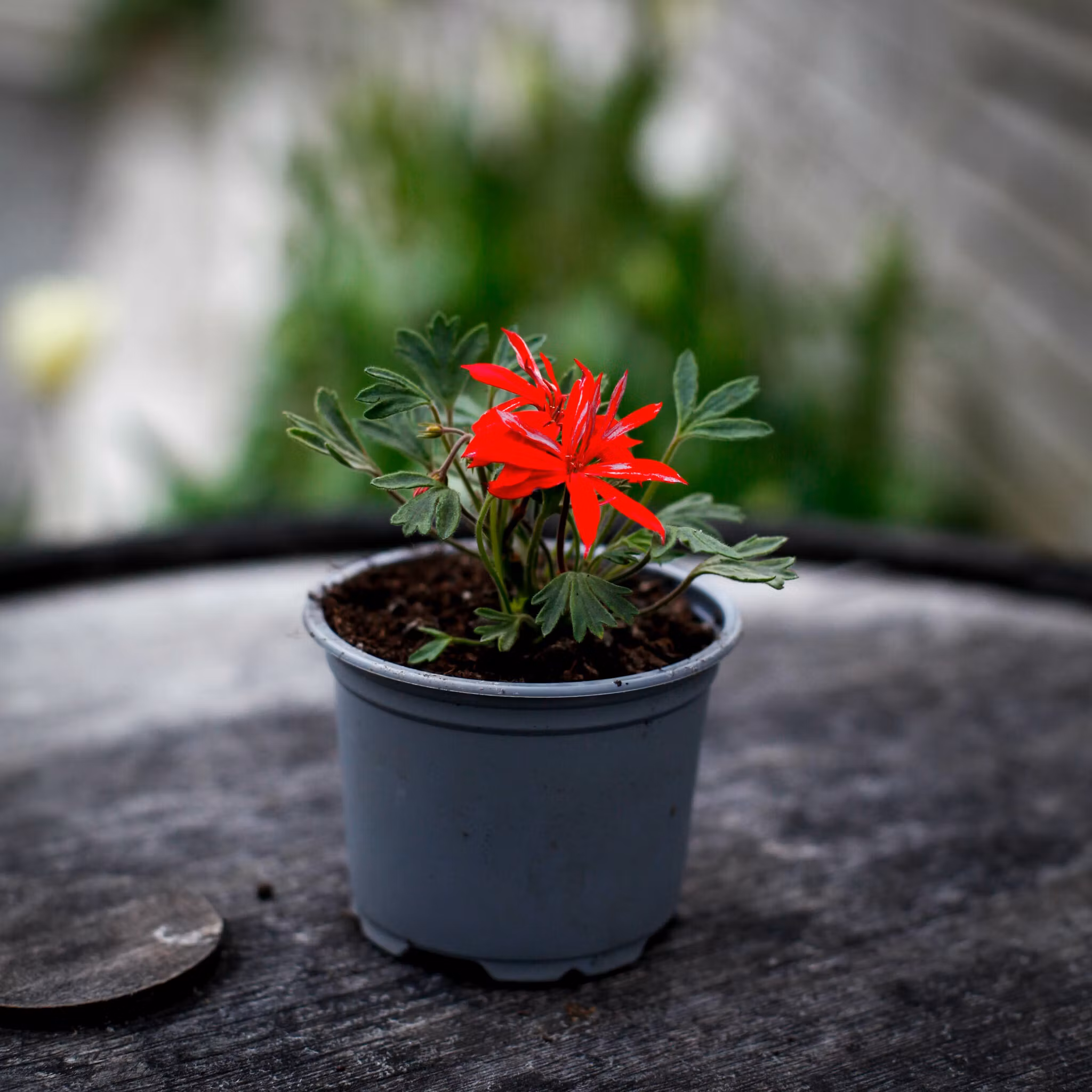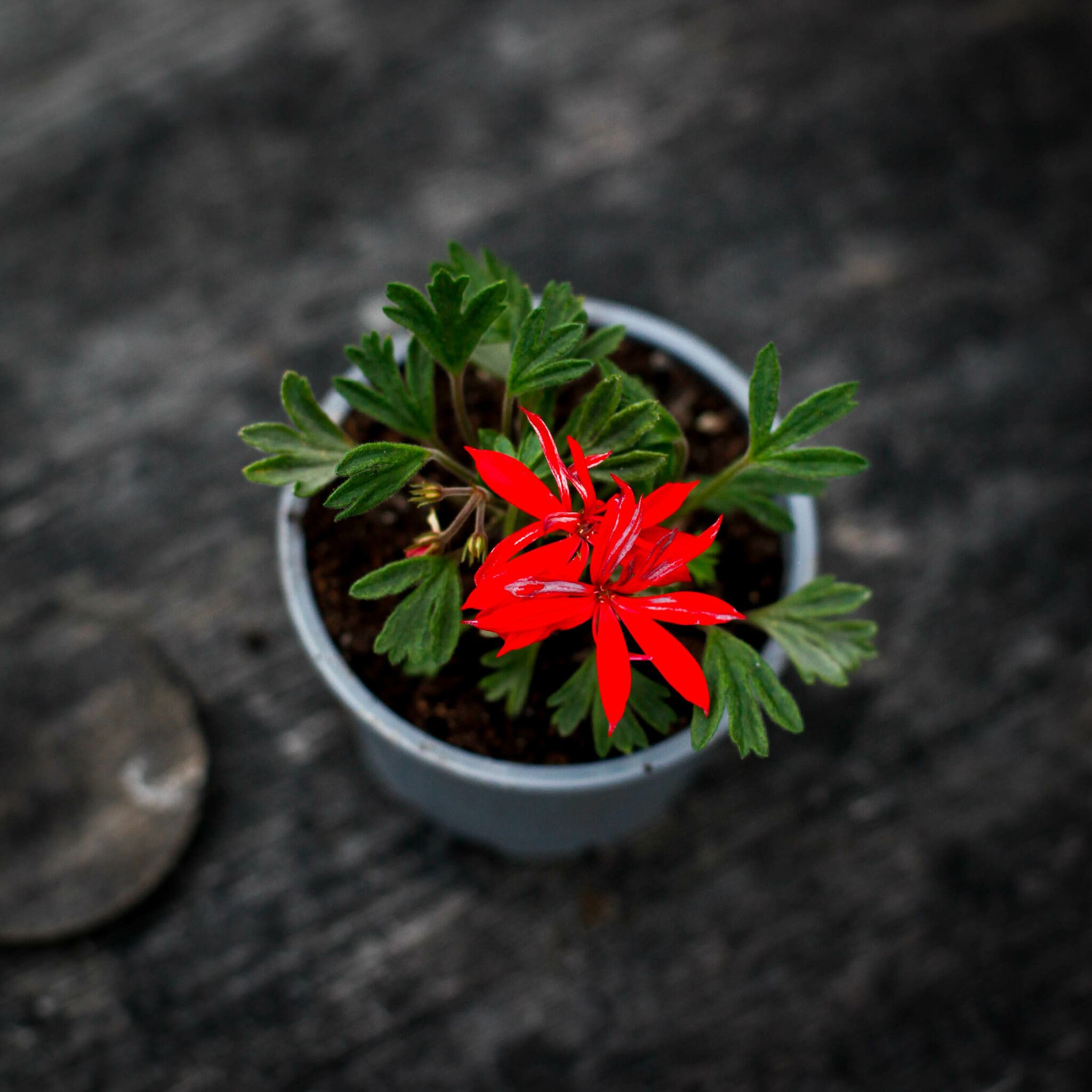 Pelargonium 'Urchin' – en miniatyrpelargon med starkt julröda blommor. Perfekt för små krukor, samlarhyllor och fönsterbrädor. Köp hos Klorofyllverket.se.