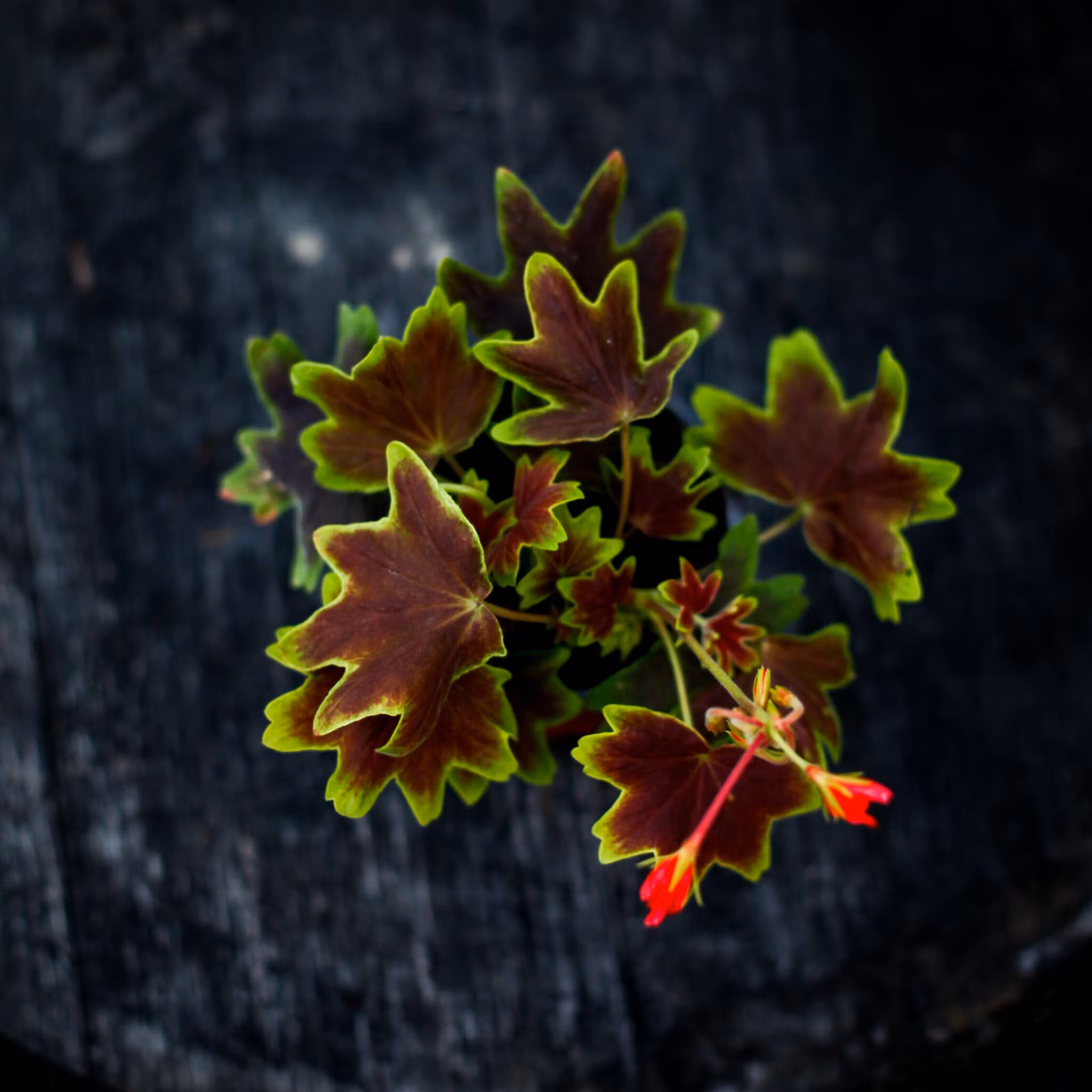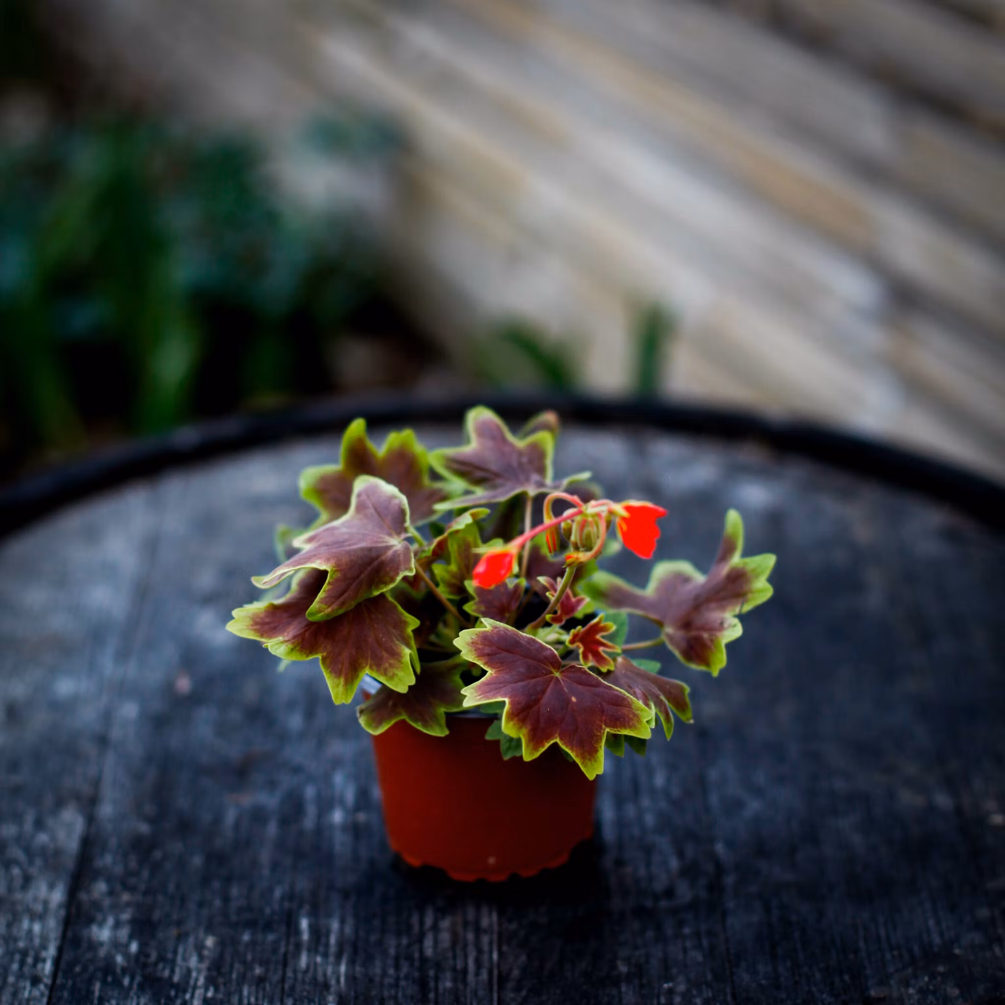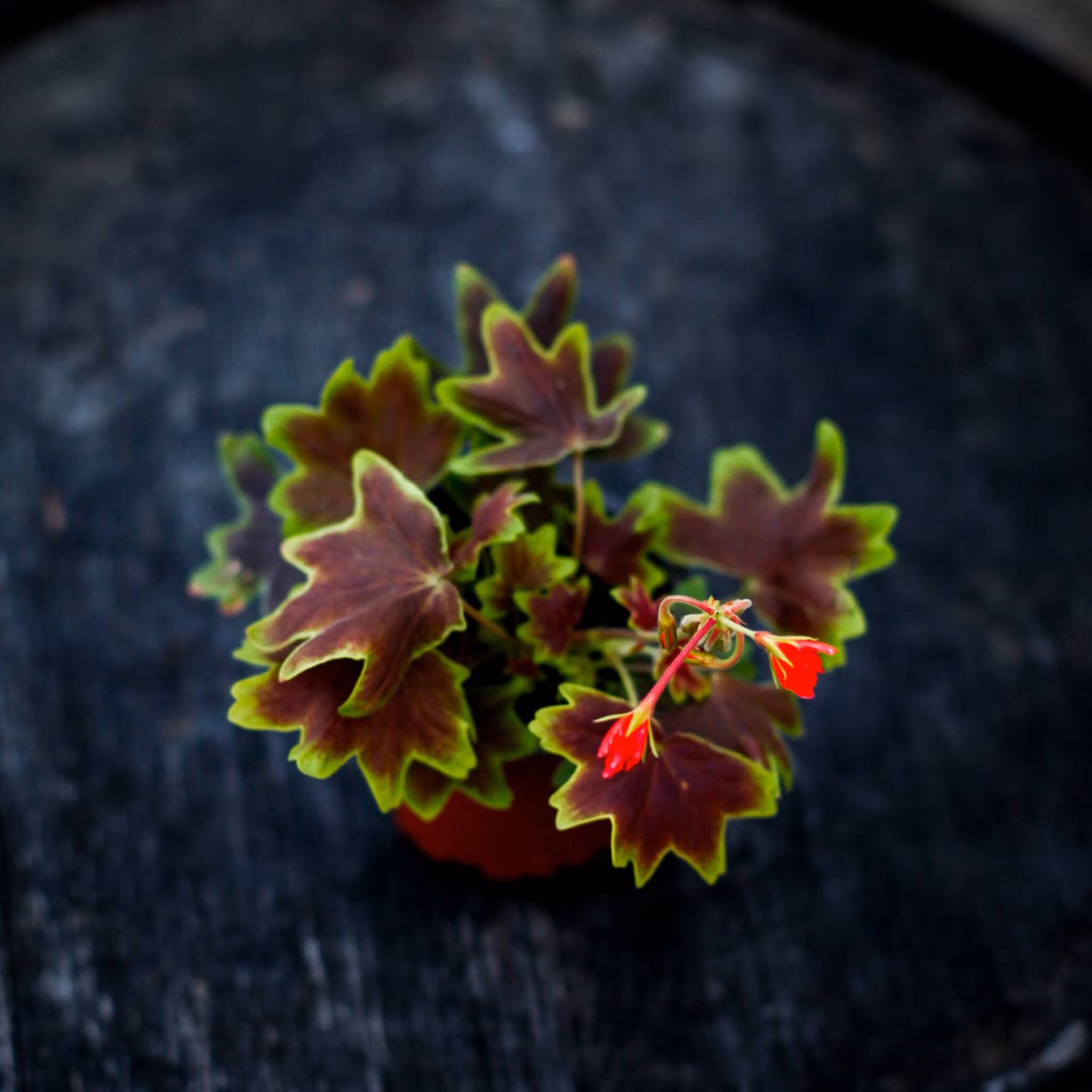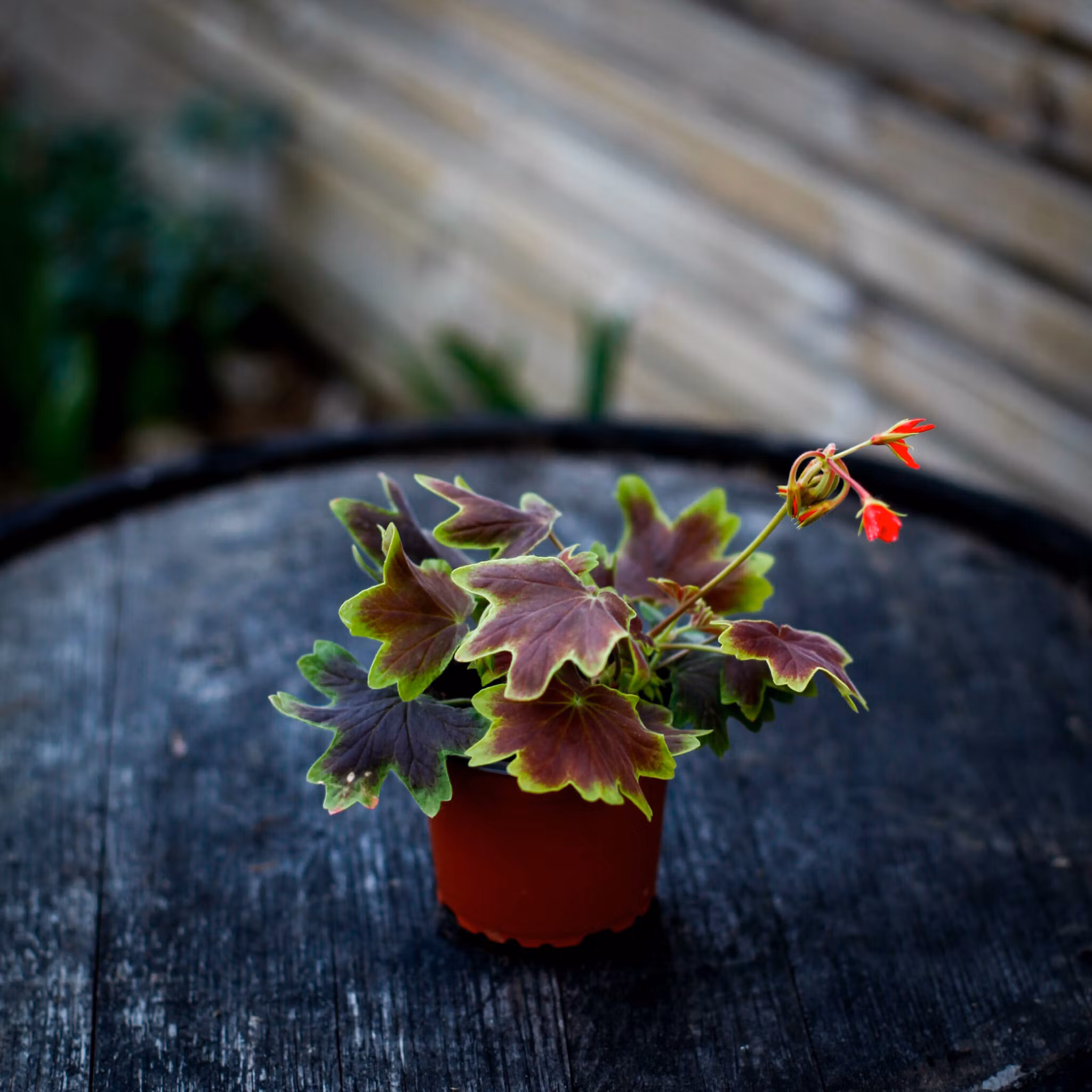 'Vancouver Centennial' Stjärnpelargon. 8 cm, Färgglada blad & ljusröda blommor som lyser upp ditt hem. Perfekt för direkt solljus och enkel skötsel.