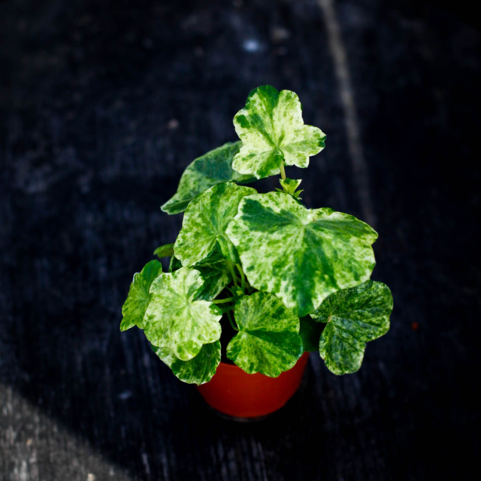 Pelargonium 'Variegated Giroflee' 8 cm, är en populär variegerad hängpelargon med purpurfärgade blommor mot variegerade bladverk.