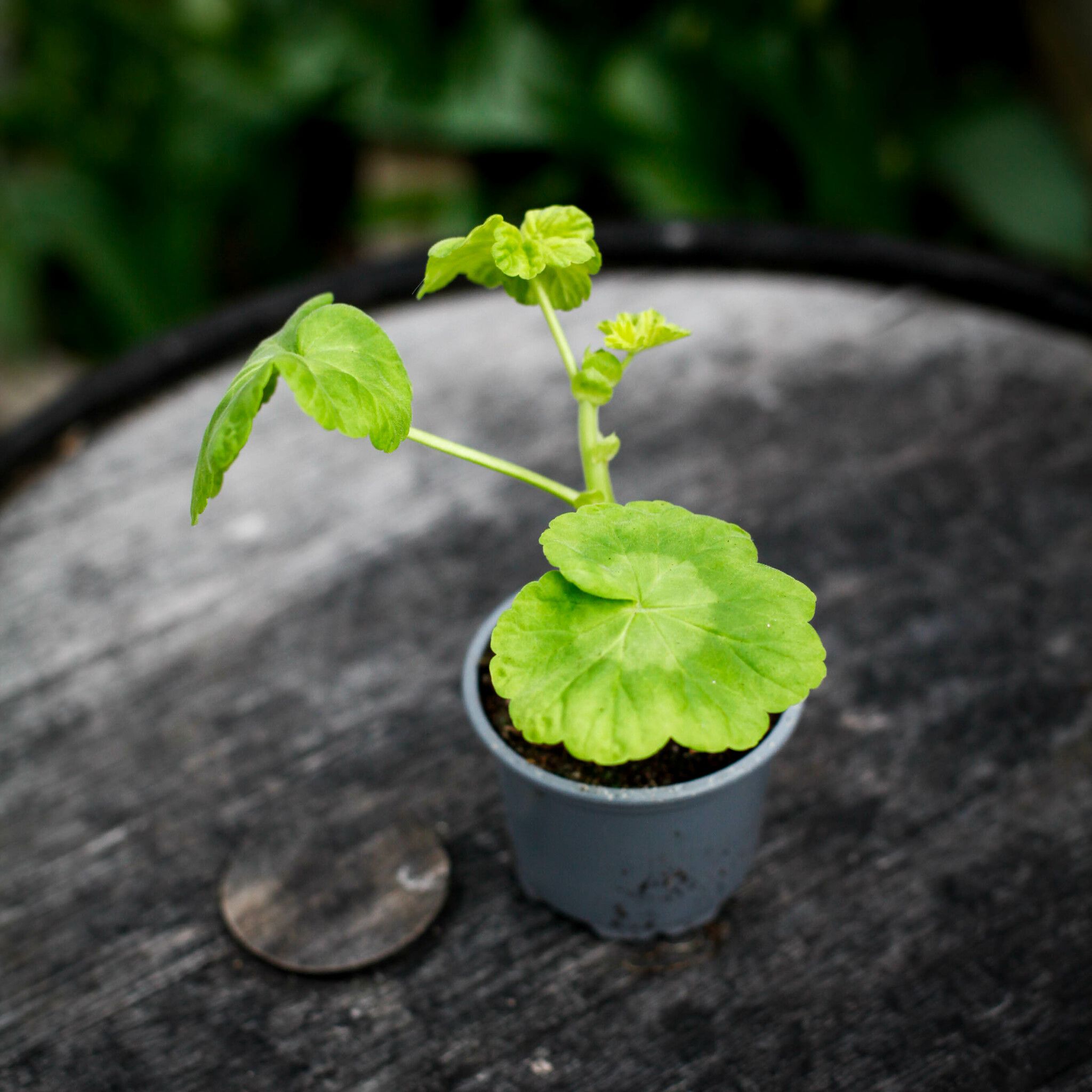 Pelargonium 'Vit Gemma' – unik äggskalspelargon med vita blommor och orange stänk. Perfekt för soliga fönsterbrädor. Köp hos Klorofyllverket.se.