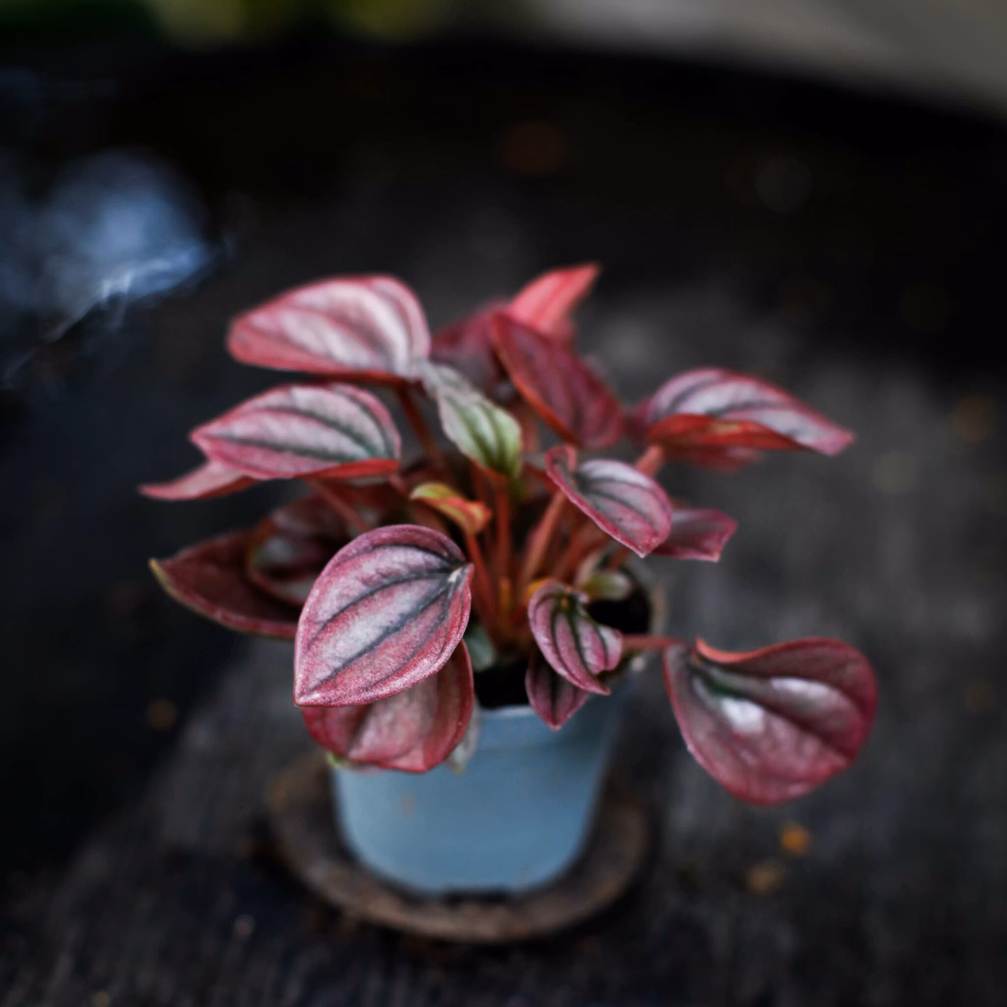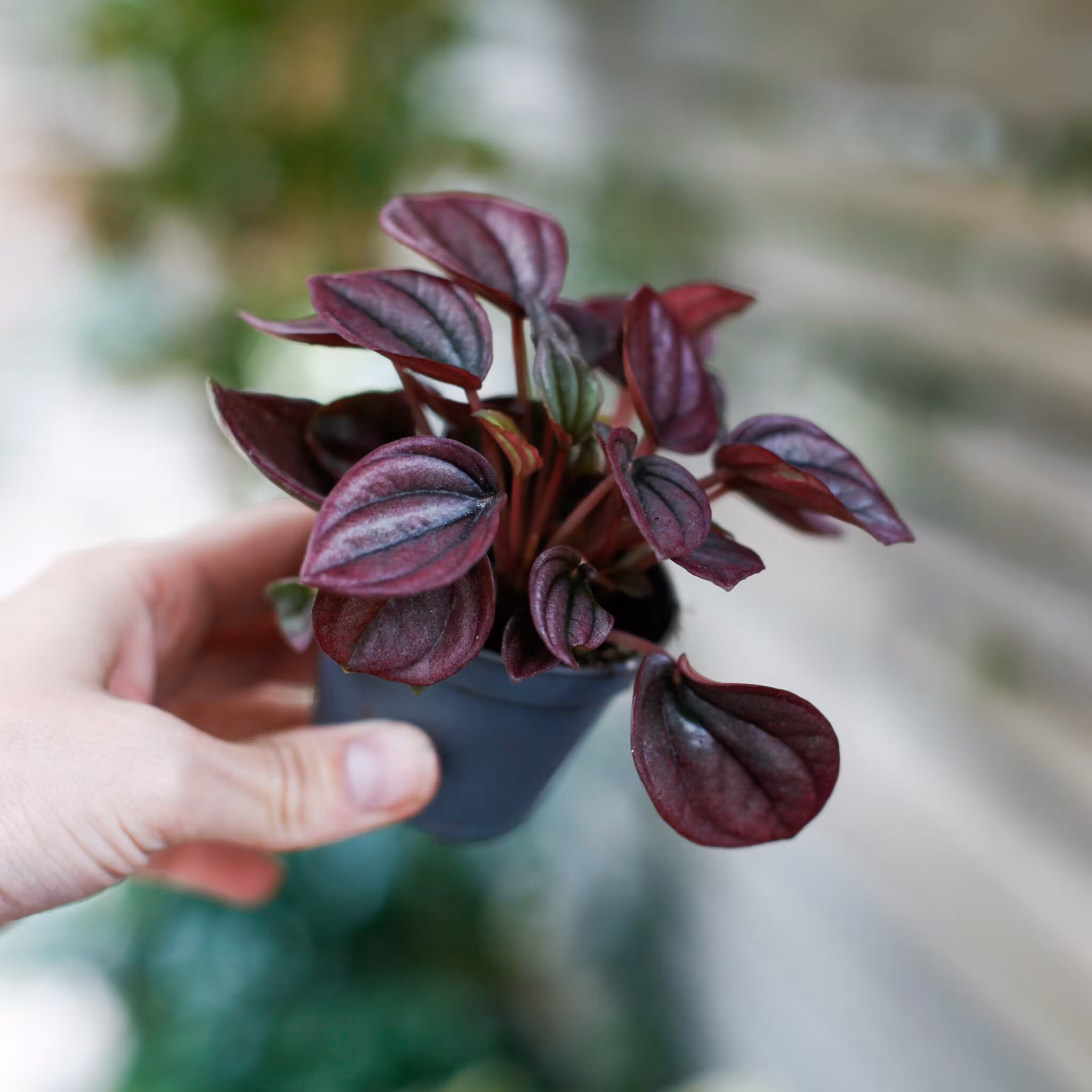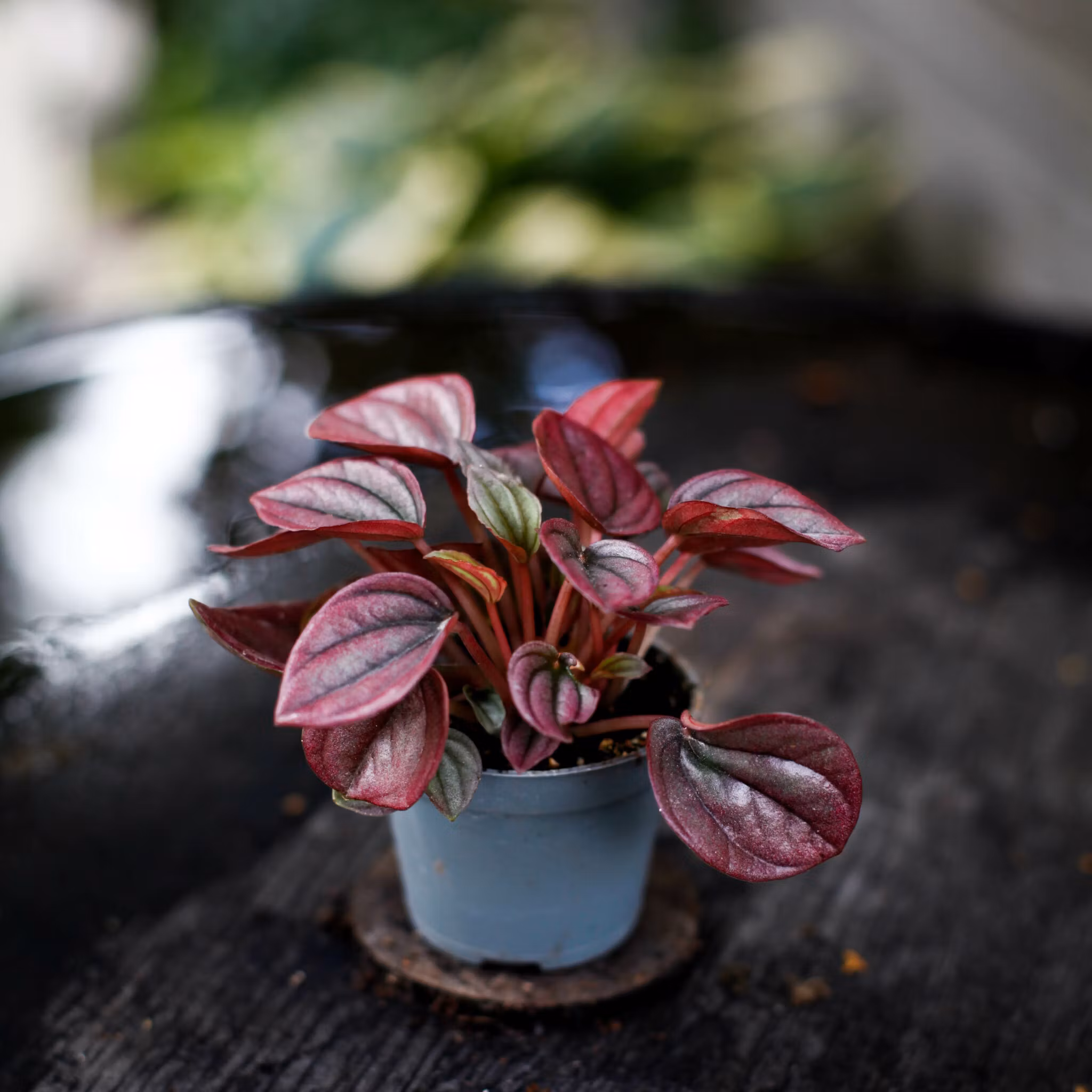 Peperomia 'Cayenne' är en vacker och elegant växt som imponerar med sina glänsande, mörkgröna blad och unika, lätt rödaktiga stjälkar. Bladen har en fin, mjuk struktur och är täckta av ett subtilt, nästan marmorerat mönster som ger växten ett sofistikerat utseende. Den växer kompakt och buskigt, vilket gör den idealisk för att placeras på hyllor, bord eller i små krukor. Peperomia 'Cayenne' är också lättskött och trivs bra i inomhusmiljöer.