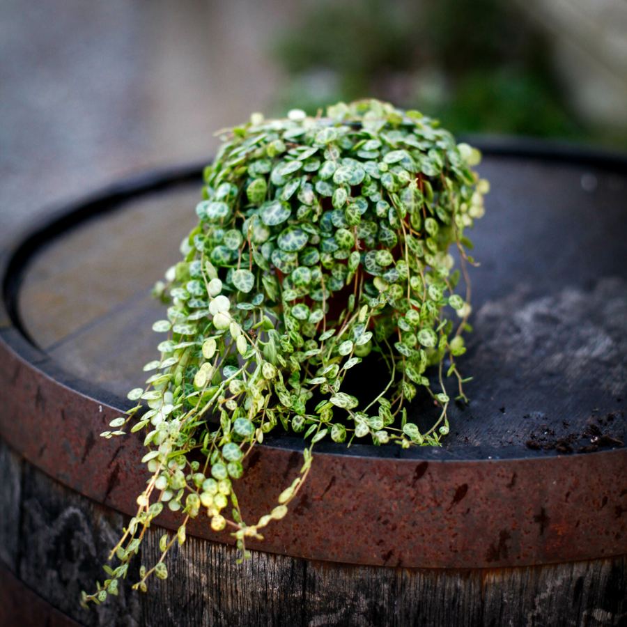 Peperomia prostrata, även känd som "String of Turtles," är en charmig och unik krukväxt som utmärker sig med sina små, runda blad som har ett distinkt mönster som påminner om en sköldpaddsrygg. Bladen är djupt gröna med mörkare mönster och växer i slingrande, hängande stjälkar, vilket gör att den passar utmärkt för hängande krukor eller som en dekorativ växt på hyllor. Peperomia prostrata är lättskött och en fantastisk växt för att ge liv åt både moderna och traditionella inomhusmiljöer.