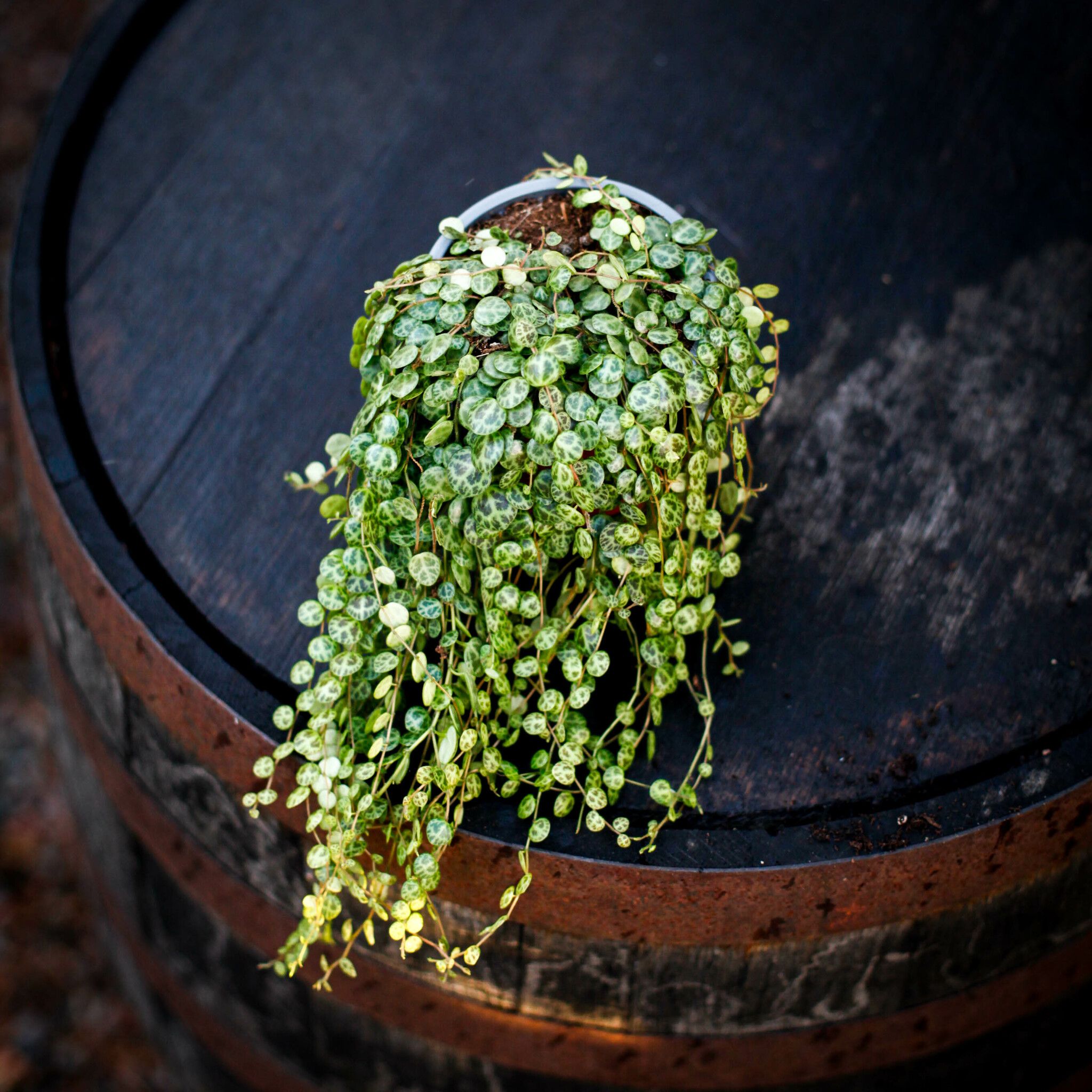 Peperomia prostrata är en unik och dekorativ växt med små, runda blad som har ett sköldpaddsliknande mönster. Den växer långsamt och har ett slingrande, hängande växtsätt, vilket gör den till en fantastisk växt för att ge liv åt ditt hem, särskilt i hängande krukor eller på hyllor där den kan bre ut sig.
