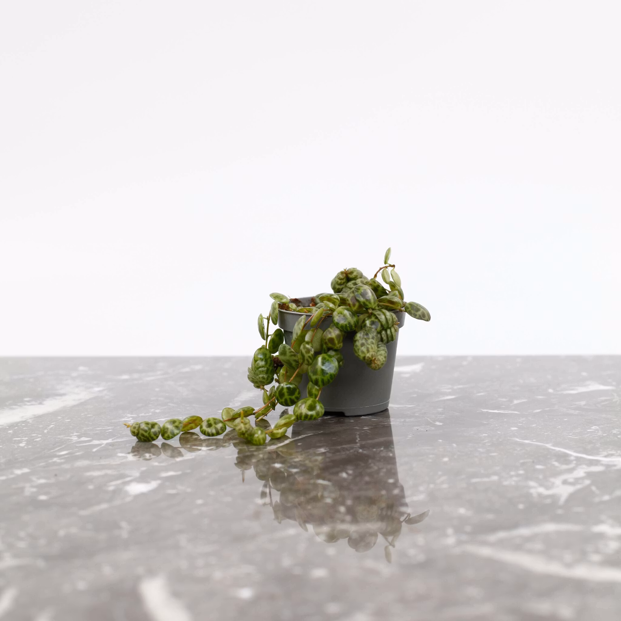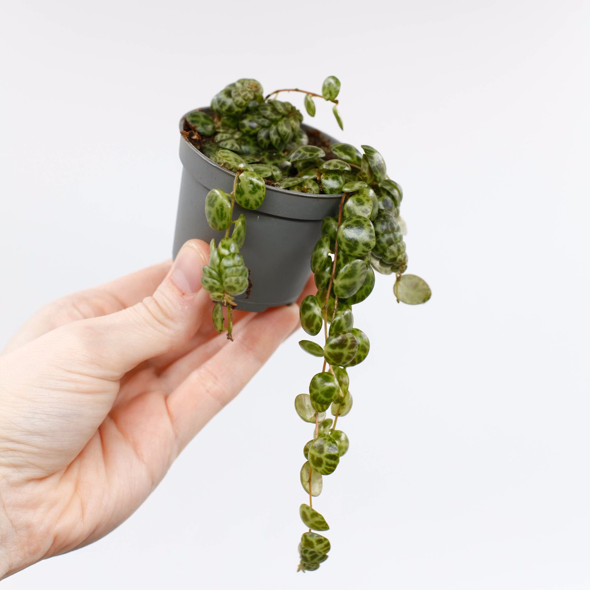 Peperomia prostrata, även känd som "String of Turtles", är en charmig och kompakt växt som kännetecknas av sina små, rundade blad med ett vackert mönster som påminner om sköldpaddsskal. Bladen har en grön färg med en silvrig nyans och ett unikt, distinkt mönster som gör denna växt till ett verkligt blickfång. Peperomia prostrata är en lågväxande, krypande växt som passar bra i ampel eller på hyllor där den kan sprida sig elegant. Den är perfekt för att ge en vacker, grön accent till inomhusmiljöer.