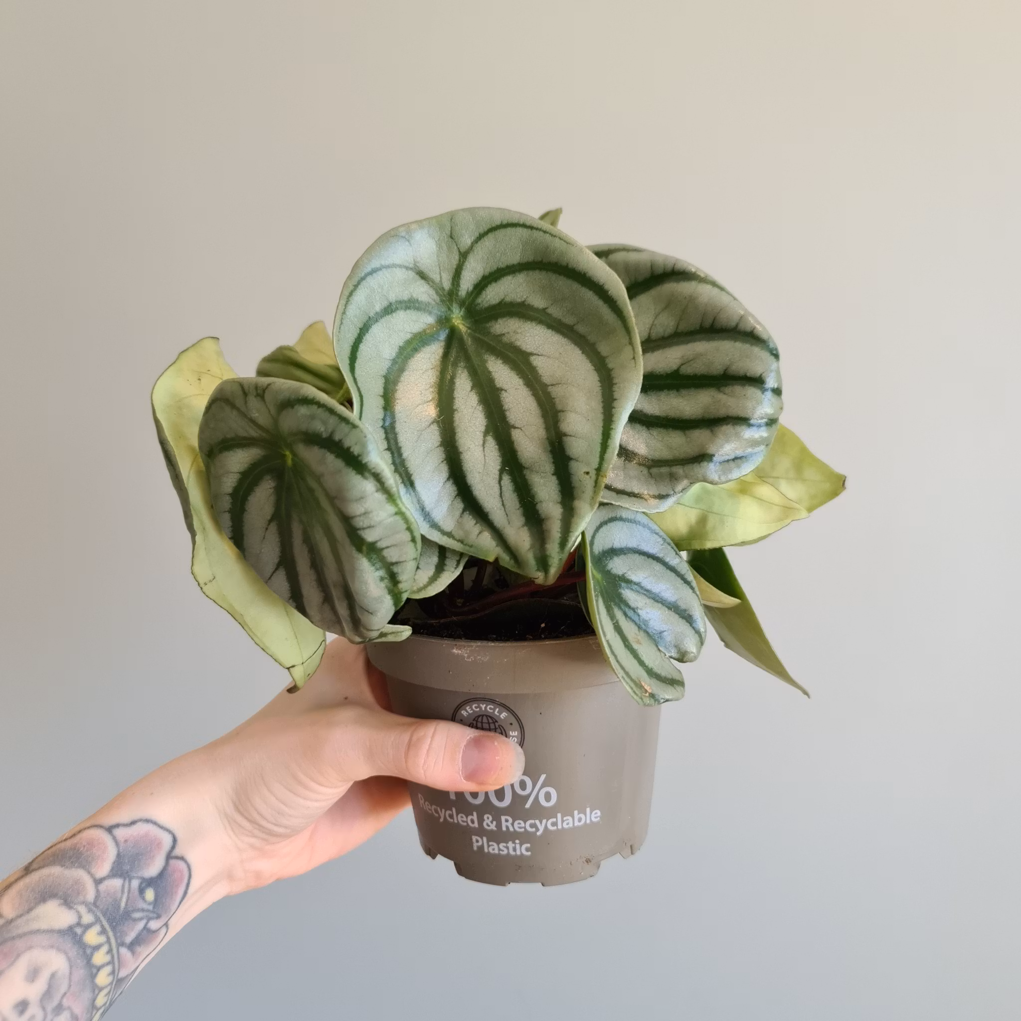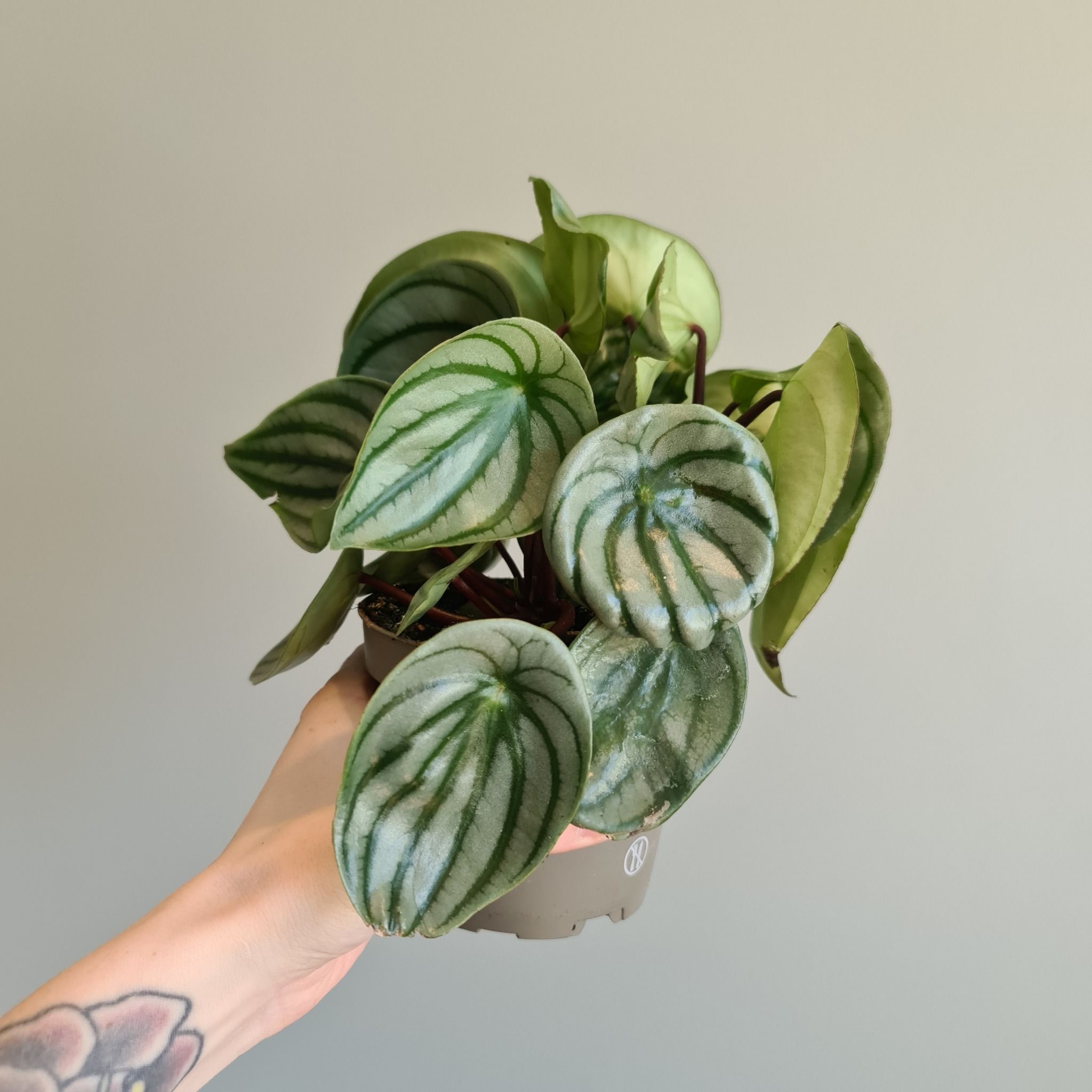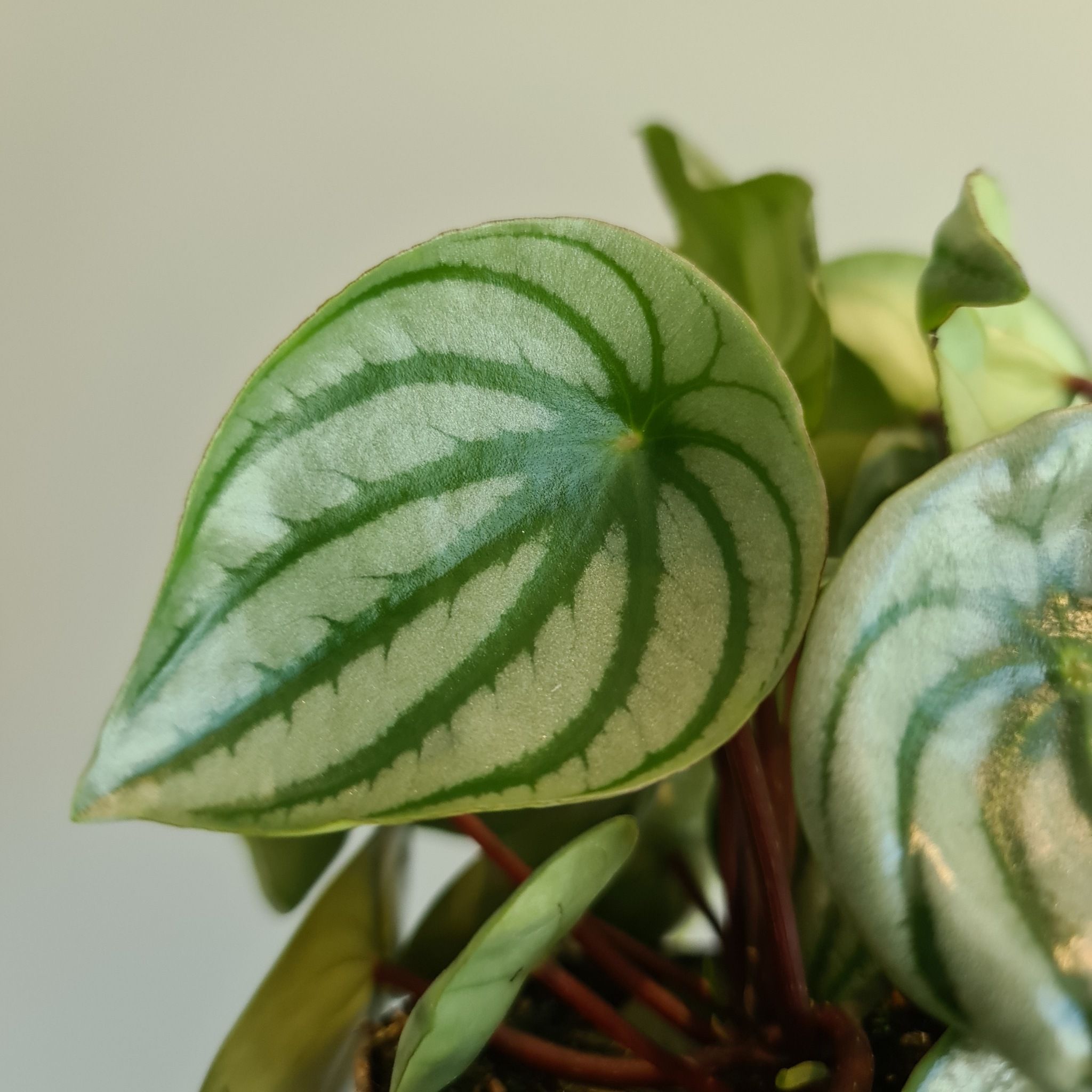 Peperomia 'Watermelon' är en iögonfallande och dekorativ växt med sina karakteristiska blad som liknar ett vattenmelonskal. Bladen har en grön grundfärg med ett vackert, silverfärgat mönster och mörkare gröna kanter, vilket ger växten ett fräscht och stiligt utseende. Peperomia 'Watermelon' har ett kompakt växtsätt och växer långsamt, vilket gör den idealisk för att placeras på hyllor eller i mindre krukor. Den är både lättskött och tålig, vilket gör den till en populär växt i många hem.
