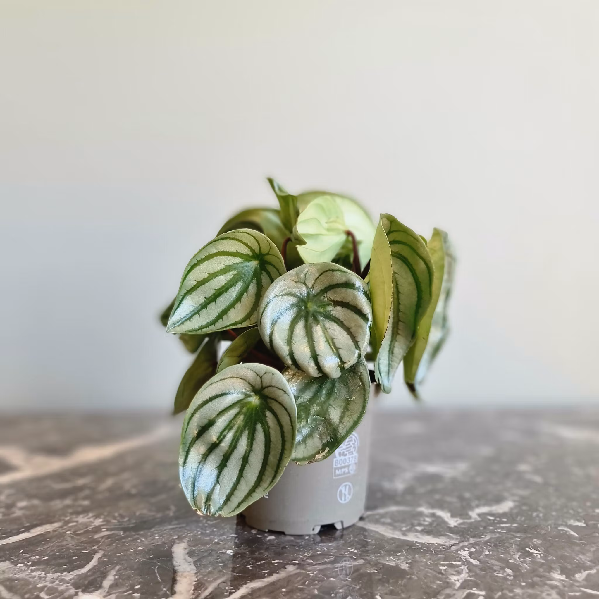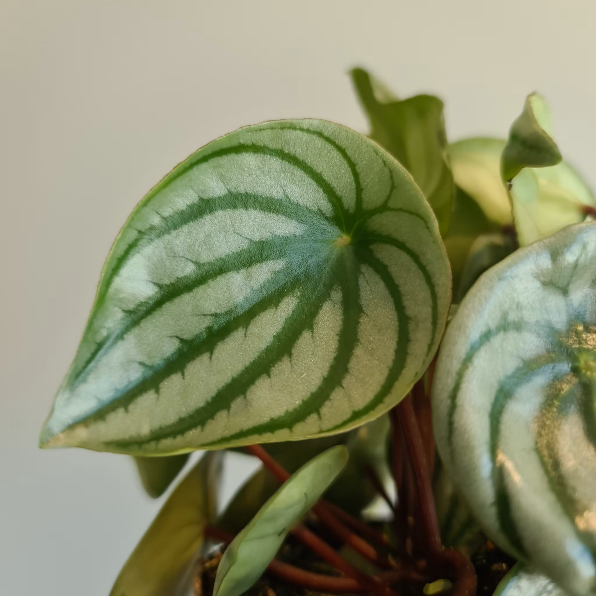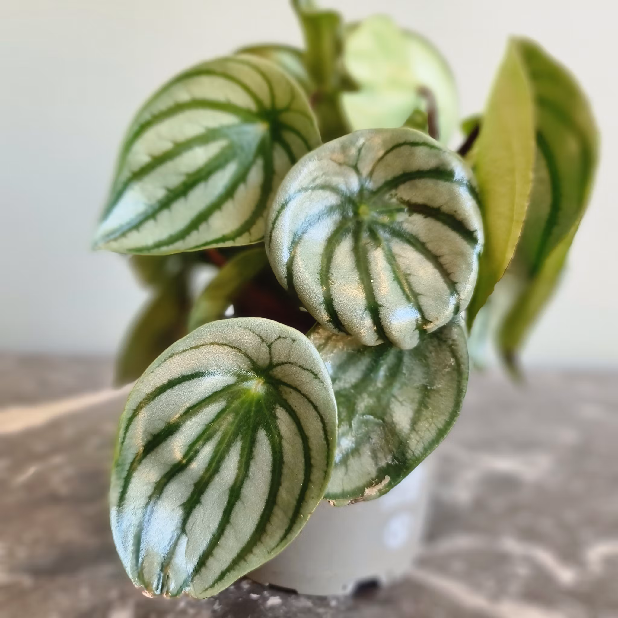 Peperomia 'Watermelon' är en populär krukväxt som kännetecknas av sina vackra, melonklingande blad med silverfärgade mönster och mörkgröna kanter. Den är känd för sitt långsamma växtsätt och sitt kompakta utseende, vilket gör den idealisk för både små och stora utrymmen.