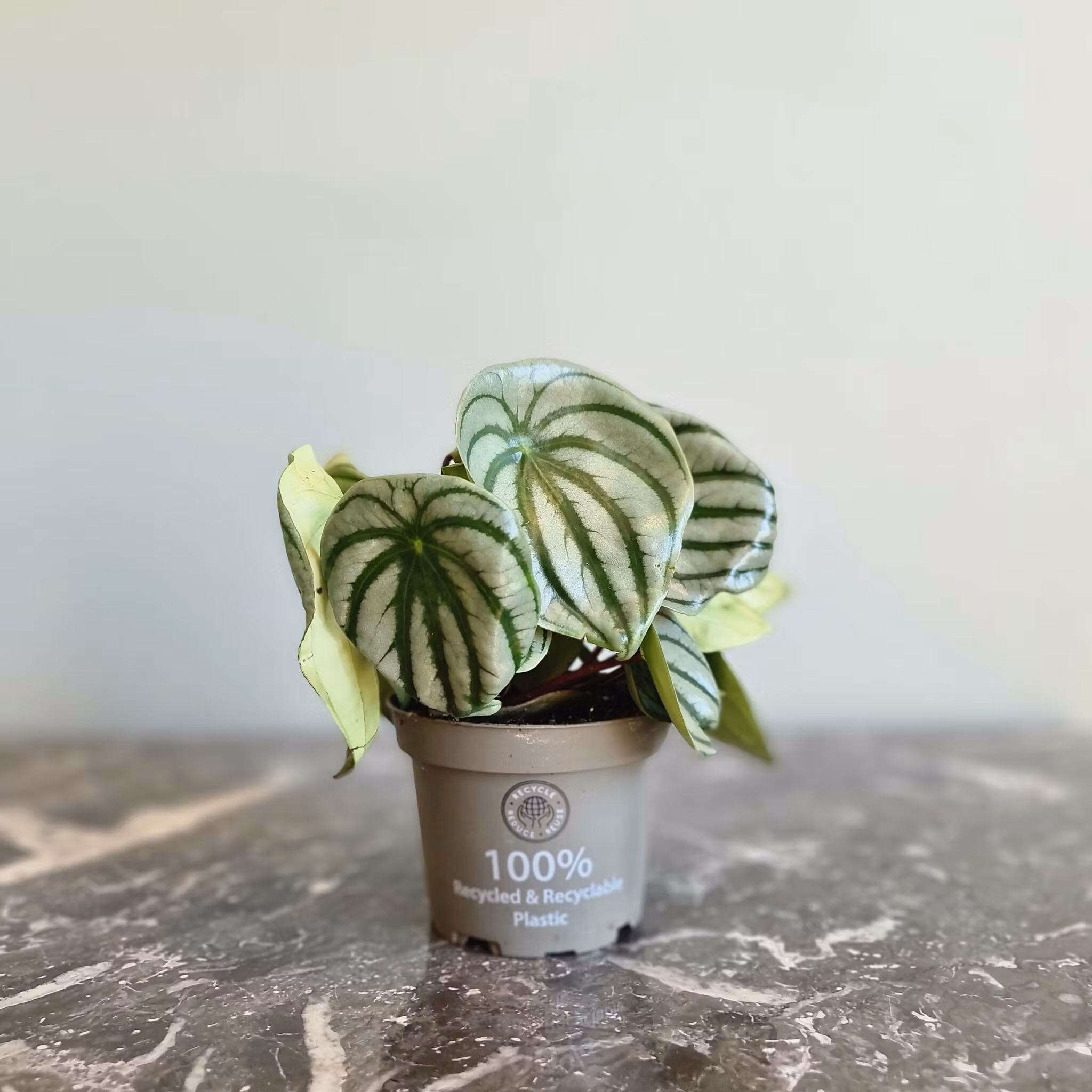 Peperomia argyreia 'Watermelon' 12 cm är en lättskött radiatorört med glansiga blad, perfekt för halvskugga. Vattna sparsamt och njut av dess skönhet.