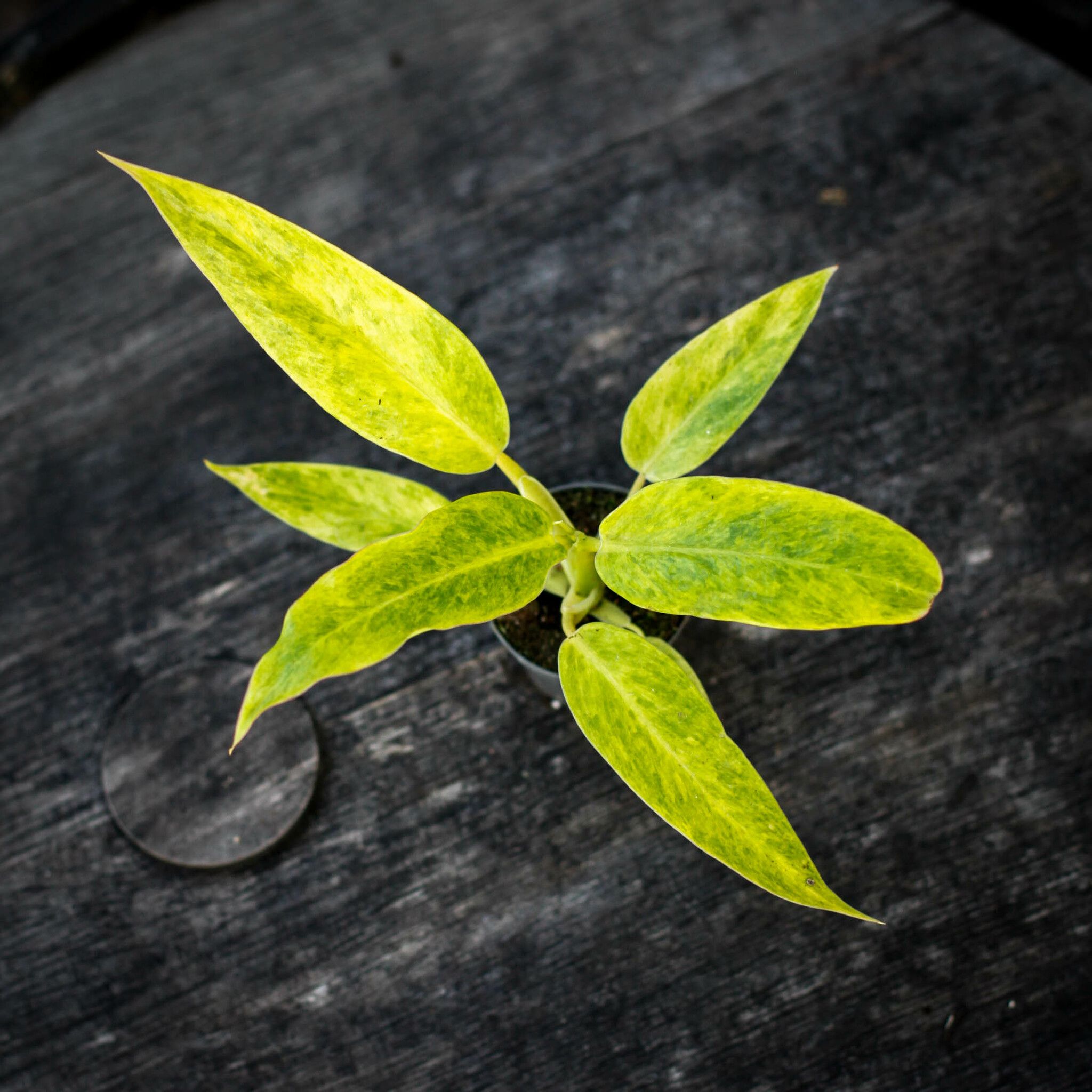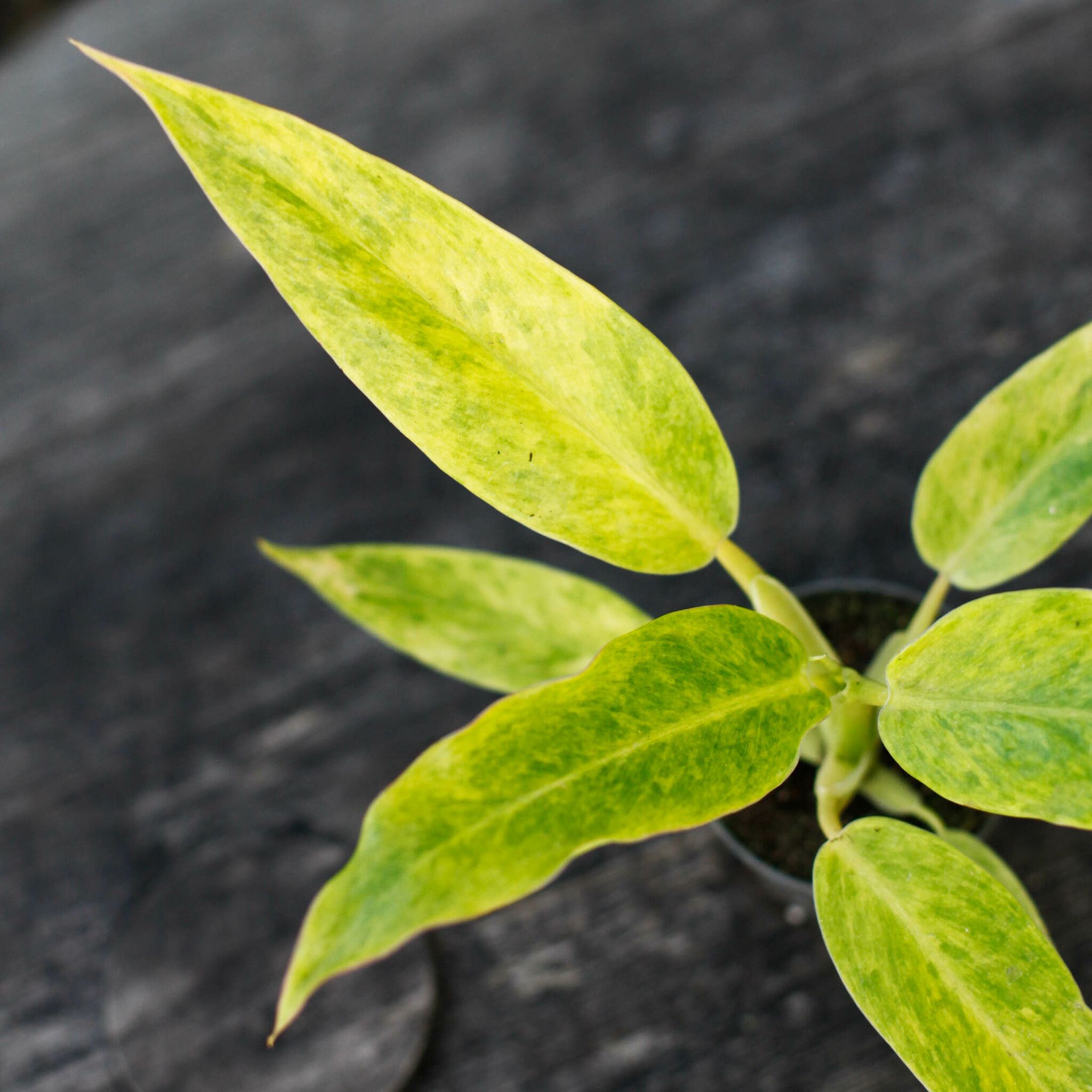 Philodendron ’Calkins Gold’ - En tropisk skönhet med gyllengula blad. Perfekt för ljusa inomhusmiljöer och enkel att sköta. Köp hos Klorofyllverket.se.