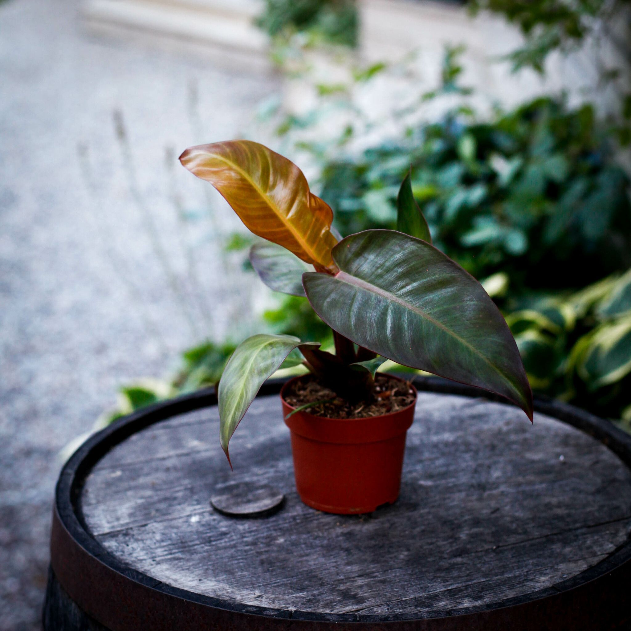 Philodendron 'Red Sun' En färgsprakande juvel bland philodendron – 'Red Sun' utmärker sig med sina eldiga röda till kopparfärgade nya blad som gradvis mognar till djupgrönt. En kompakt och lättskött växt som ger dramatik och värme till varje grön samling.