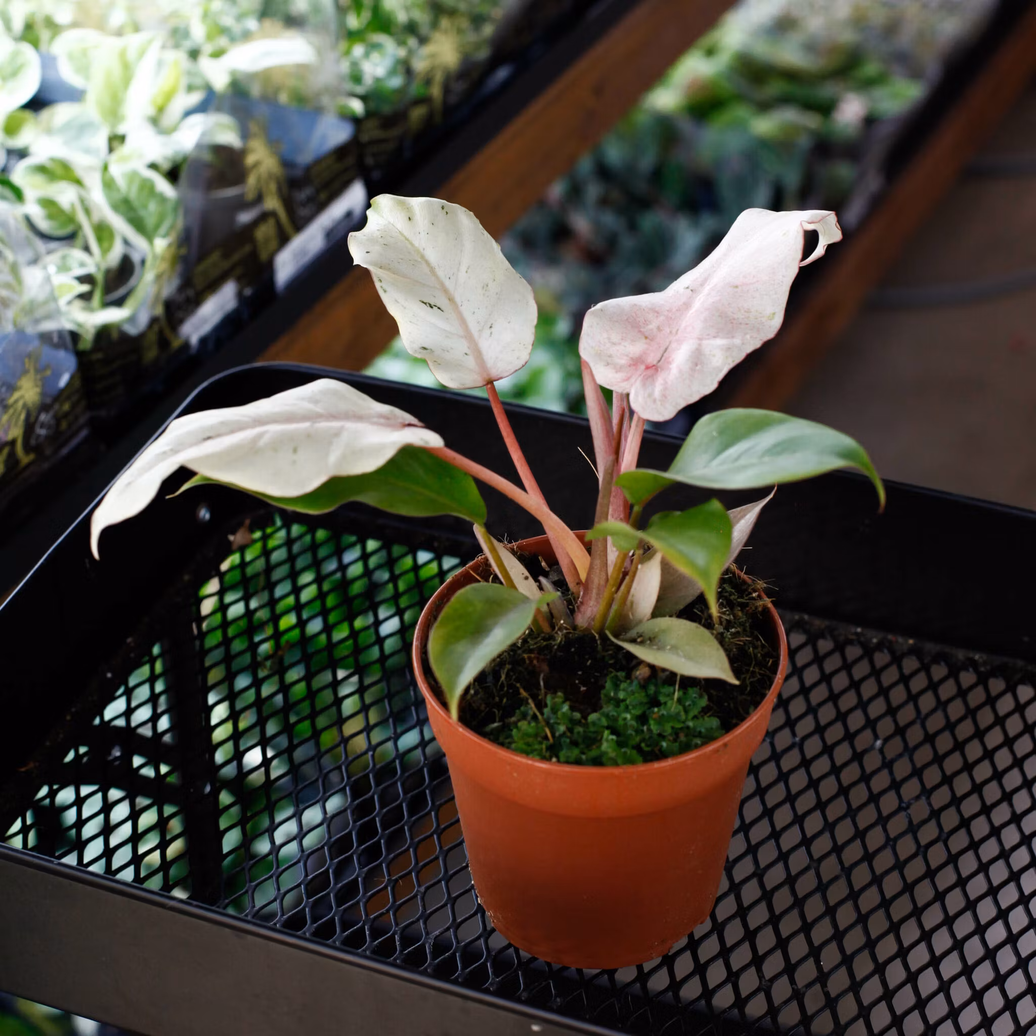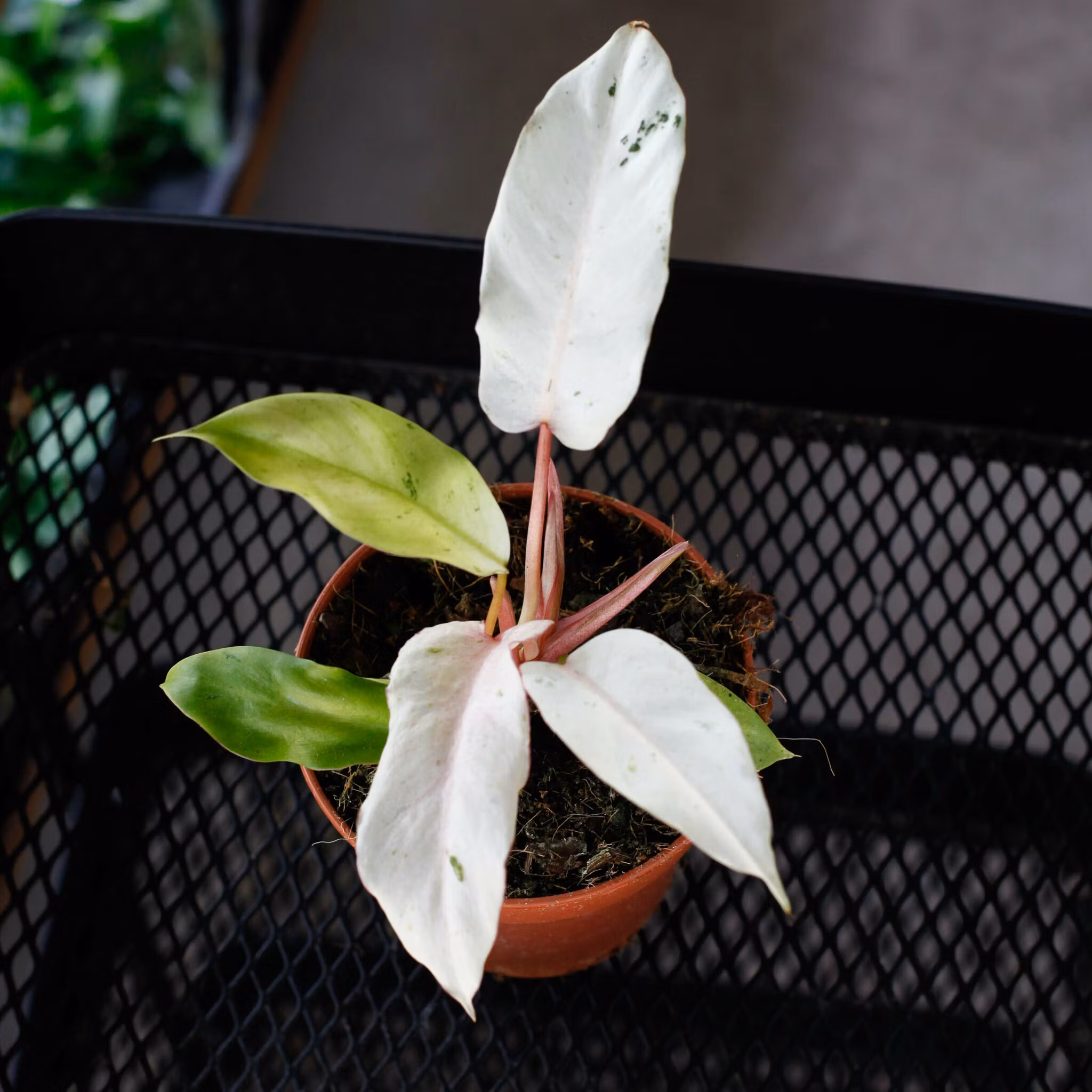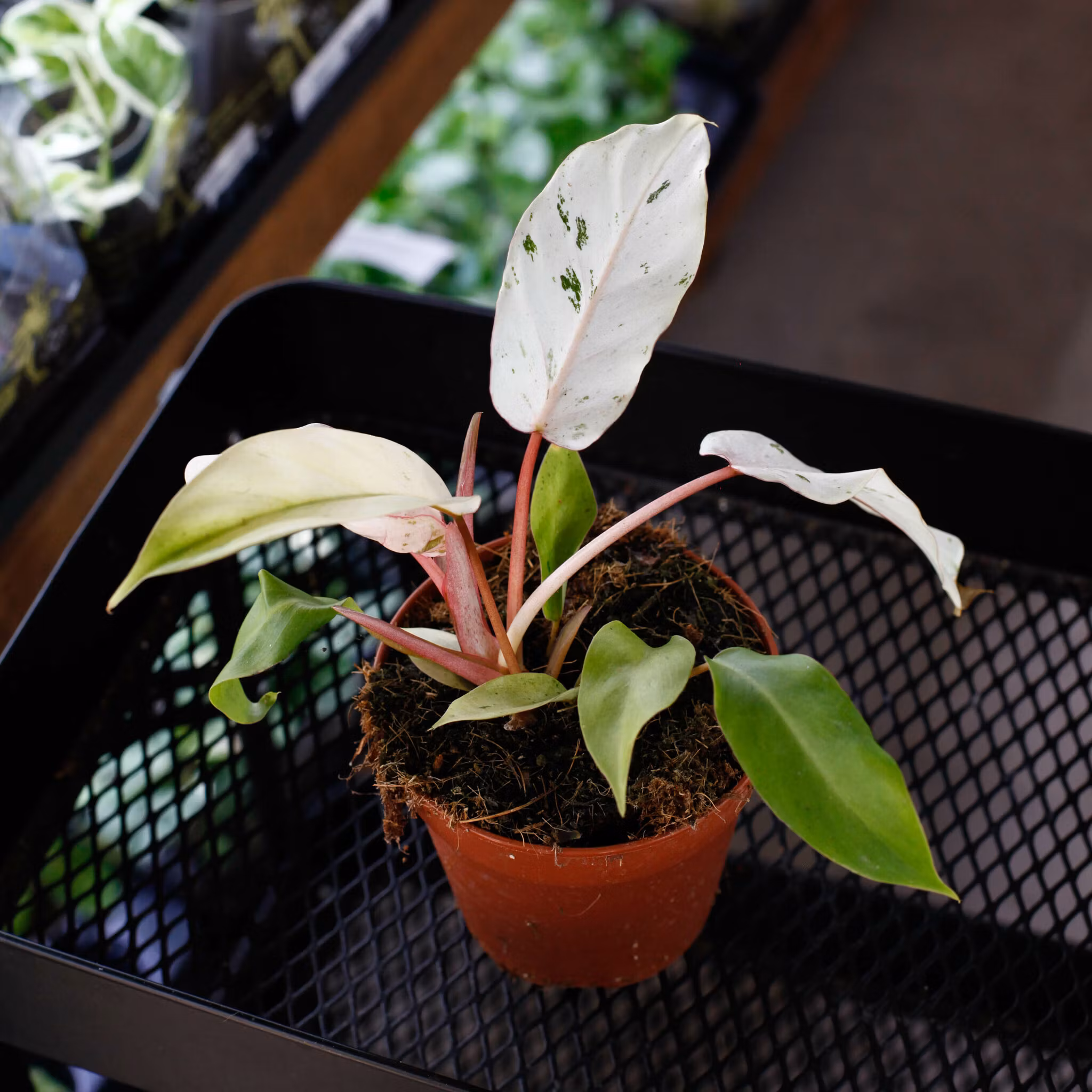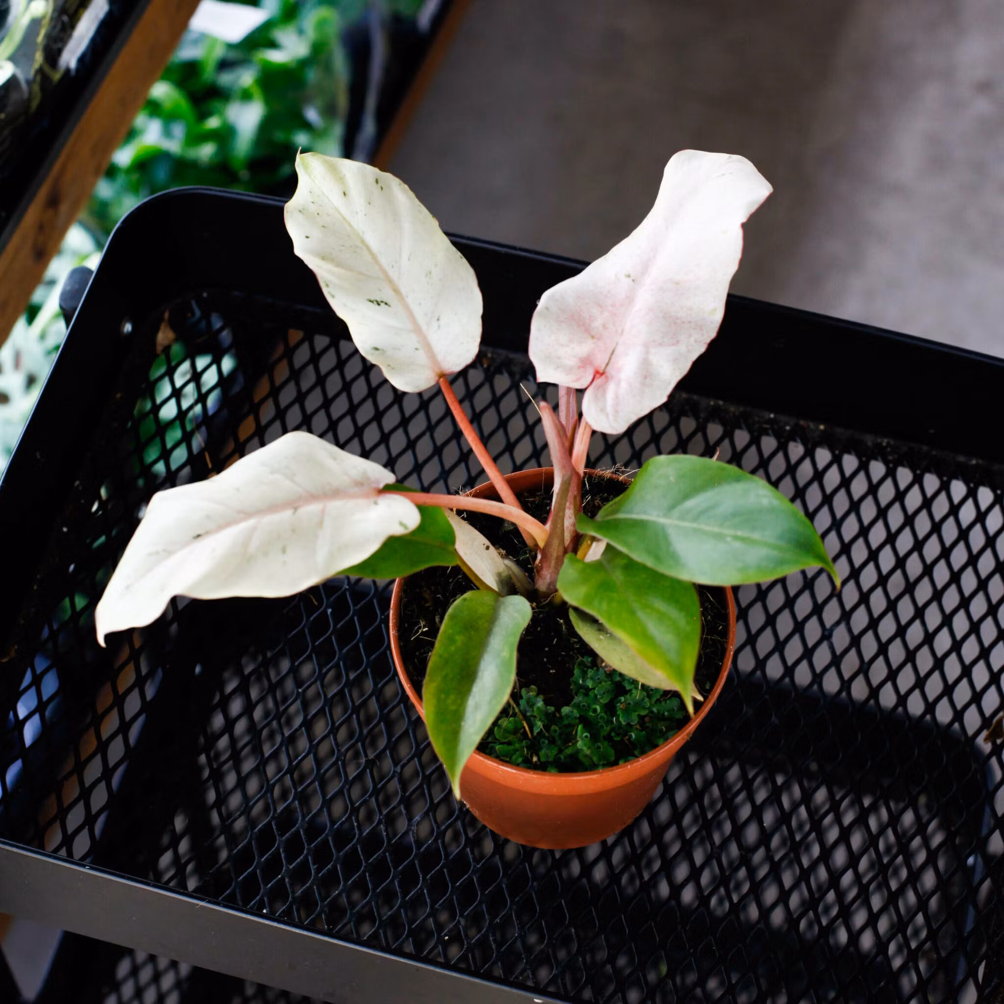 Philodendron 'Snowdrift' erbjuder unika krämvita och ljusgröna blad med rosa inslag. Perfekt för samlare som söker en exotisk och iögonfallande växt.