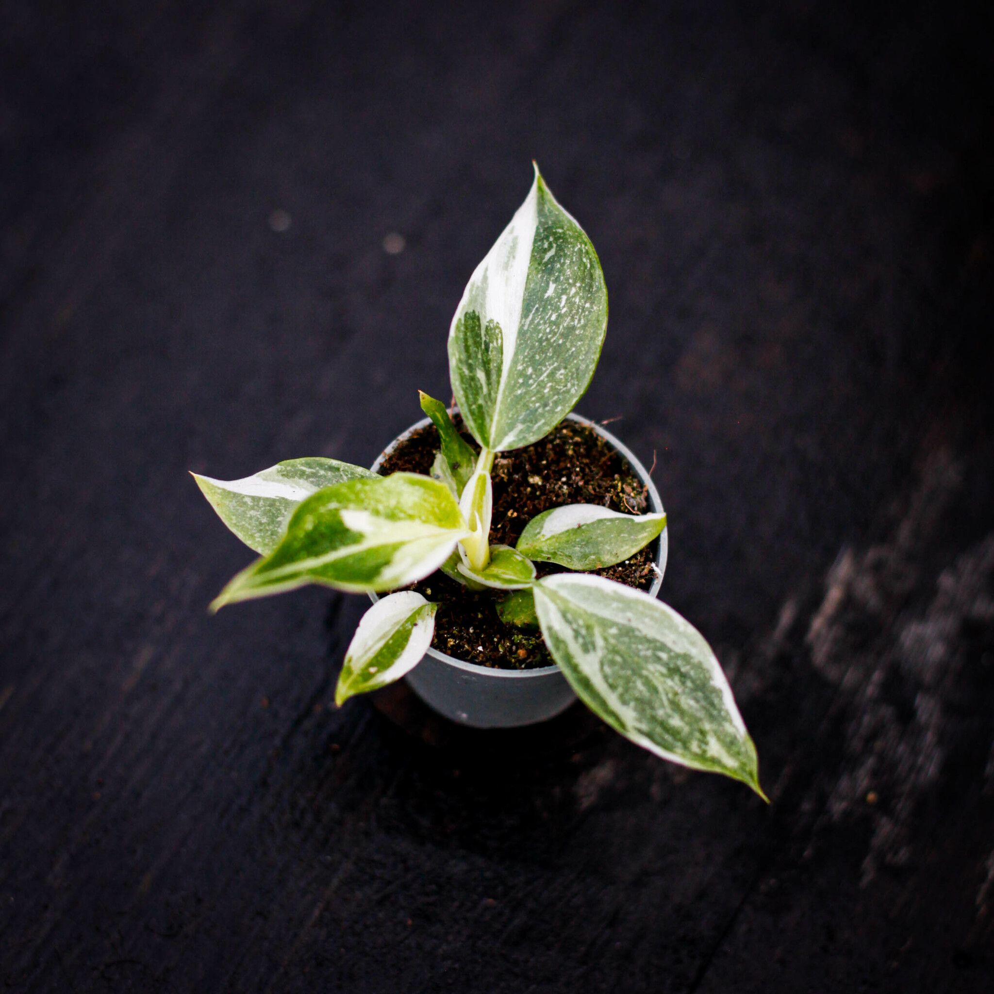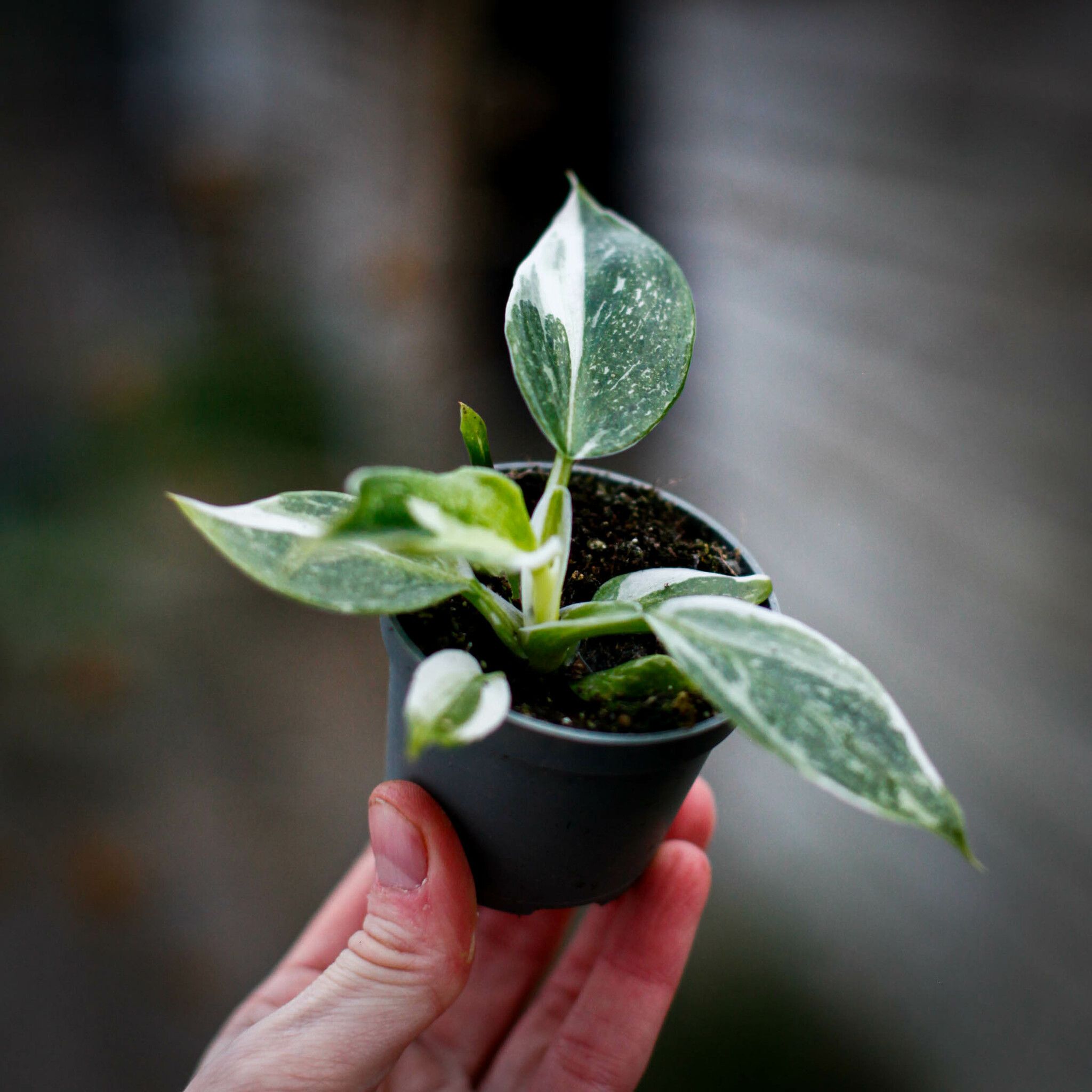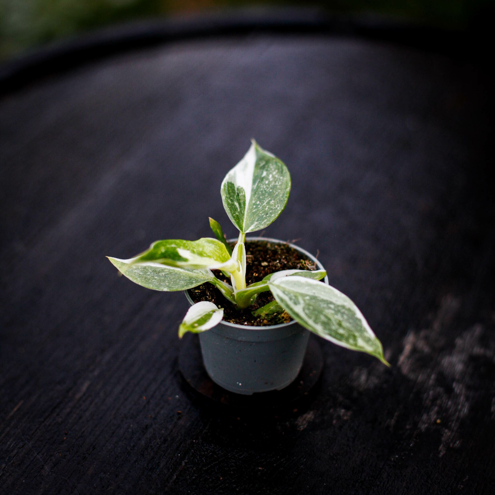 Philodendron 'White Wizard' 6 cm, en elegant krukväxt med variegerade blad i vitt och grönt. Perfekt för indirekt ljus och hög luftfuktighet. En raritet!