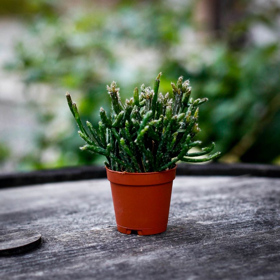 Rhipsalis burchellii, även känd som mistelkaktus, är en epifytisk kaktus idealisk för inomhusmiljöer. Perfekt i ampel med sina hängande, gröna skott.