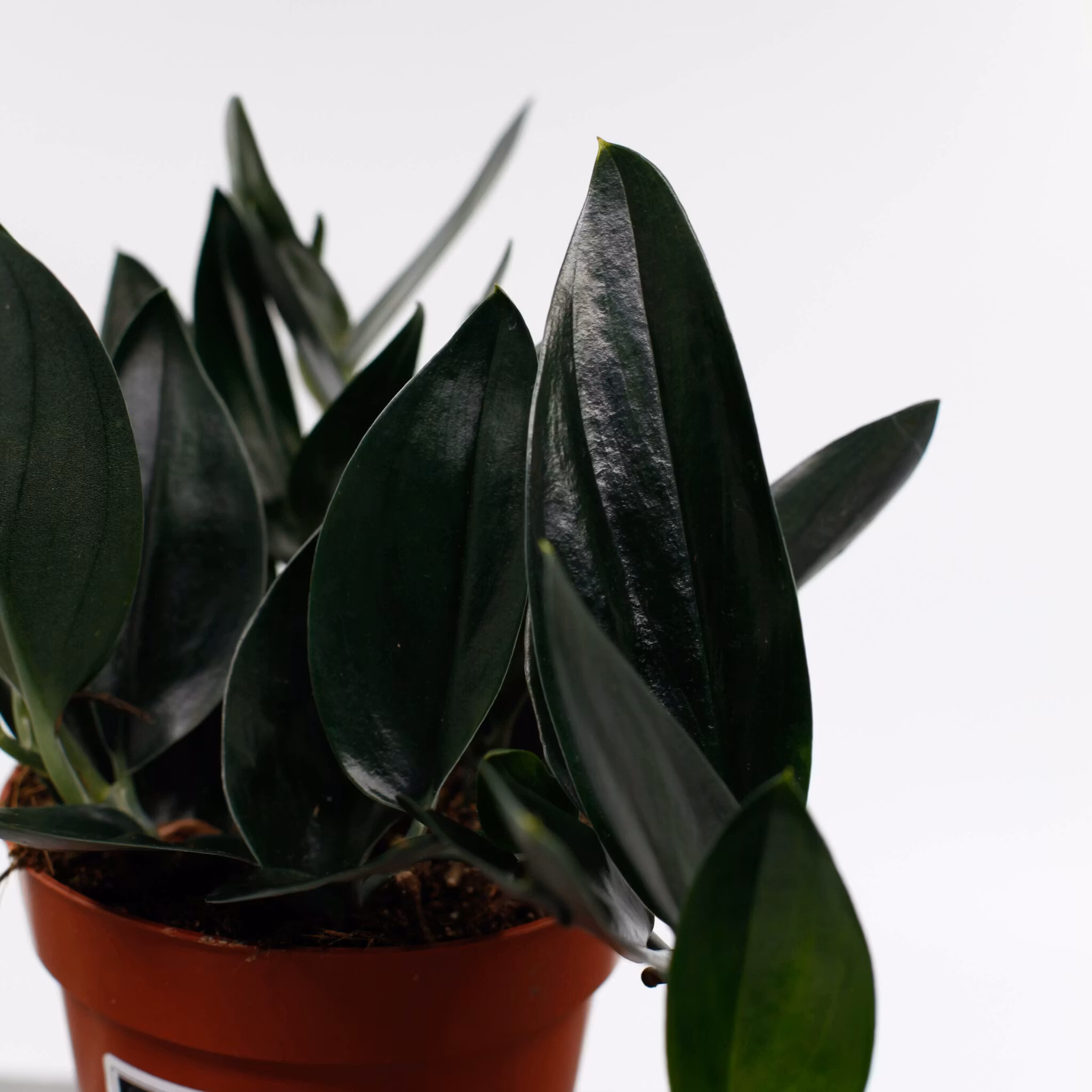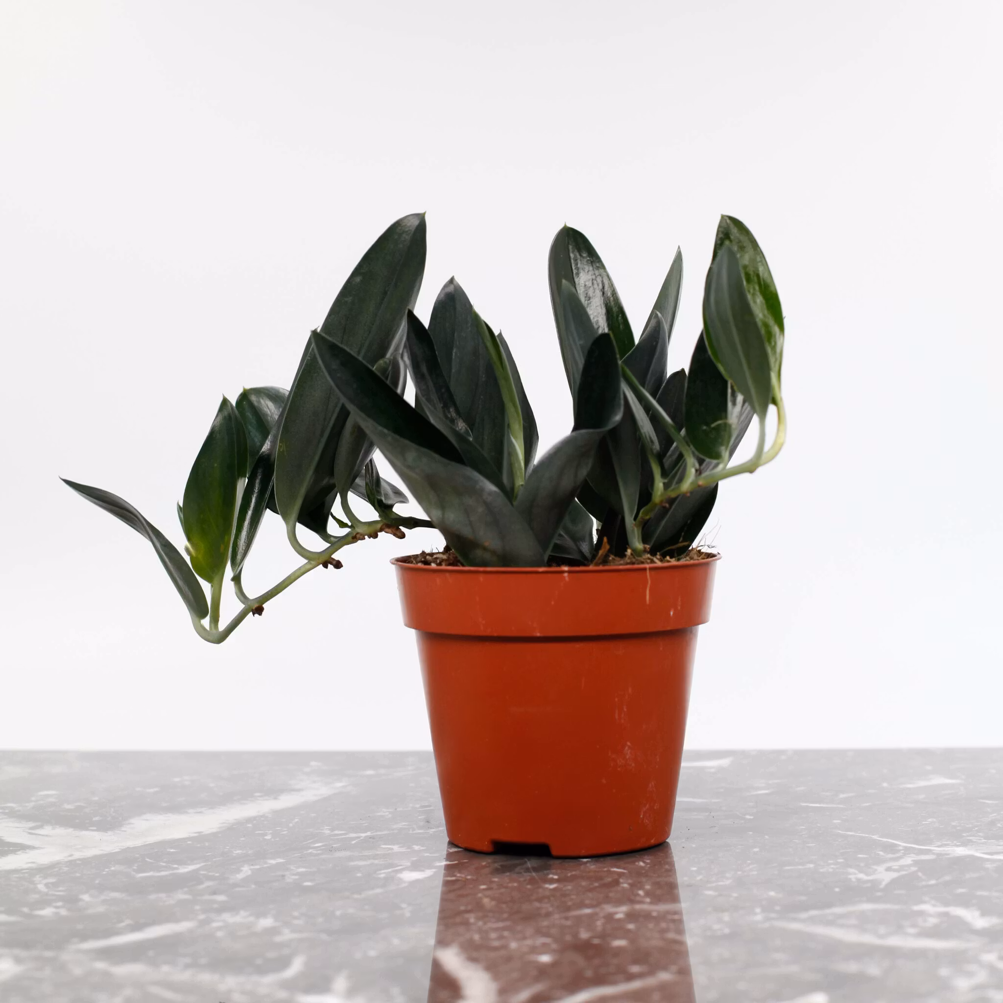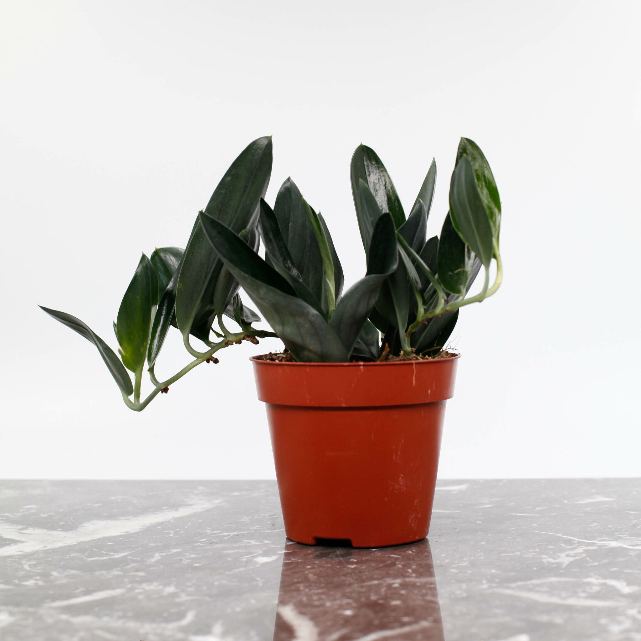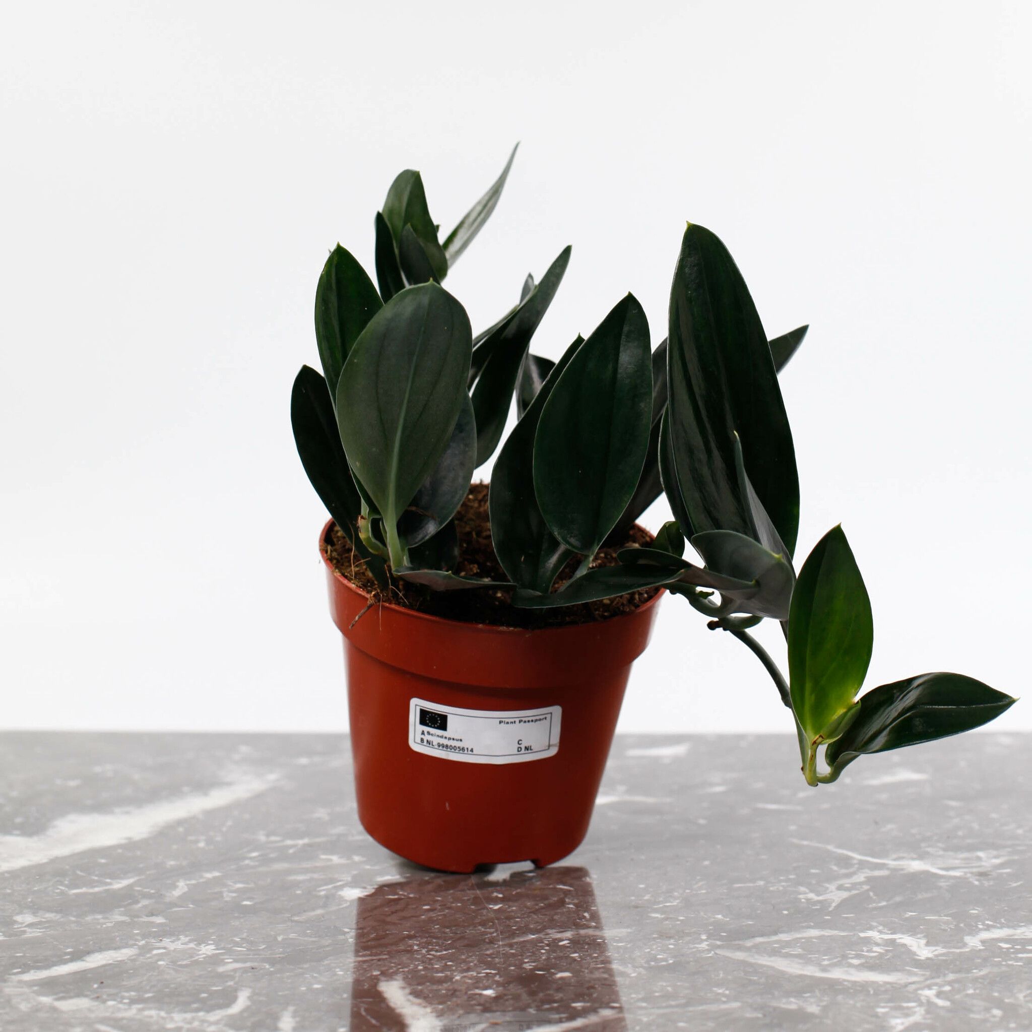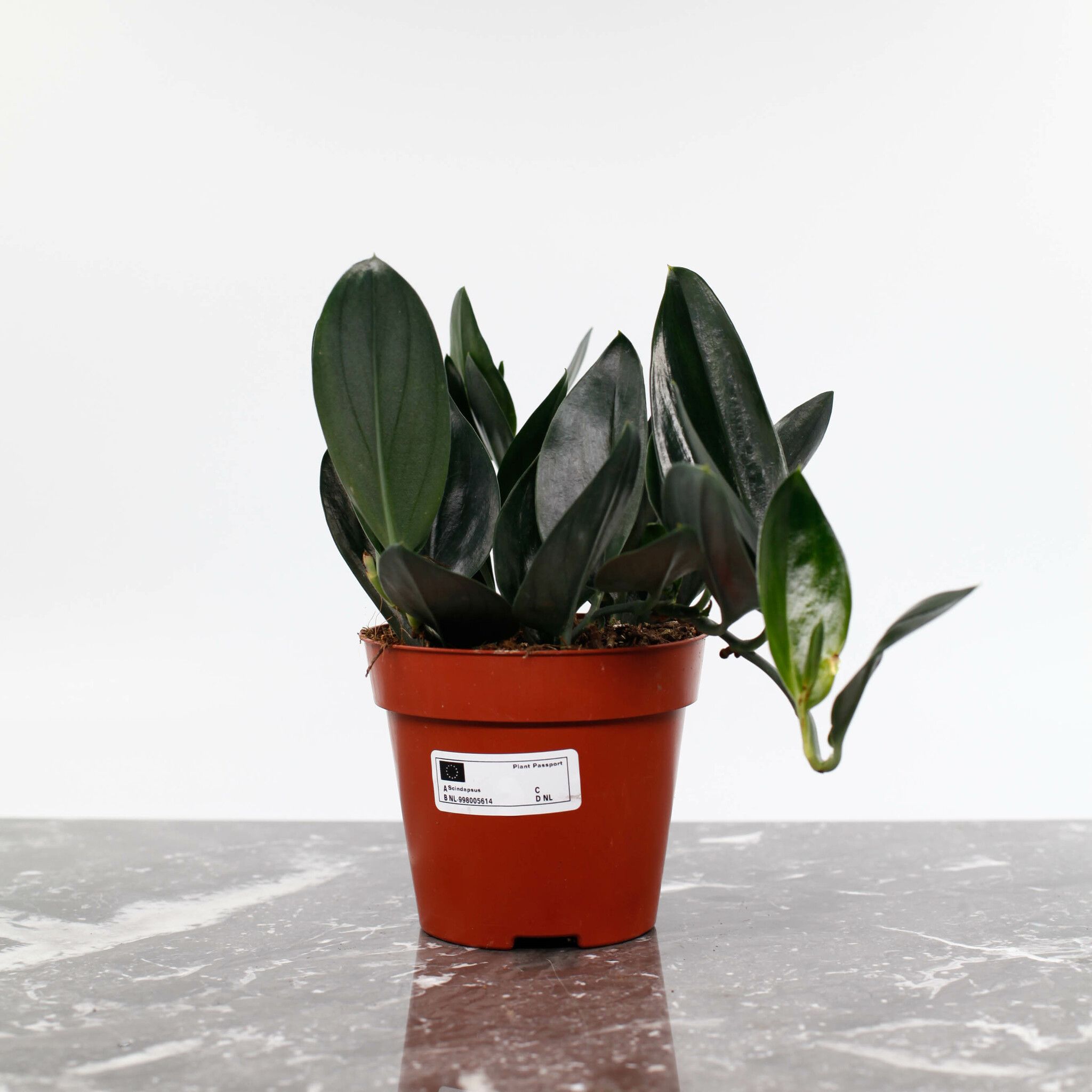 Scindapsus 'Dark Form' är en elegant och ståtlig växt med djupgröna, hjärtformade blad som har en mörkare, nästan svartaktig ton. De glänsande bladen är vackert marmorerade med subtila silverfärgade ådror, vilket ger en sofistikerad kontrast mot den mörka grönskan. Denna klätterväxt växer snabbt och kan användas för att dekorera väggar, hyllor eller i ampel, där dess vackra blad kan hänga fritt och skapa en tropisk känsla i ditt hem.Scindapsus treubii 'Dark Form' är en sällsynt och eftertraktad krukväxt som skapar en iögonfallande atmosfär med sina unika blad och mörka färg.