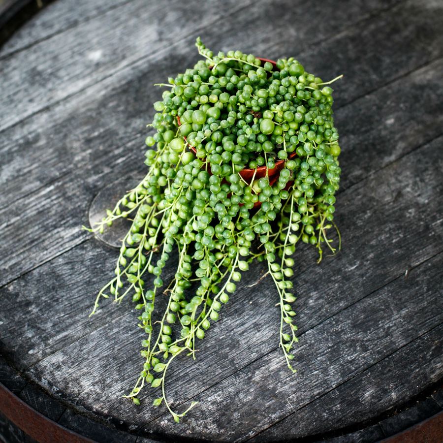 Senecio rowleyanus, även känd som "Ärtor på tråd", är en hängande suckulent med pärllika blad. Perfekt för amplar, den är lättskött och iögonfallande.
