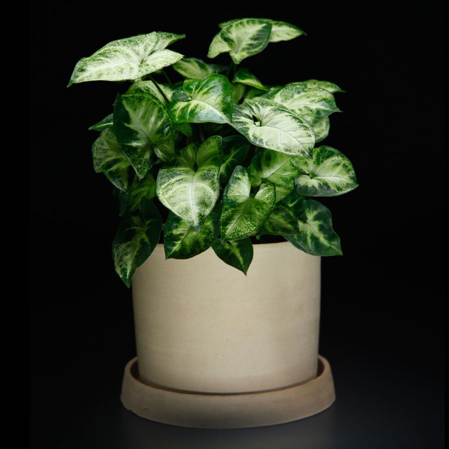 Syngonium 'Pixie' är en småväxt variant av den populära Syngonium, känd för sina dekorativa, hjärtformade blad som ofta har en vacker färgförändring från grön till ljusrosa eller vit när de mognar. Den kompakta storleken gör den perfekt för mindre utrymmen, samtidigt som den tillför en tropisk känsla till alla inomhusmiljöer. Den är lättskött och gör sig bra i både hängande krukor eller på hyllor där den kan sprida sina vackra, mönstrade blad.