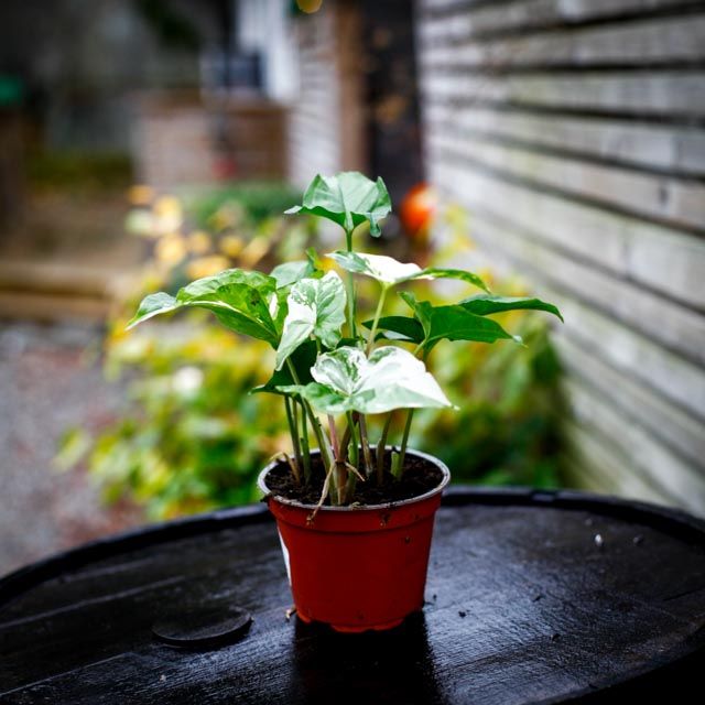 Syngonium podophyllum ’Albo Variegata’ är en tropisk klätterväxt inom familjen Araceae som härstammar från Central- och Sydamerika. Sorten är uppskattad för sina tydligt variegerade blad i grönt och vitt som ger ett levande, ljusreflekterande uttryck.