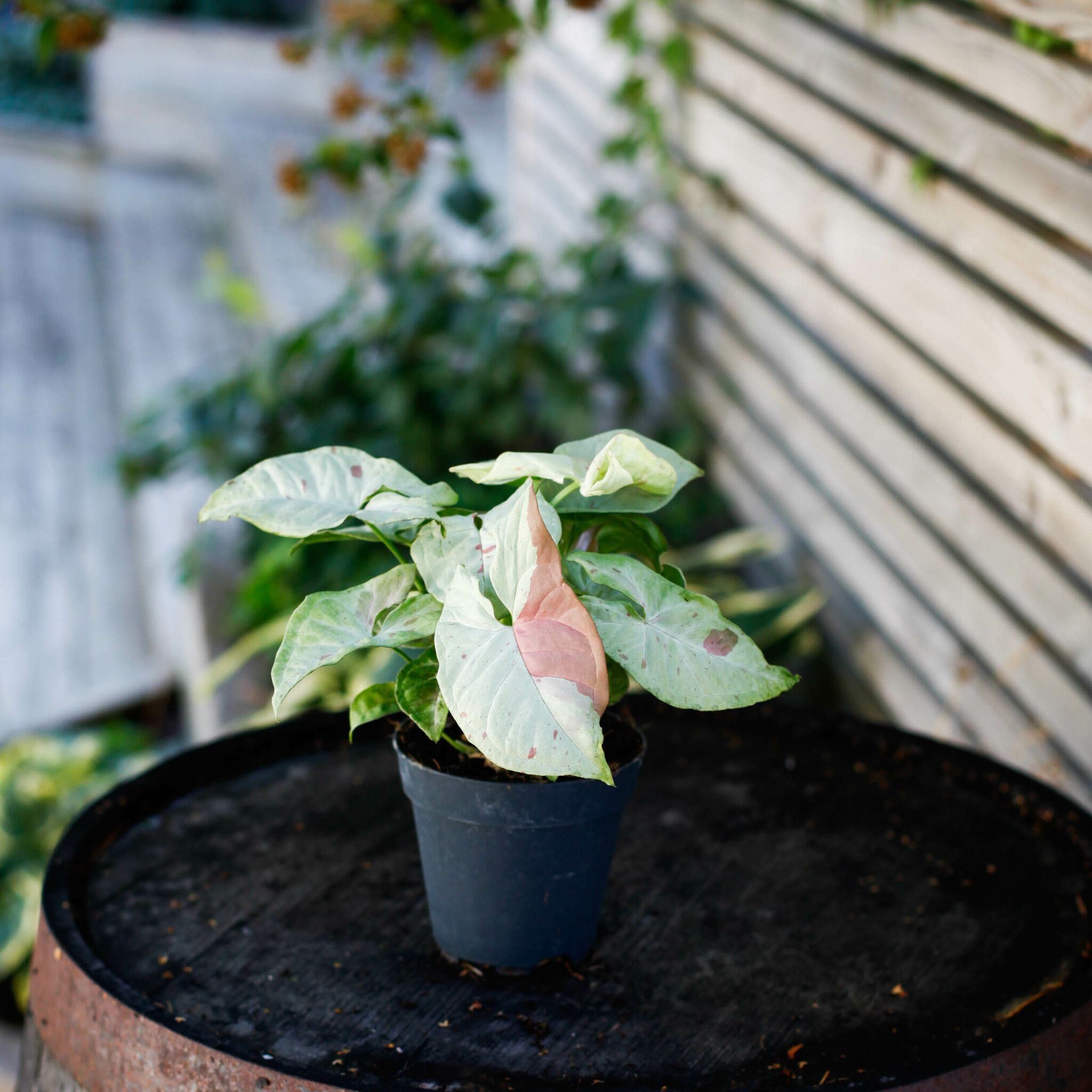 Syngonium 'Milk Confetti' är en särskilt dekorativ växt med sina marmorerade blad i krämigt vitt och grönt. Växten är kompakt och växer långsamt, vilket gör den perfekt för mindre utrymmen eller för att komplettera en samling tropiska växter. Den är både lättskött och stilfull, och ger en känsla av elegans till alla miljöer.