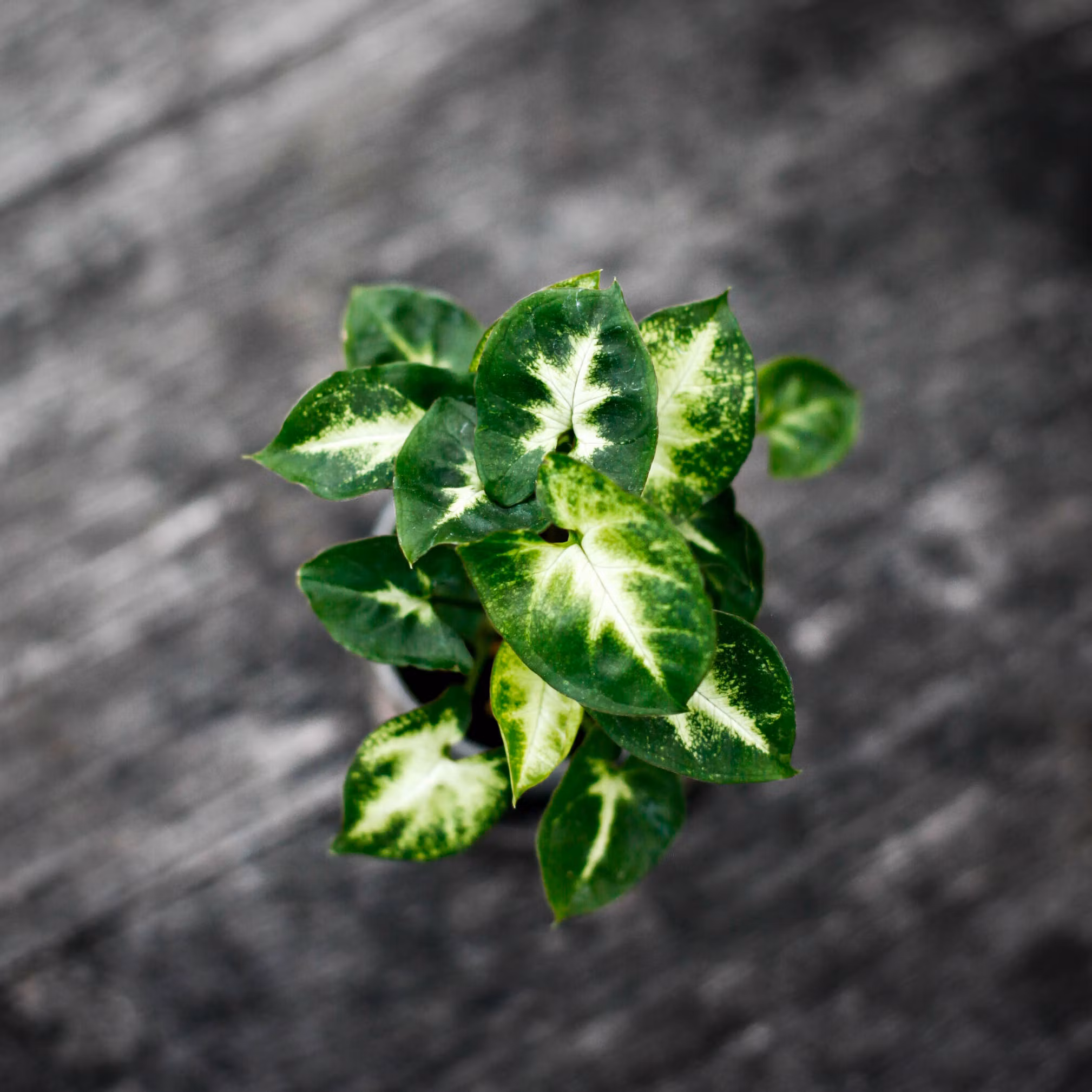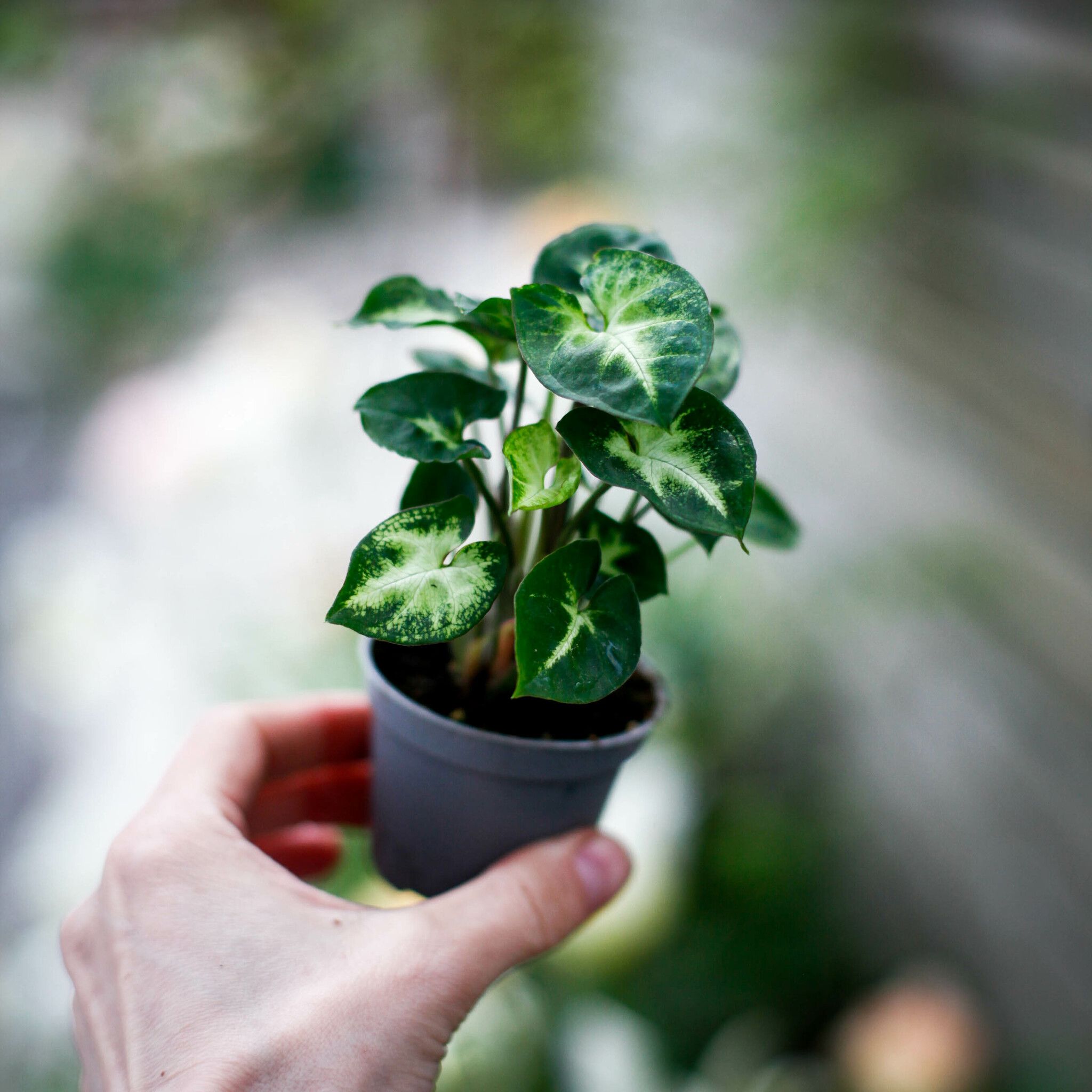 Syngonium 'Pixie'6 cm, är en kompakt växt med små, ljusgröna blad. Lättskött, trivs i indirekt ljus, perfekt för hyllor och små utrymmen.