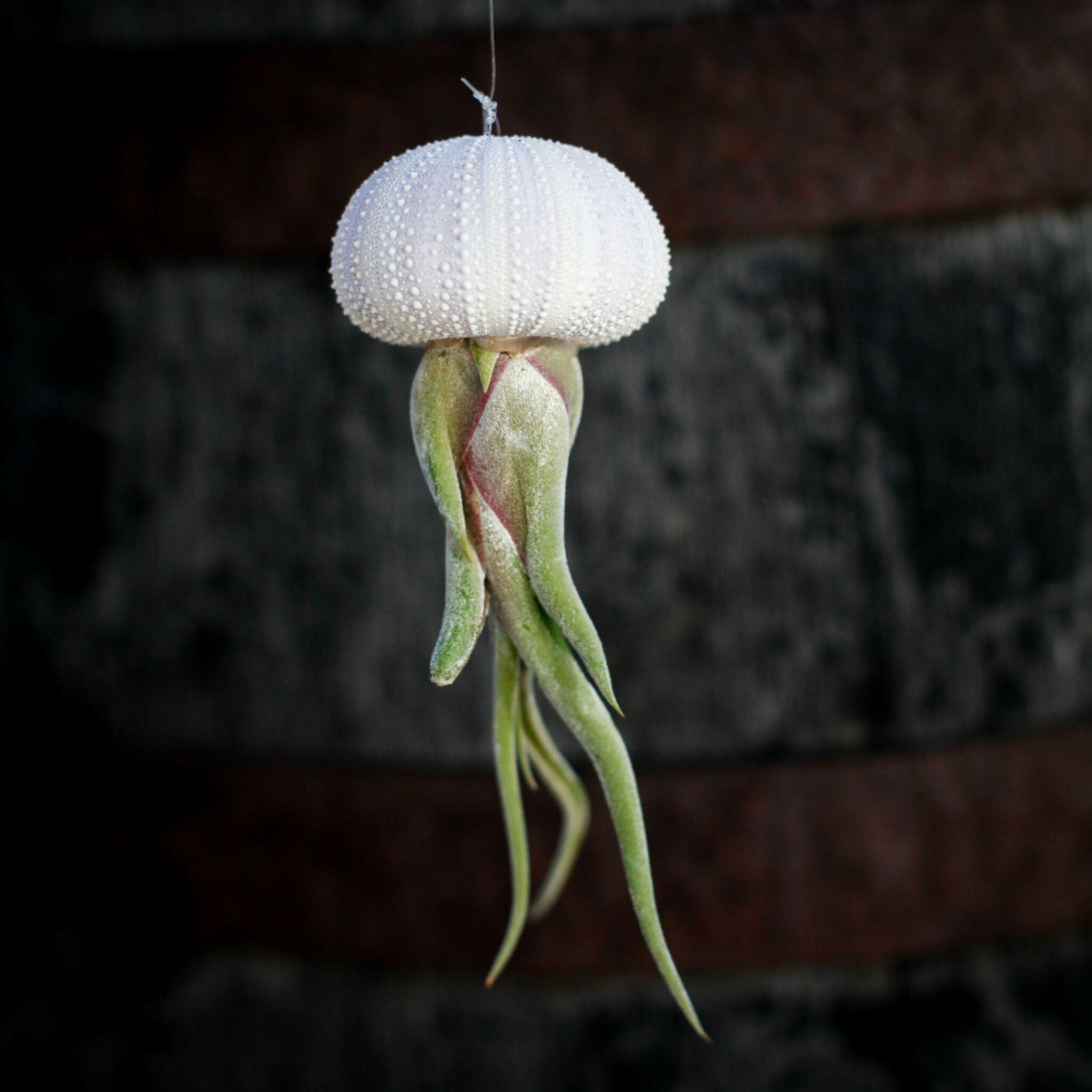 Tillandsia, även kallad luftplanta, är en unik epifyt som tar upp vatten och näring direkt från luften genom sina blad. När den kombineras med ett vackert sjöborreskal och hängs upp med en genomskinlig fiskelina, skapas en magisk och svävande effekt – perfekt för att ge ditt hem en stilfull och naturlig touch.