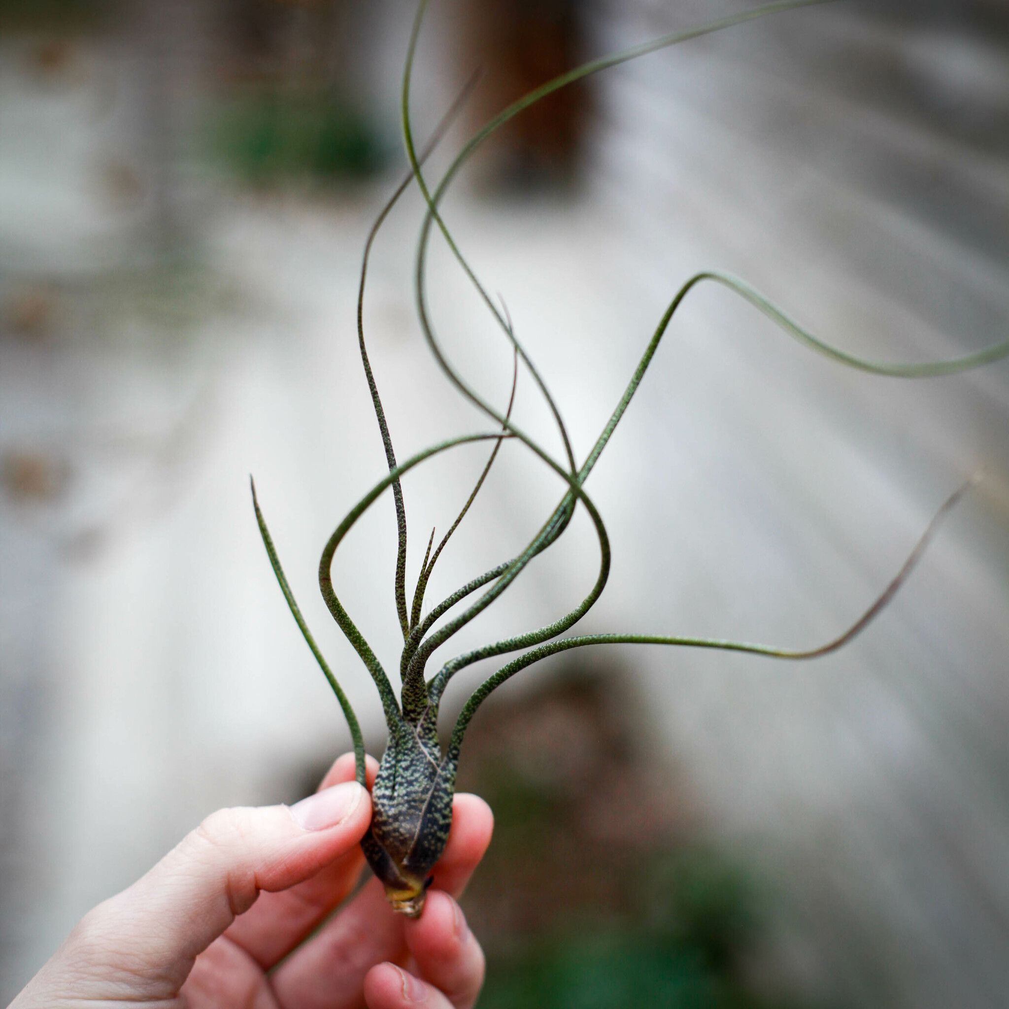 Tillandsia butzii: En silvrig luftväxt med smala blad, perfekt för tropisk inredning. Lättskött, kräver minimalt med vatten och trivs i indirekt ljus.