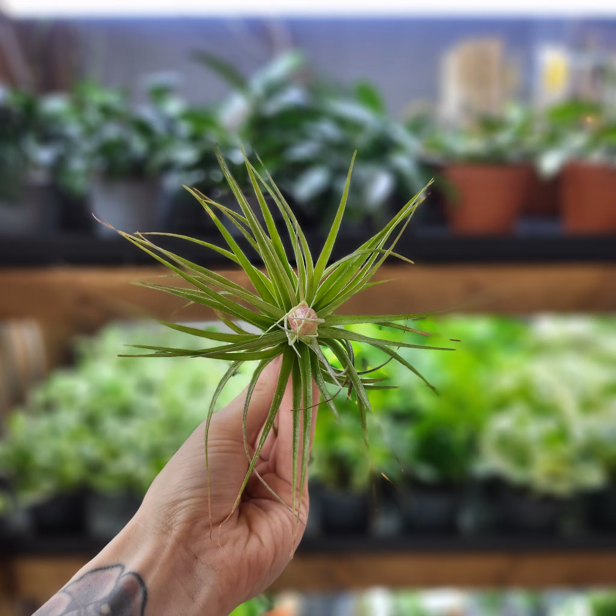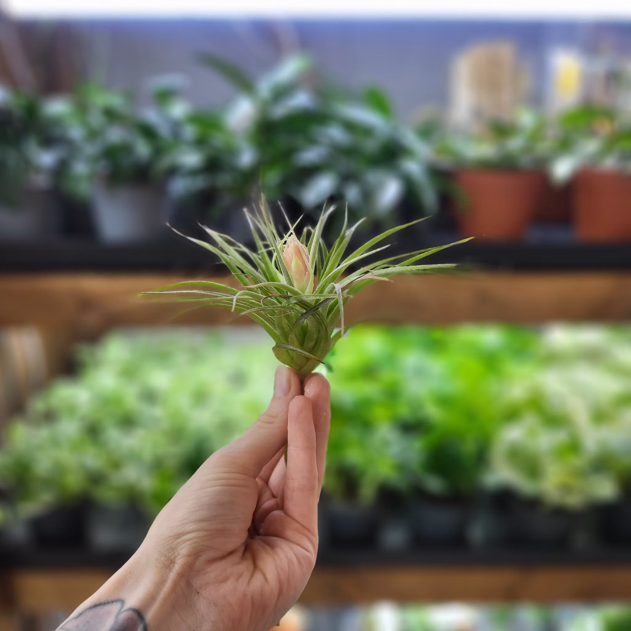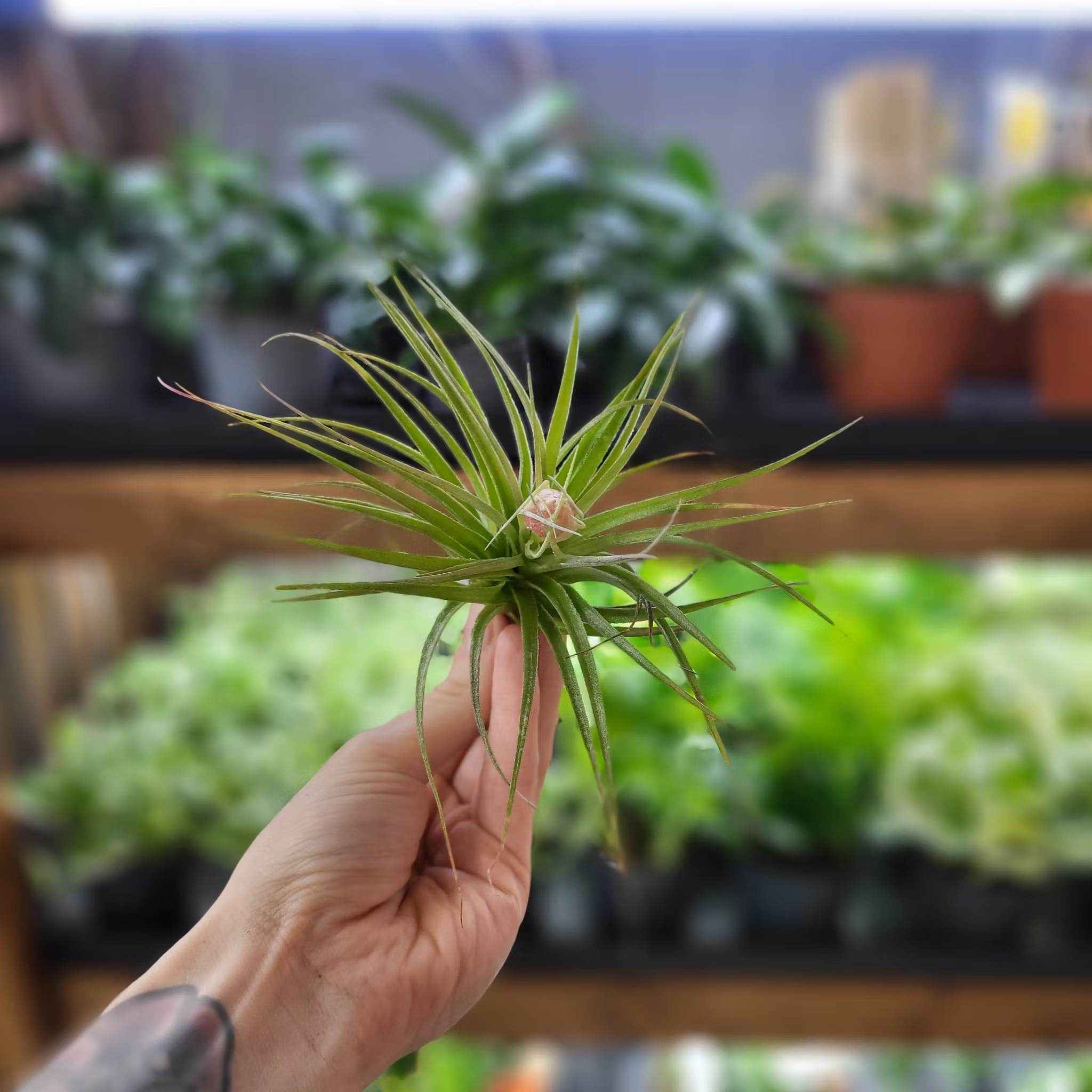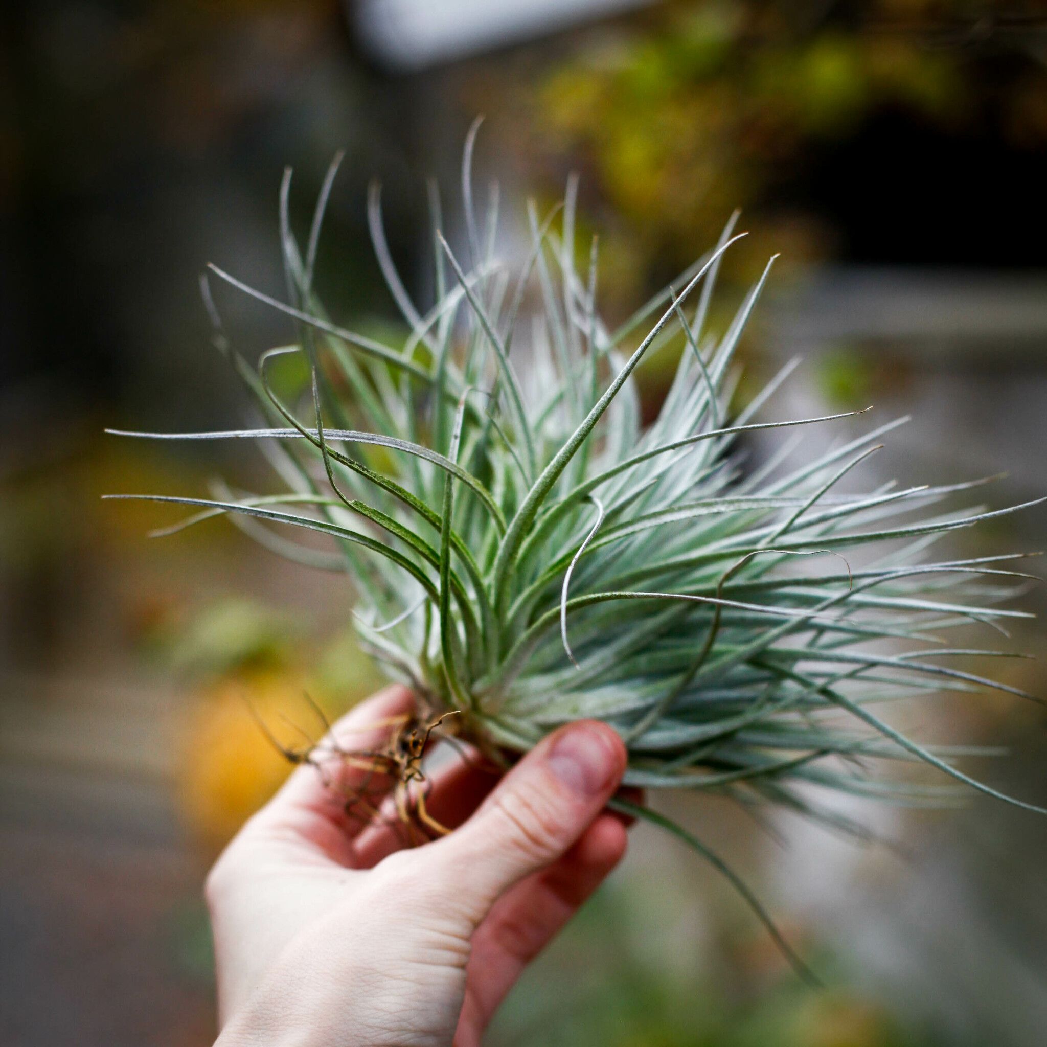 Tillandsia 'Cotton Candy' är en epifytisk luftplanta med silvergröna blad och rosa blomax. Perfekt för glaskupor och hängande arrangemang. Köp hos Klorofyllverk