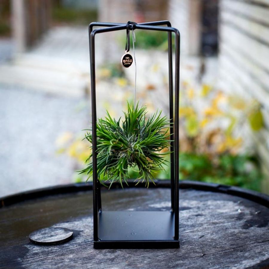Tillandsia i metallställning, även kallad luftplanta, är ett dekorativt arrangemang där en epifytisk växt placeras i en stilren svart metallställning. Tillandsior växer naturligt på träd och klippor i Central- och Sydamerika och tar upp fukt direkt från luften via sina blad. I denna produkt kan du välja mellan tre olika tillandsior, vilket gör det enkelt att hitta en variant som passar din stil och inredning.