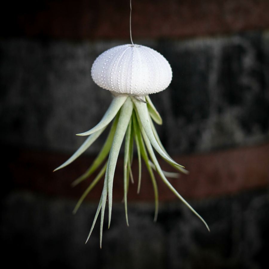 Tillandsia, även kallad luftplanta, är en unik epifyt som tar upp vatten och näring direkt från luften genom sina blad. När den kombineras med ett vackert sjöborreskal och hängs upp med en genomskinlig fiskelina, skapas en magisk och svävande effekt – perfekt för att ge ditt hem en stilfull och naturlig touch.