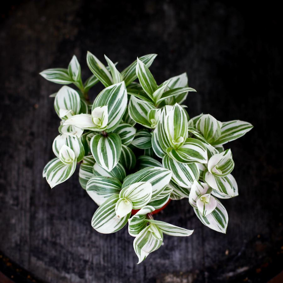 Tradescantia 'Brightness' är en charmig växt som imponerar med sina livfulla blad i ljusa gröna och silvriga toner. Dess blad har en vacker glans som reflekterar ljuset och ger växten en fräsch och luftig känsla. Den har ett spridande växtsätt och passar utmärkt som en ampelväxt eller för att placeras på en hylla där dess eleganta blad får fritt utrymme att utvecklas.