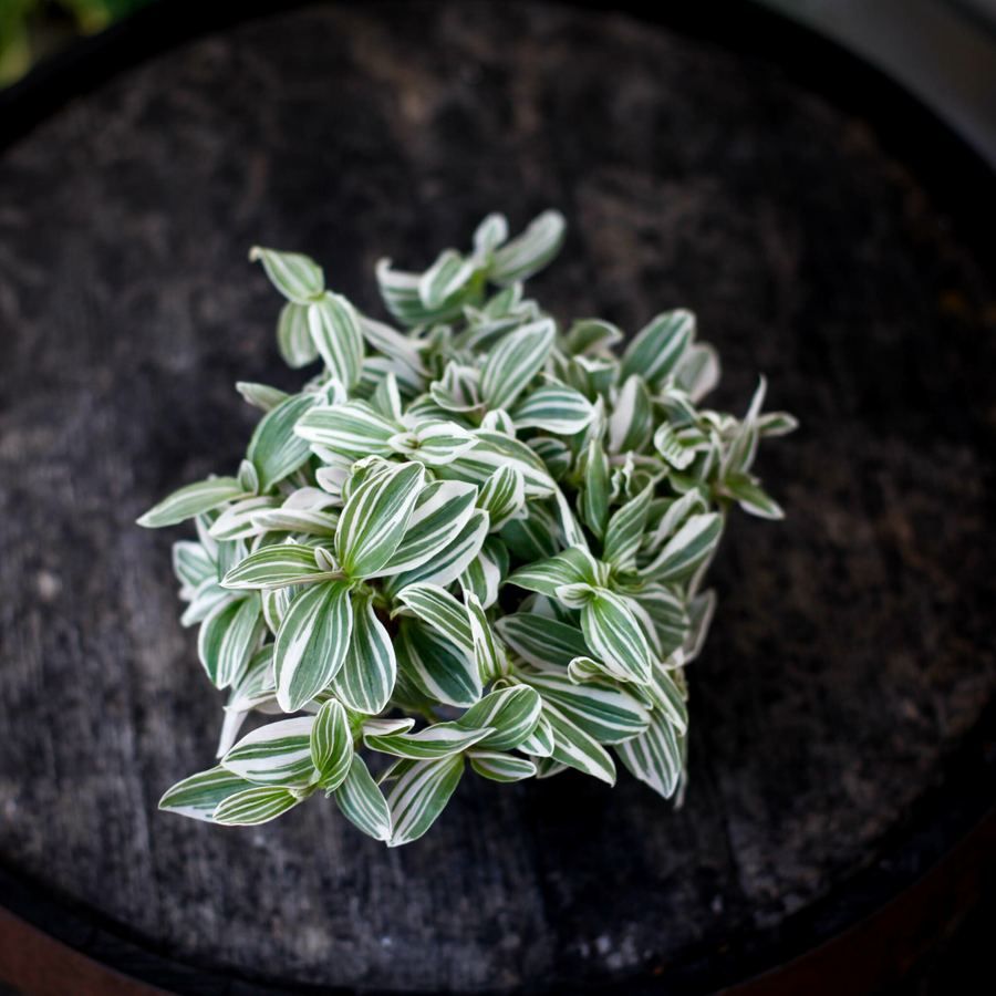 Upptäck den eleganta Tradescantia 'White Cobra' med sina vitstrimmiga blad. Perfekt för indirekt ljus och enkel att föröka.