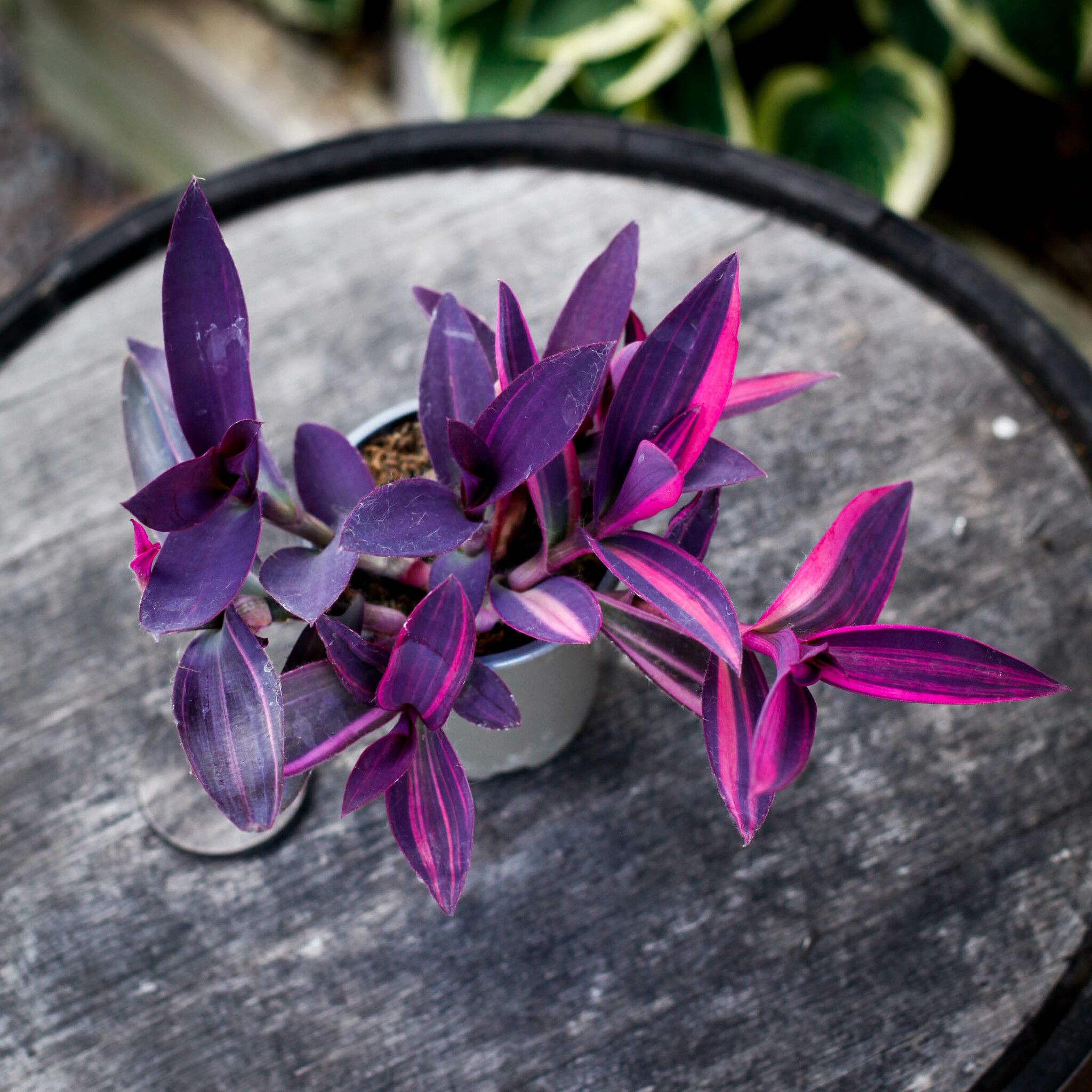 Tradescantia pallida 'Pink Stripe' - En livfull inomhusväxt med mörklila blad och rosa strimmor. Perfekt för ljusa platser. Enkel att sköta och föröka.